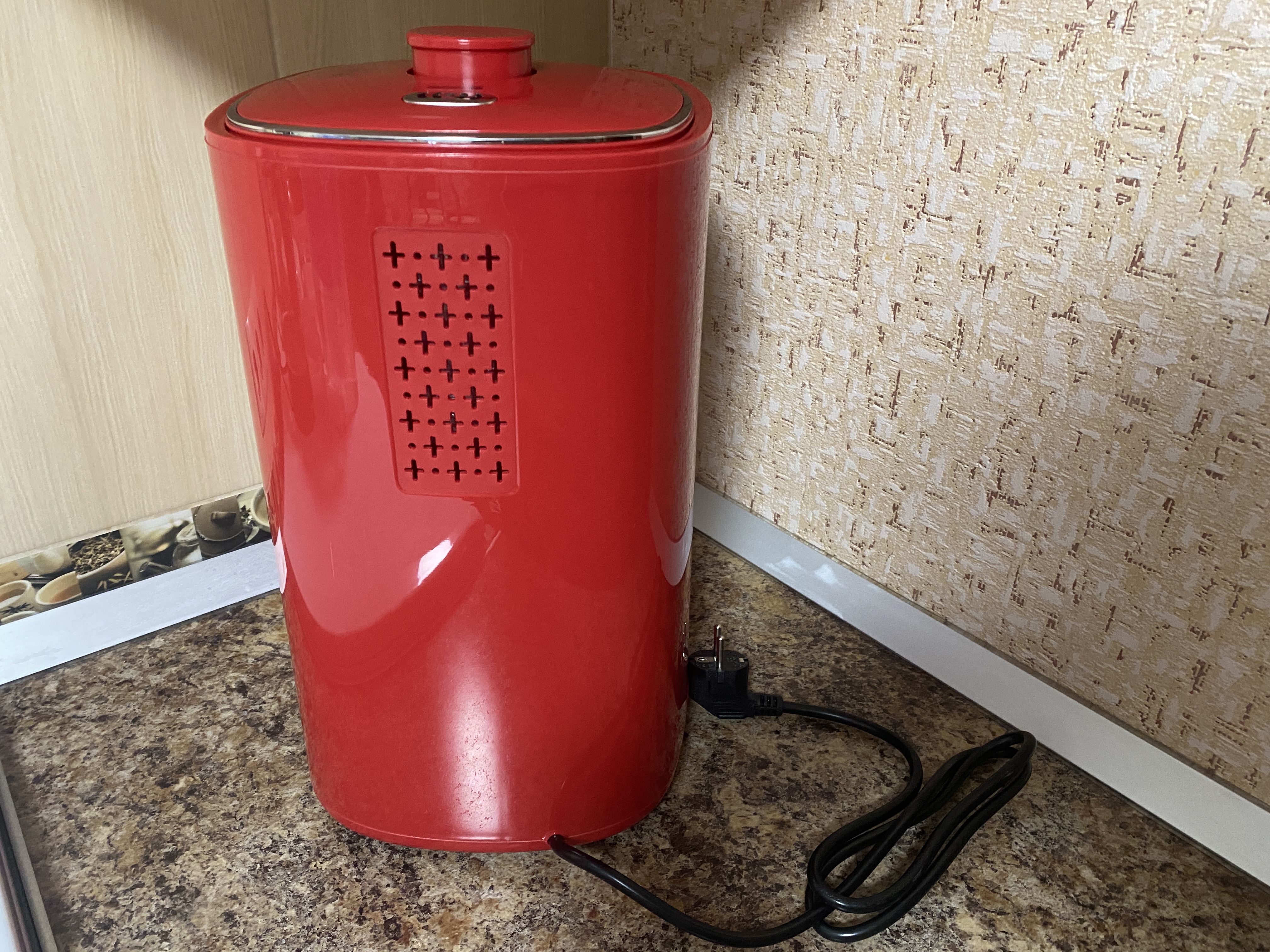 Корпус термопота Harper HTP-5T01 выполнен, в моем случае, в красном цвете, хотя как уже говорилось выше, данная модель имеет весьма богатый выбор цветов, а именно: красный, белый, черный, голубой, оранжевый, бежевый. Корпус имеет глянцевую поверхность и, я думаю, темные цвета будут очень хорошо собирать отпечатки пальцев и других загрязнений. Лицевая часть термопота имеет большой дисплей на котором отображается текущая температура воды, выставленная температура, индикатор включенного режима поддержания температуры, индикатор принудительного охлаждения воды при помощи вентилятора, индикатор отсутствие воды.