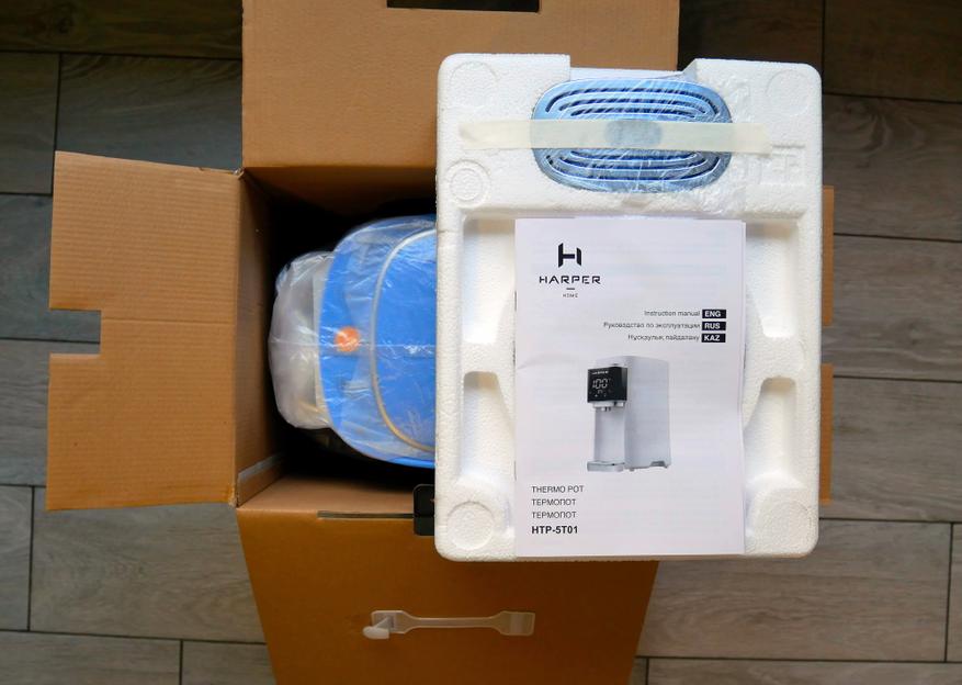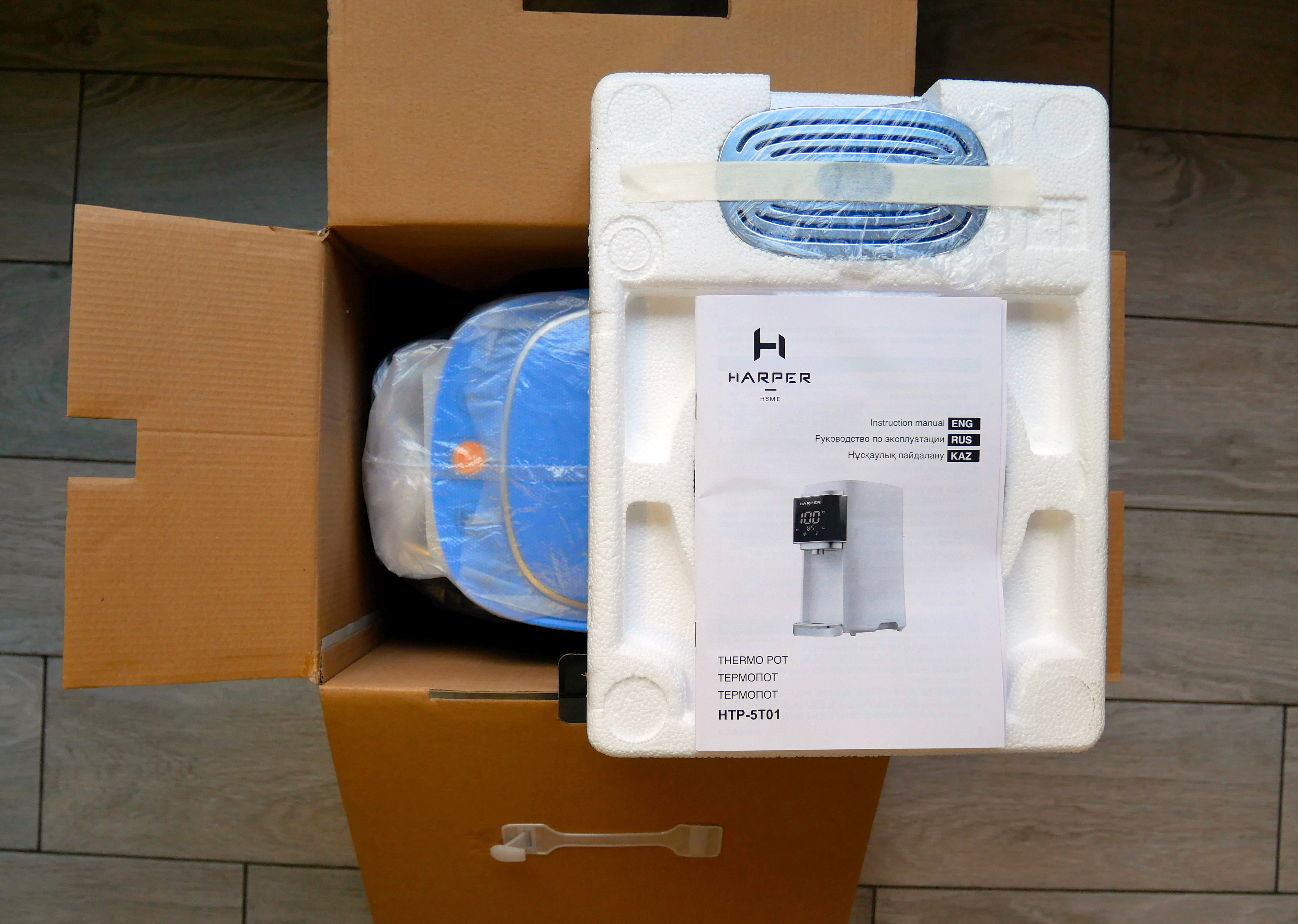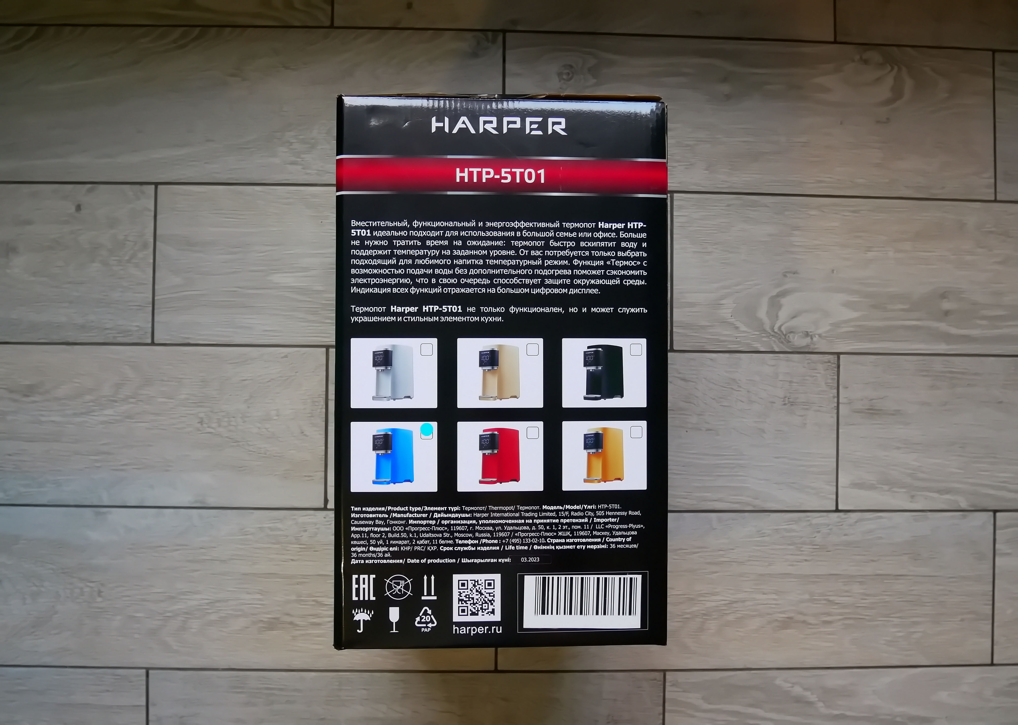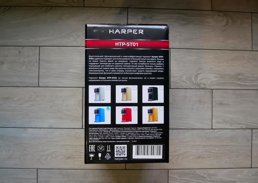 Термопот Harper HTP-5T01 поставляется в средней по размеру упаковке. Два пенопластиковых блока защищают термопот при транспортировке. По бокам упаковки приведены технические характеристики девайса и его особенности. Еще присутствует графическое изображение всех шести возможных цветовых расцветок.