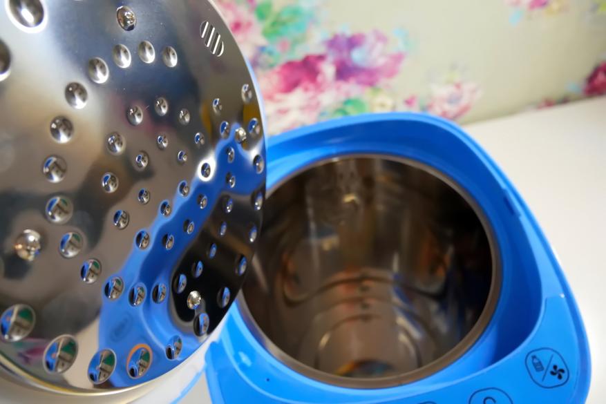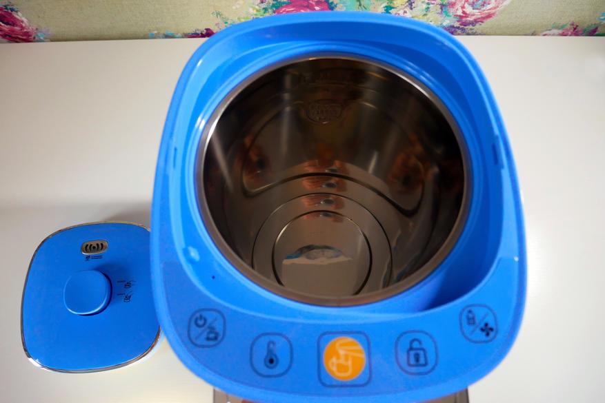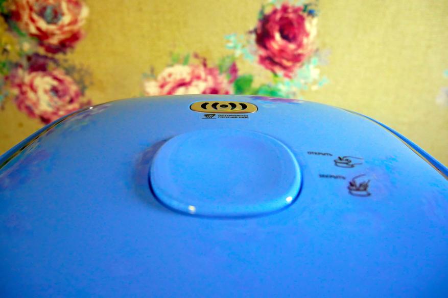 Доступ к внутренней колбе осуществляется через верхнюю крышку. Чтобы открыть крышку нужно нажать на физическую кнопку в ее центральной части. Пружина кнопки отпустит ее механизм наверх и тем самым за кнопку можно браться как за ручку. Крышка полностью снимается с термопота. Это дает пользователю полный доступ к внутренней емкости. Еще рядом с кнопкой расположены отверстия выхода пара, в процессе работы термопота из данных отверстий будет выходить горячий воздух.