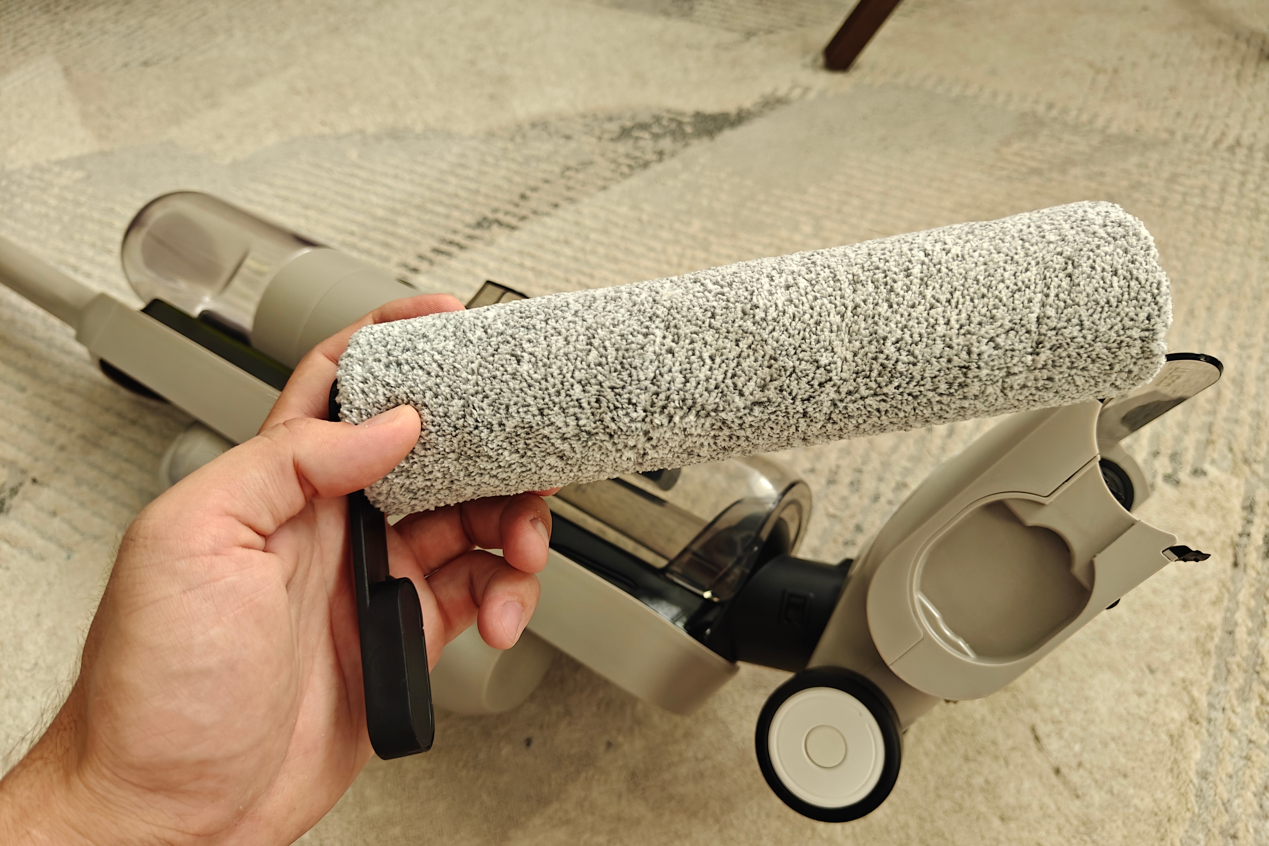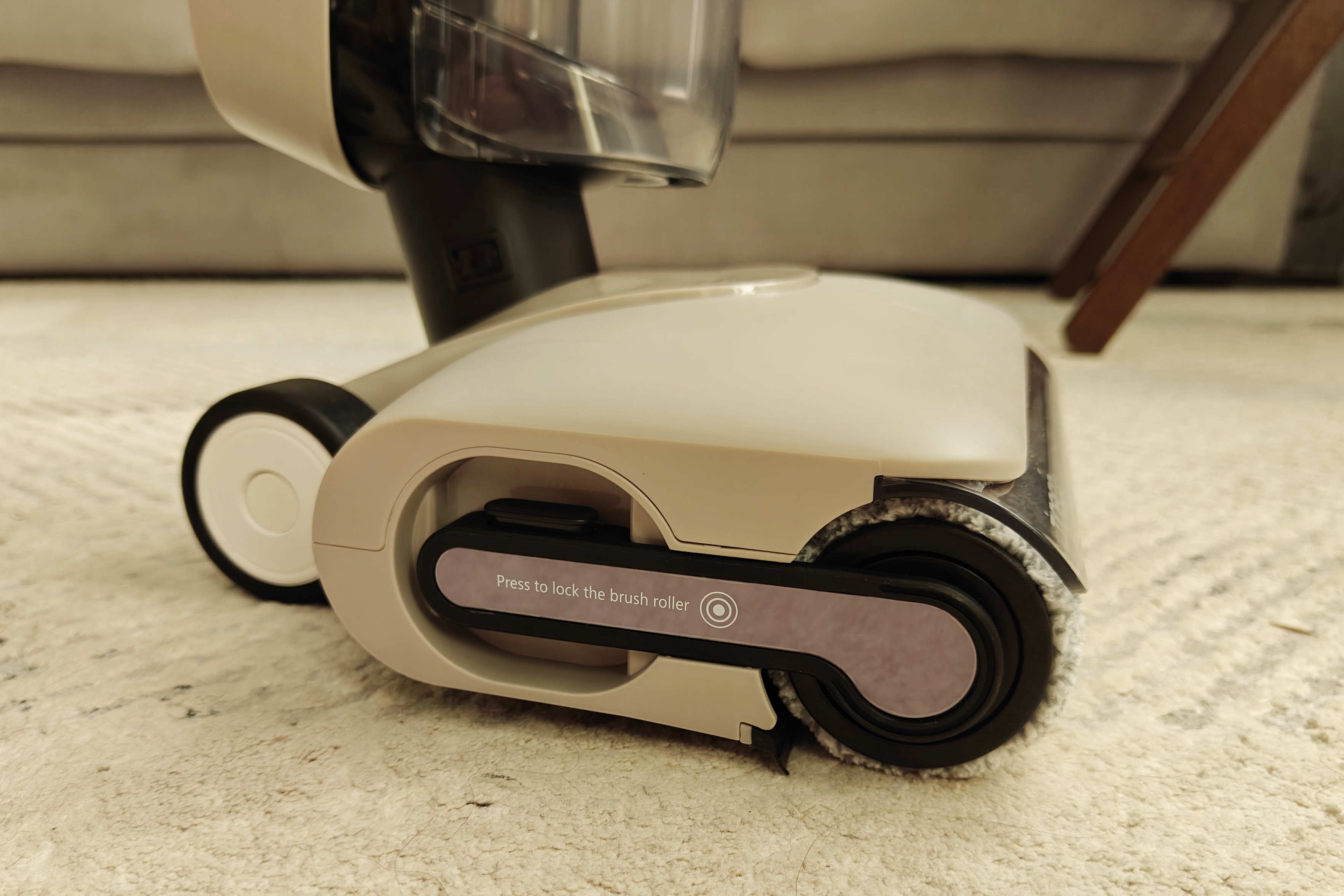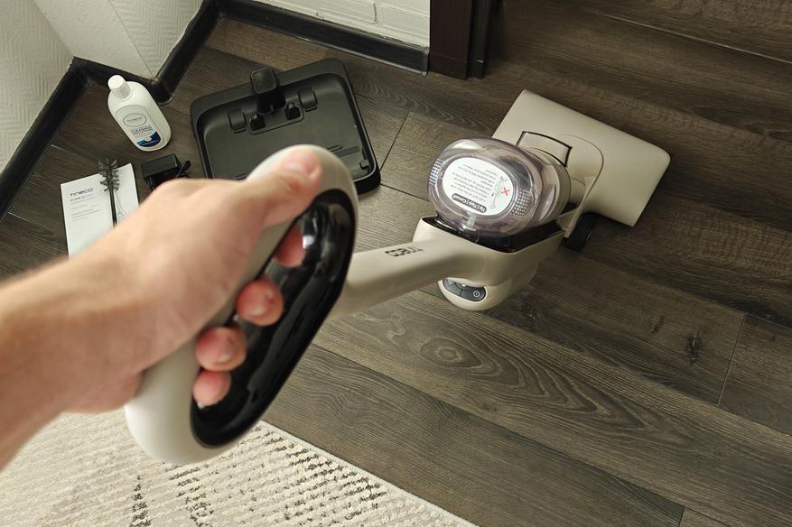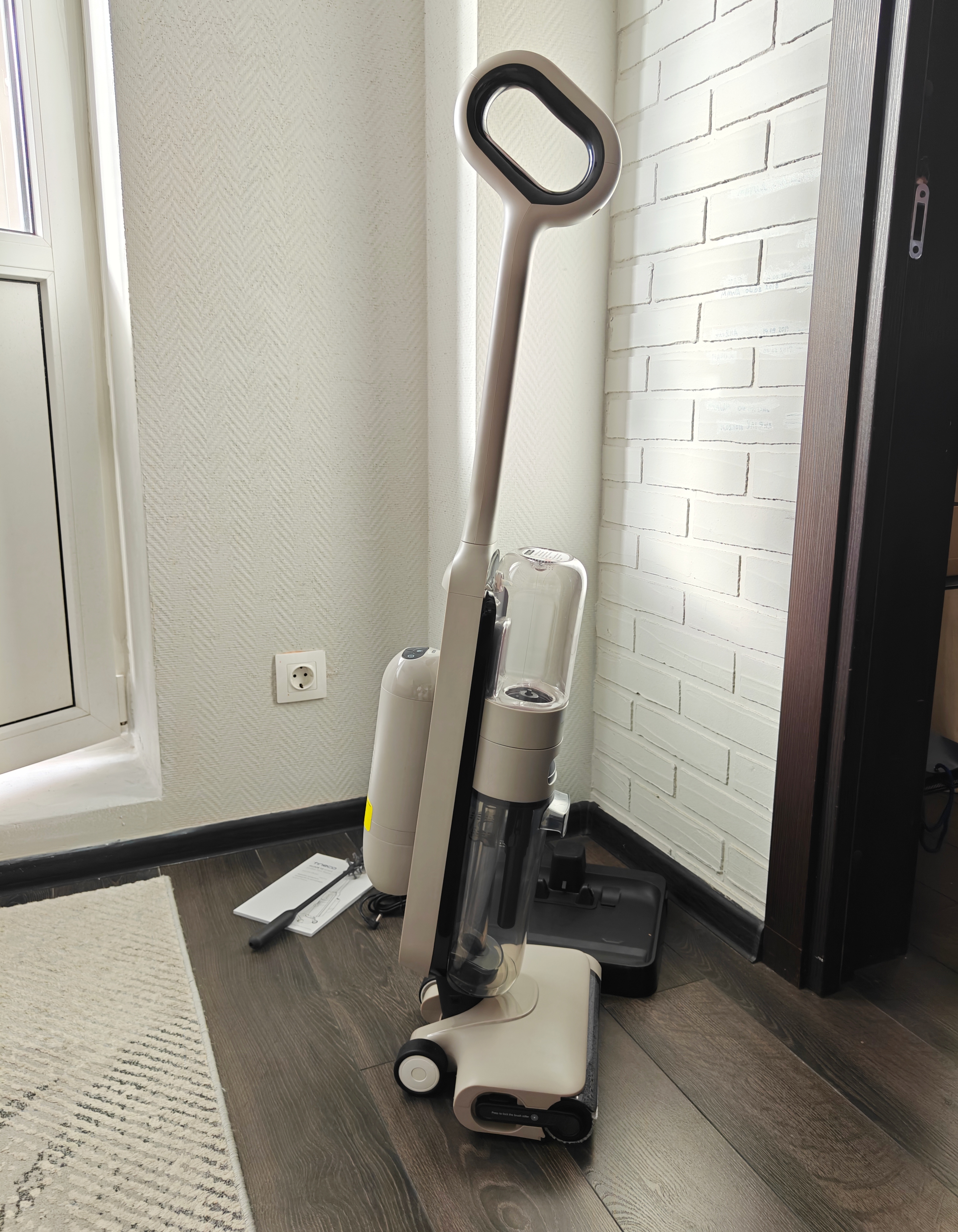 Tineco iFloor Y2 пришел в почти собранном состоянии: нижняя часть с щеткой вообще не снимается, а резервуары для воды уже были вставлены в корпус. Оставалось только присоединить ручку, вошедшую в паз с характерным щелчком. Пылесос готов к работе.