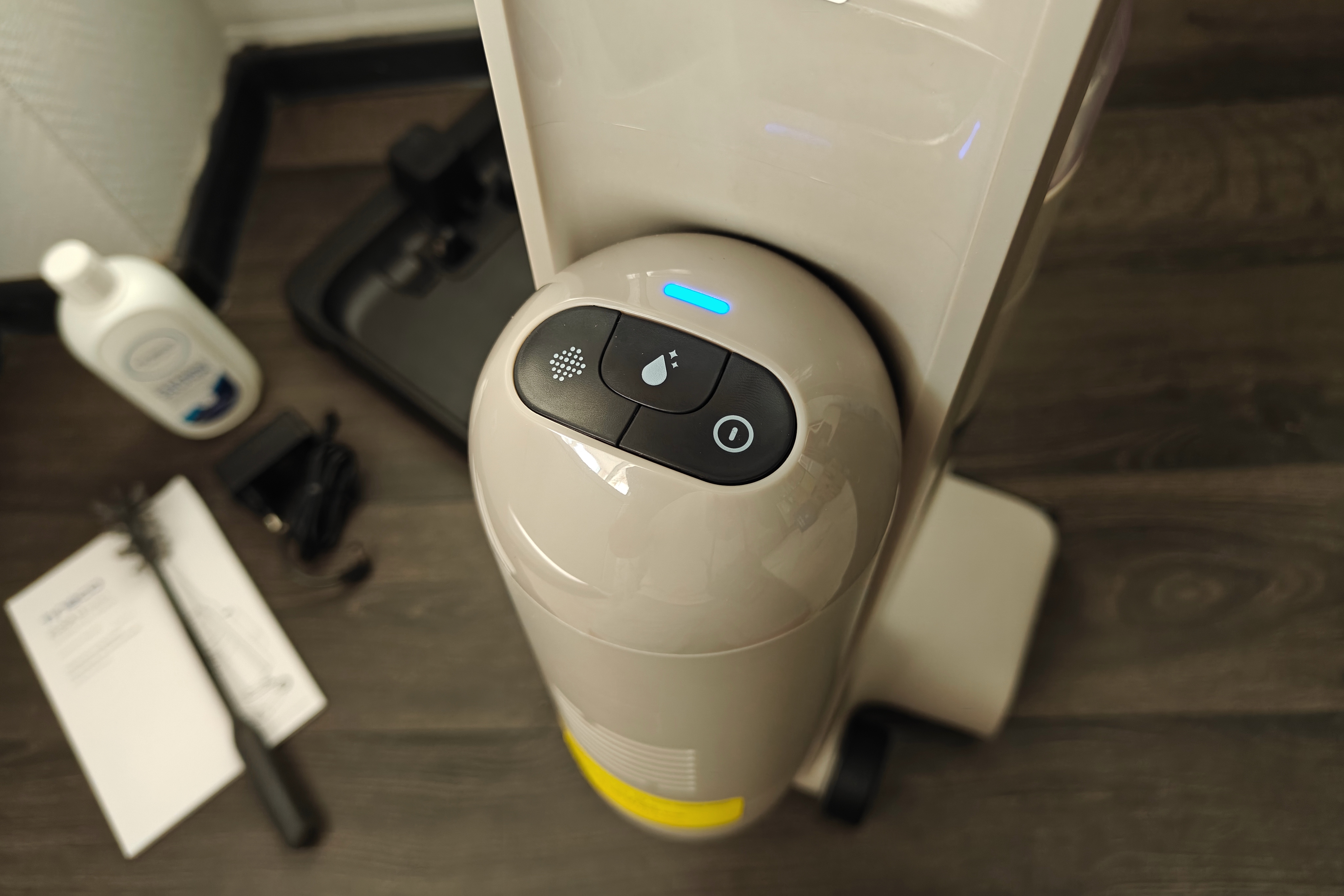 Tineco iFloor Y2 создан для уборки. Наворотов, вроде автоматических режимов, датчиков загрязнения или голосового помощника, как в более дорогих моделях, здесь нет. Дисплей тоже не предусмотрен: об уровне заряда и необходимости очистки бака или фильтра сообщает только светодиодный индикатор на корпусе, меняющий цвета в зависимости от состояния пылесоса.