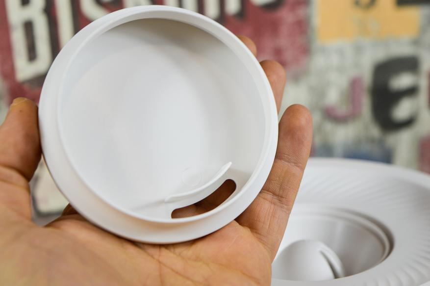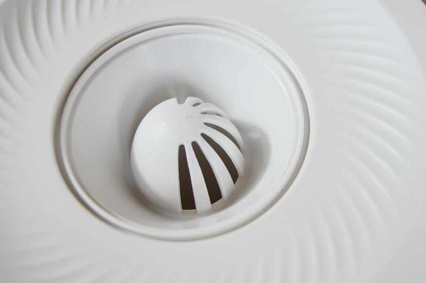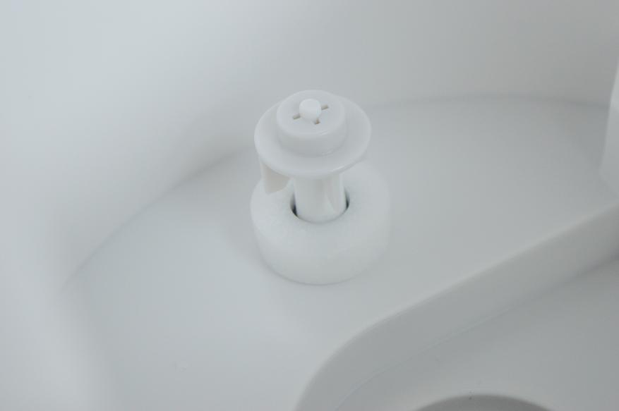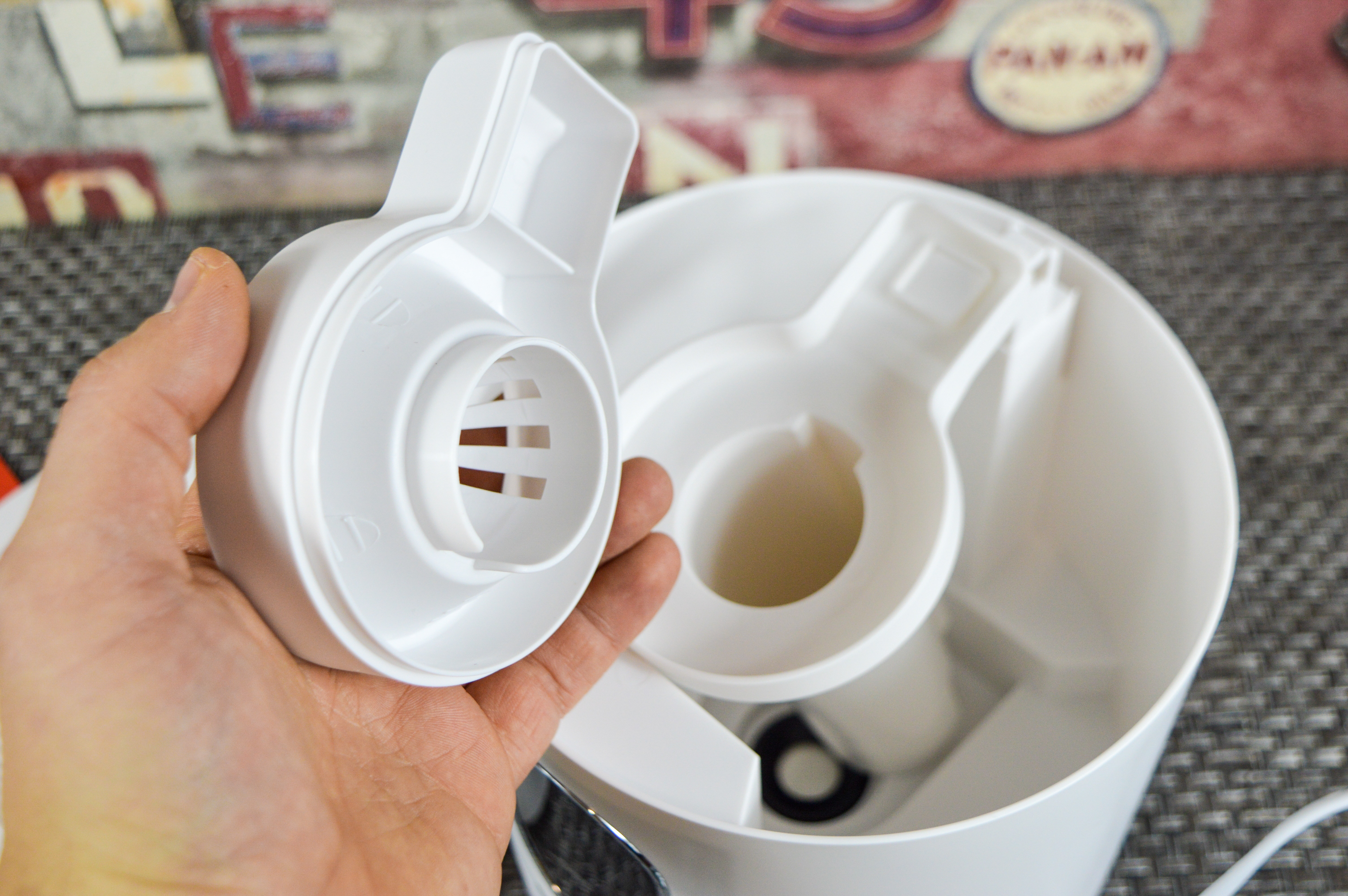 В верхней части расположилась съемная крышка с возможность регулировки направления подачи пара. Под ней установлена импровизированная решетка, защищающая от перелива и образования брызг. Все части изготовлены из качественного пластика без постороннего запаха. Приятно удивило, что корпус полностью разбирается на отдельные элементы это упрощает обслуживание и чистку. Также стоит учитывать, что добавление воды осуществляется через верх.