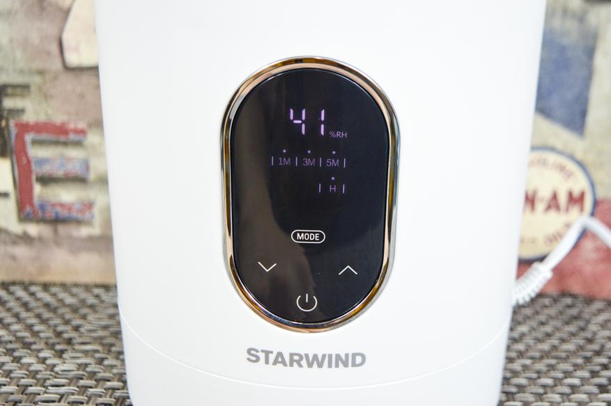 У увлажнителя воздуха Starwind SHC2325 более продвинутое и продуманное управление с возможностью настройки подачи пара и установки таймера. В верхней части экрана выводится уровень влажности, поэтому дополнительных приборов контроля задействовать не придется. Вся информация выводится на информационный дисплей, а для настройки применяется 4 сенсорных кнопки.