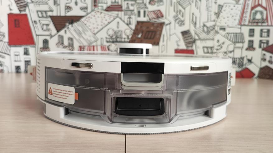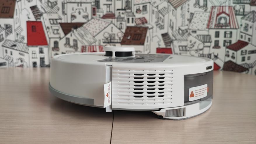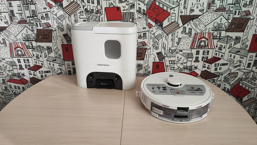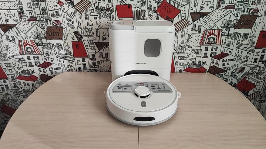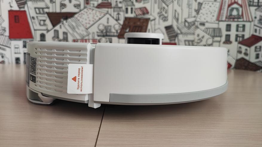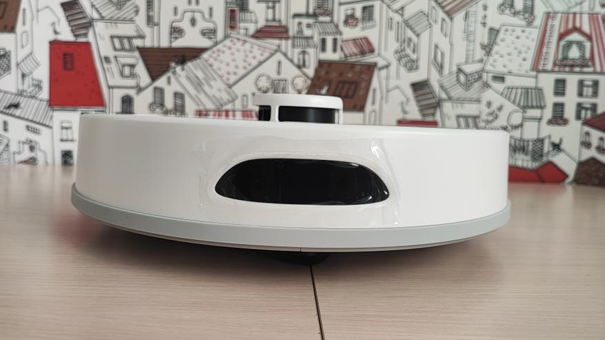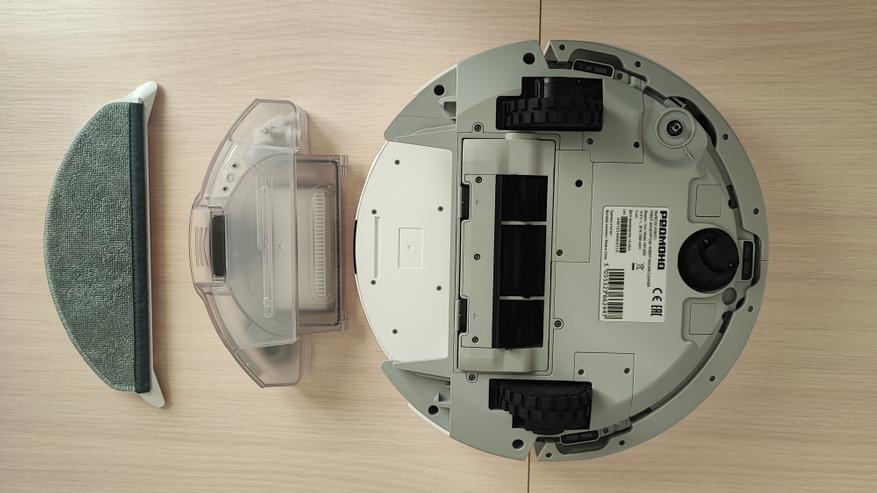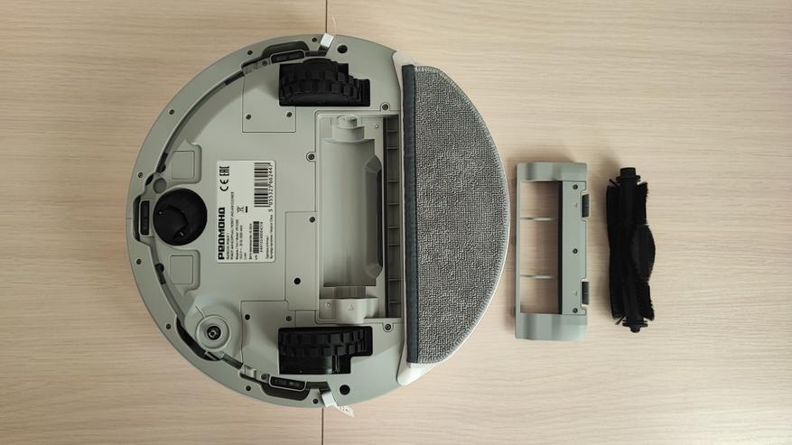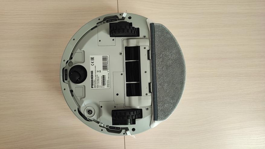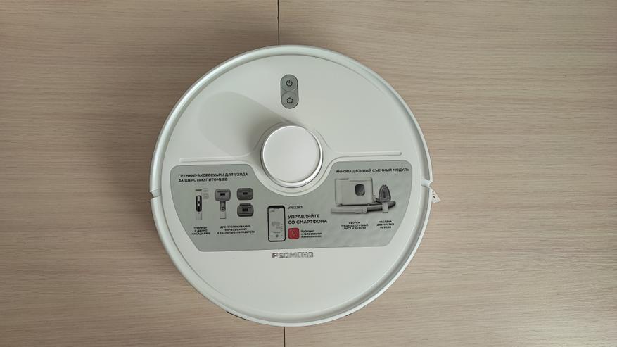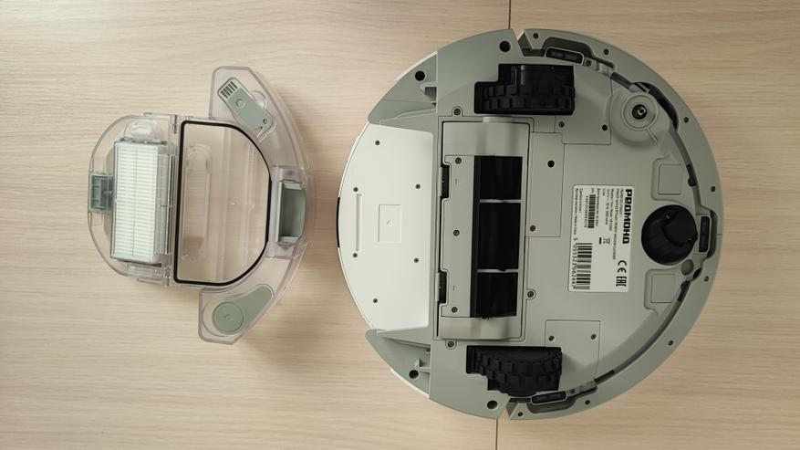 Наш робот имеет привлекательный современный вид. Корпус сделан из матового пластика. На верхней поверхности находятся 2 кнопки. Одна из них предназначена для включения/выключения пылесоса, а вторая для отправки его на док-станцию. Пылесос заряжается на станции с помощью контактов, которые расположены на задней части корпуса. На передней части корпуса находится двигающийся бампер, являющийся одновременно детектором столкновений. Сверху корпуса находится лидар, который позволяет ориентироваться в пространстве, объезжать препятствия и составлять план помещения. Если устройство перевернуть, то можно увидеть: 2 колеса и 1 боковую щетку, а по центру расположена щетка с ламелями и подметалками. Щетка достаточно плотно прилегает к полу и довольно быстро крутится, что позволяет эффективно собирать даже крупный мусор.