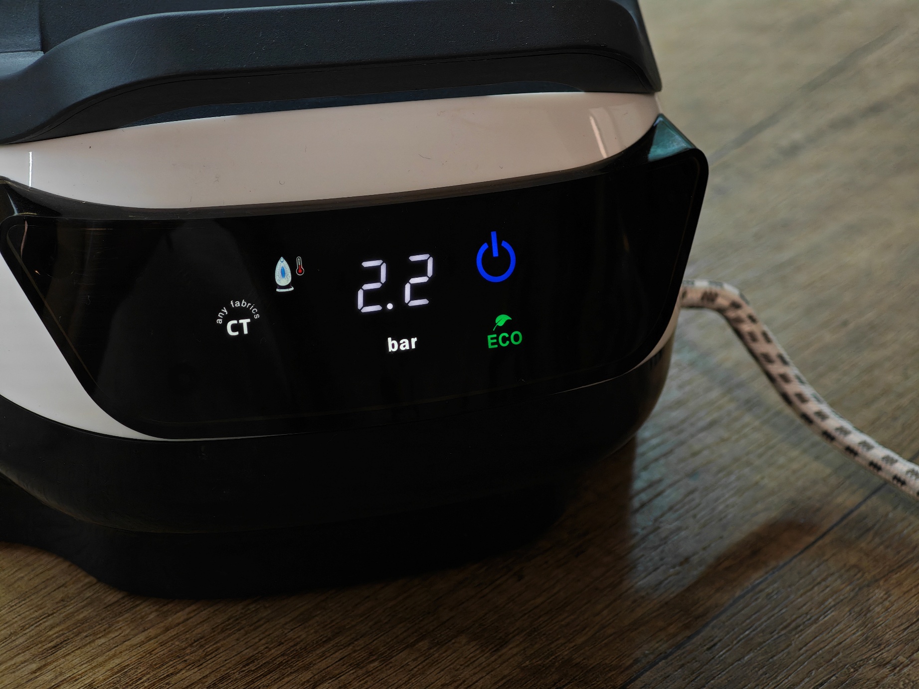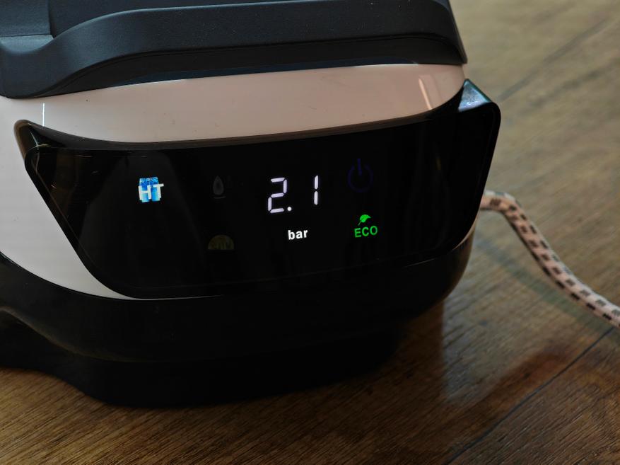 Корпус базы предусматривает панель с индикаторами и сенсорными кнопками. Здесь можно выбрать режим для работы (CT/HT/Шелк), а также активировать энергосберегающую настройку (Эко): непрерывная подача пара (СТ), которая удобна в случае, если предстоит перегладить много вещей. Если выбрать НТ, то будет обеспечиваться для грубых тканей (выше t°C/давление). С деликатными тканями (шелк, синтетика) можно работать, переключив в «Шелк». Режим Эко позволяет работать с уменьшенным потреблением для экономии электроэнергии.