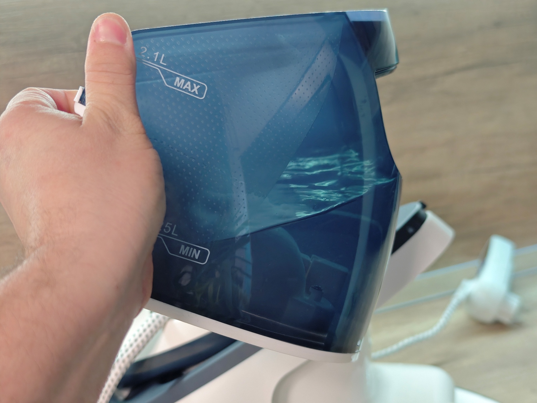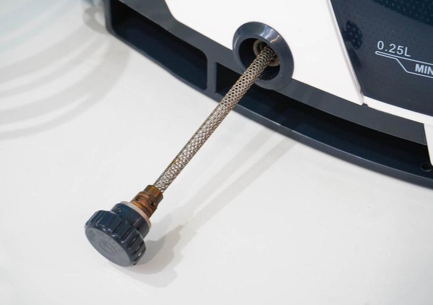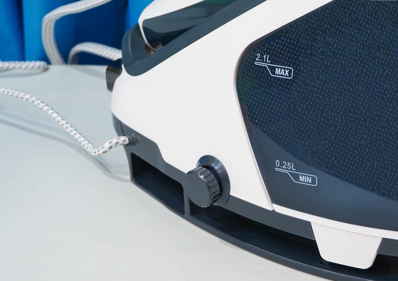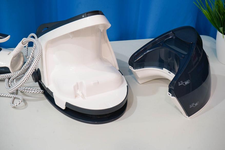 Как я уже говорил, одним из преимуществ данного парогенератора является вместительный резервуар. Выполнен он в виде съемного контейнера, а полупрозачный корпус позволяет контролировать уровень воды визуально. Имеются отметки минимального и максимального уровня для воды: максимально вмещается 2100 миллилитров чистой воды.