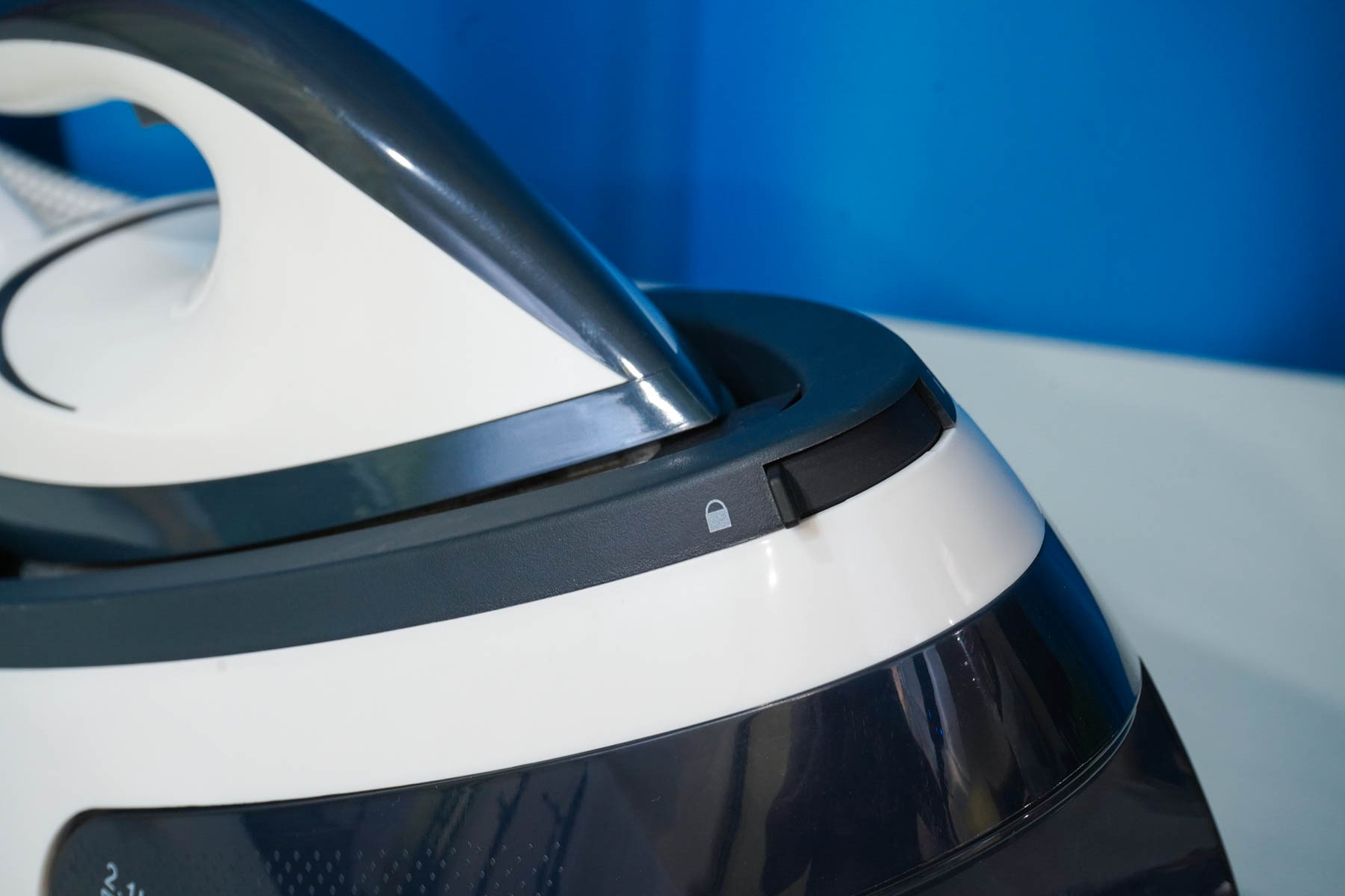 Для удобства хранения предусмотрен фиксатор «носика» утюга — небольшой переключатель перемещается в паз «юбки» утюга и закрепляет его таким образом, что за ручку утюга можно перемещать всю станцию.