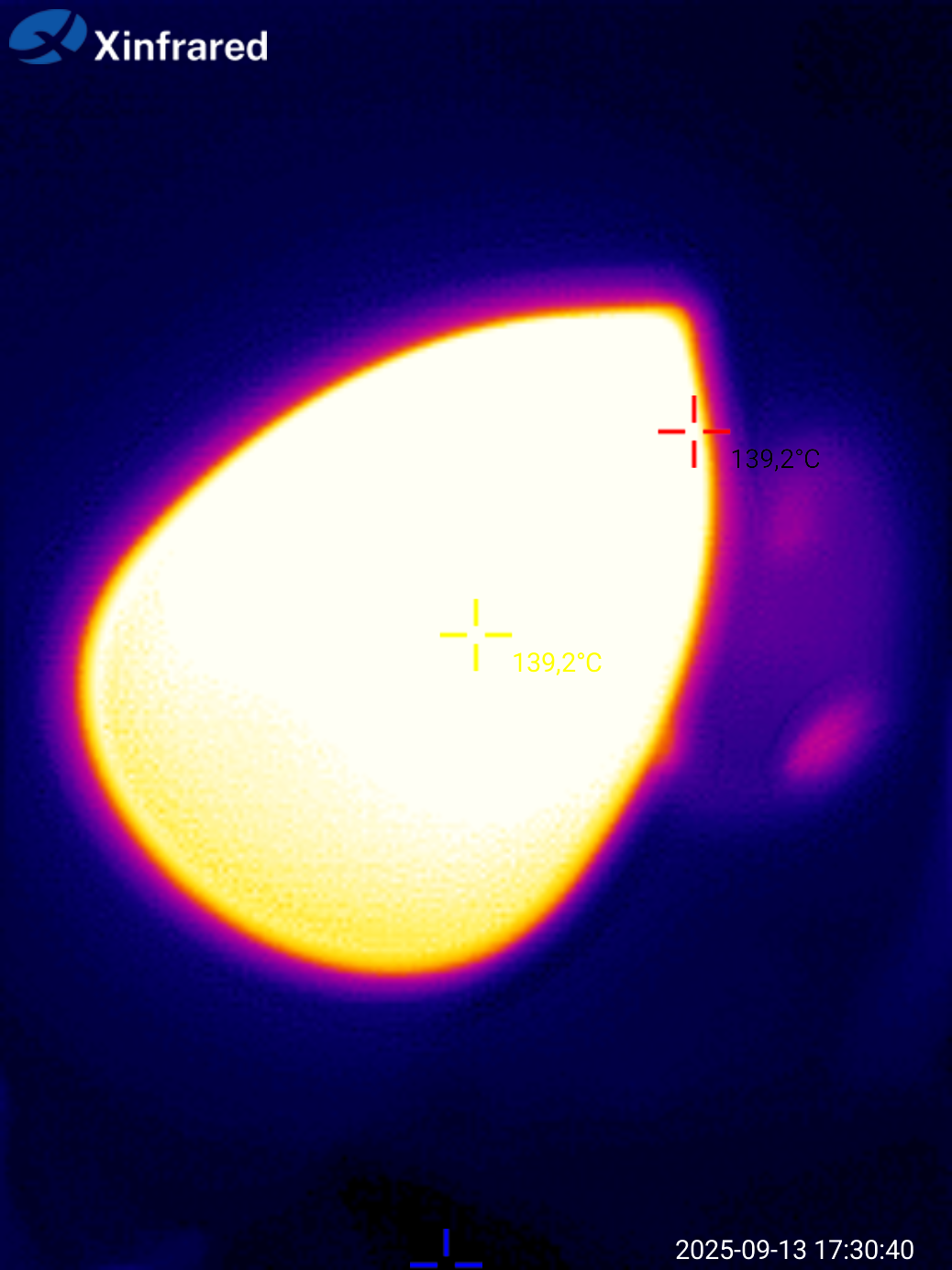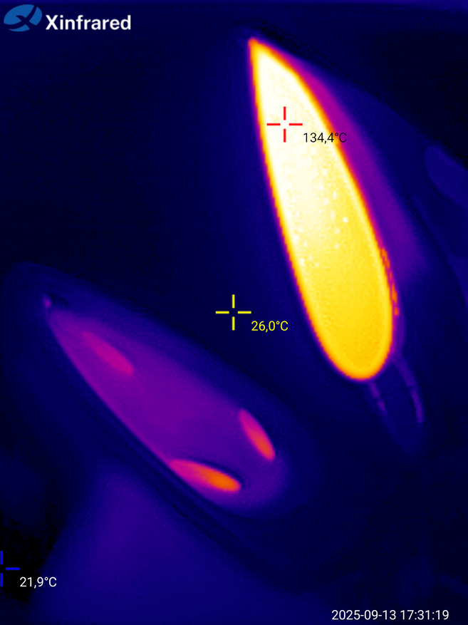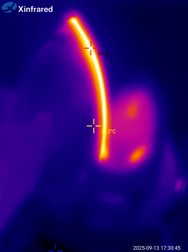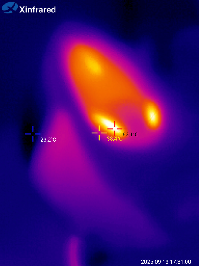 Оценка распределения температуры с помощью тепловизора Infrared дает ожидаемую «картину»: корпус и ручка утюга изолирована и не нагревается, «подошва» имеет равномерный прогрев. Верхняя часть станции, где «паркуется» сам утюг, слегка нагрета и имеет термостойкие упоры.