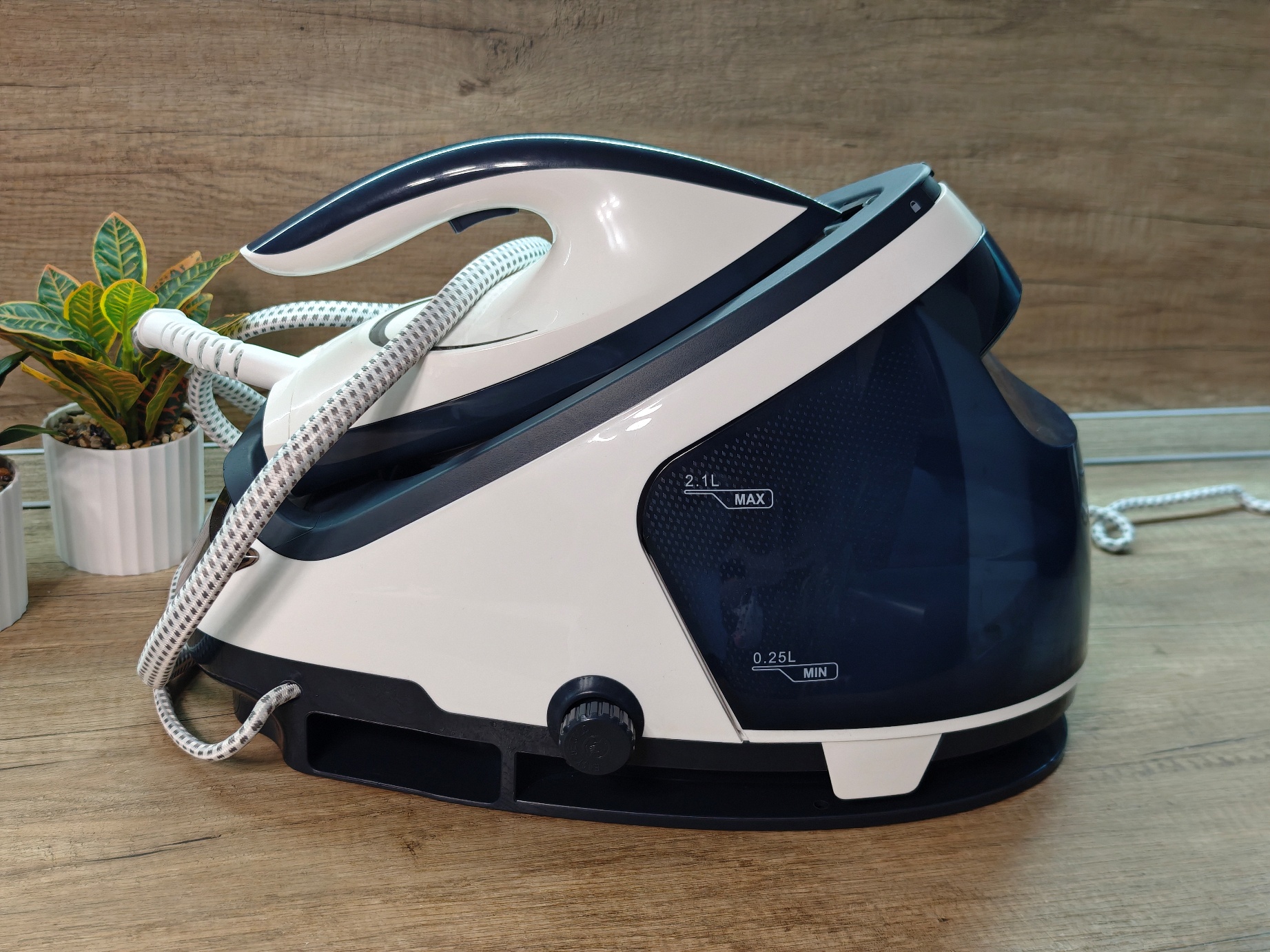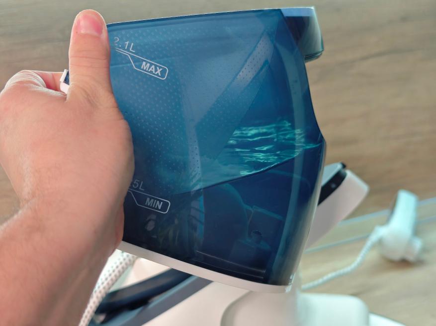 - Не потребуется постоянно подливать воду, как было с электроутюгами. Благодаря отдельной станции с большим резервуаром воды (до 2.1 литра) процесс глажки не прерывается на доливку. Я пробовал израсходовать весь резервуар, за один раз, но так и не смог.