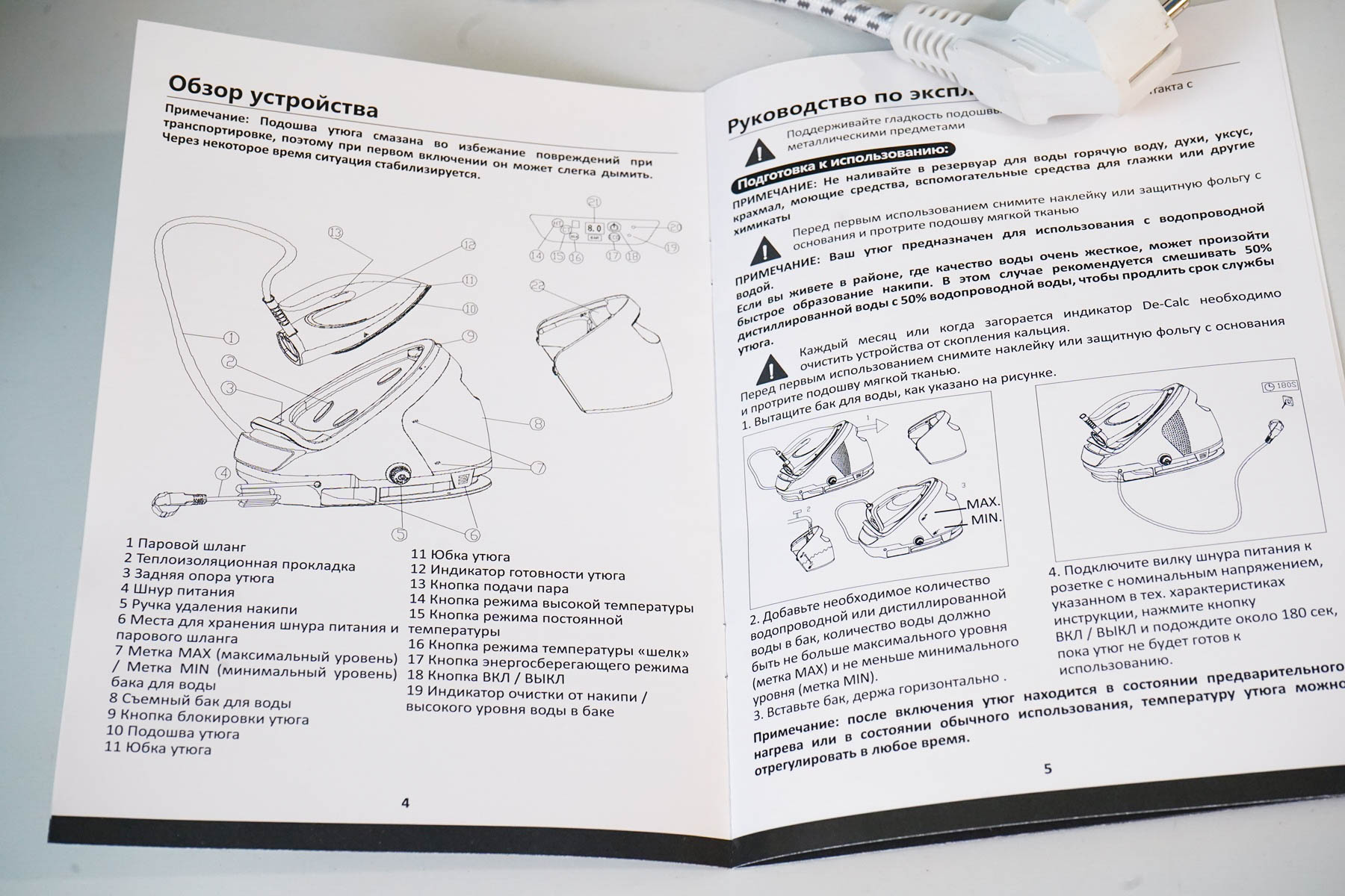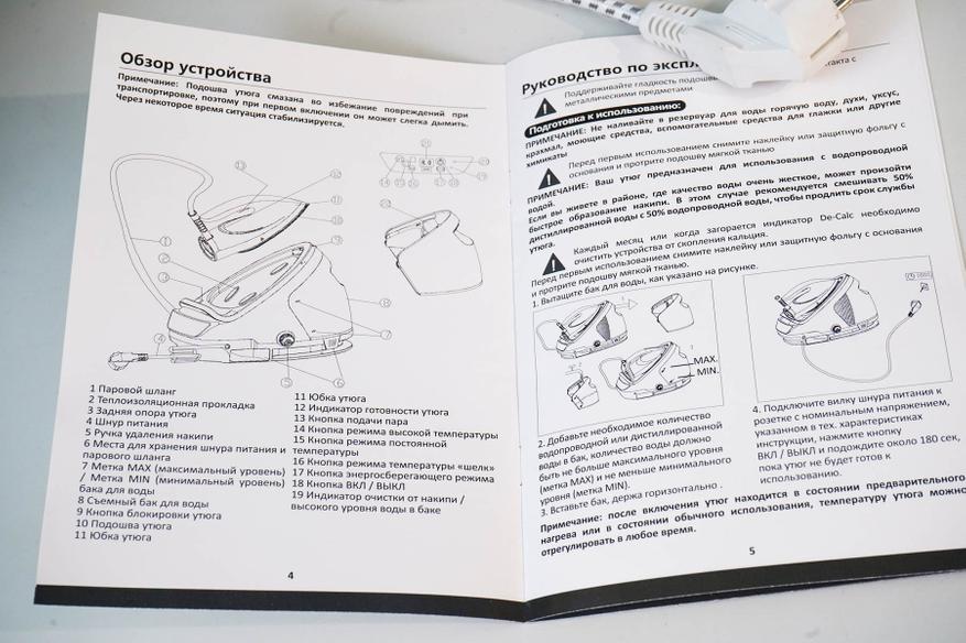 В комплекте идет сам утюг, станция-парогенератор, инструкция (на русском языке), мерный стаканчик. В инструкции довольно подробно приводится и обзор аппарата, его органы управления, рекомендации по очистке и общие рекомендации по эксплуатации. Имеет смысл ознакомиться перед первым использованием.