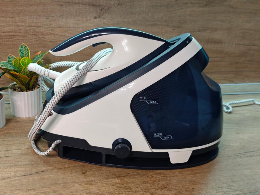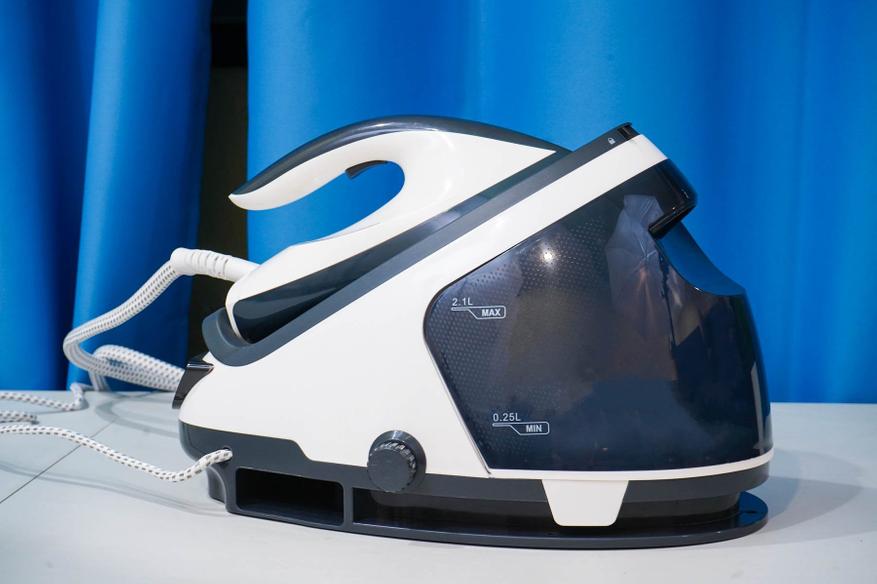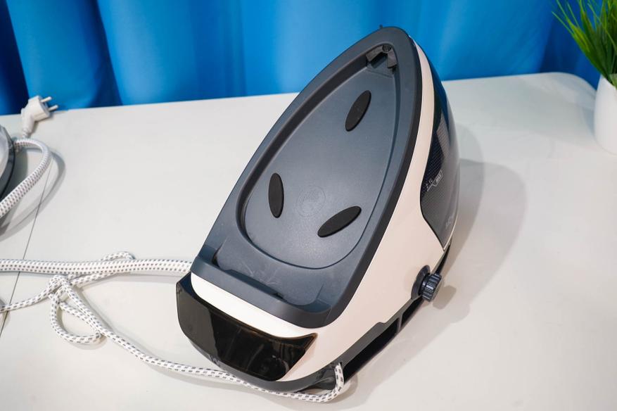 Что касается самой станции-парогенератора, то тут достаточно все интересно. Во-первых, в станции размещается система для нагрева и генерации пара, контроллер с дисплеем и резервуар для воды. Во-вторых, станция является базой для хранения самого утюга — поверхность станции выполнена с термостойким покрытием, позволяющим устанавливать горячий утюг.