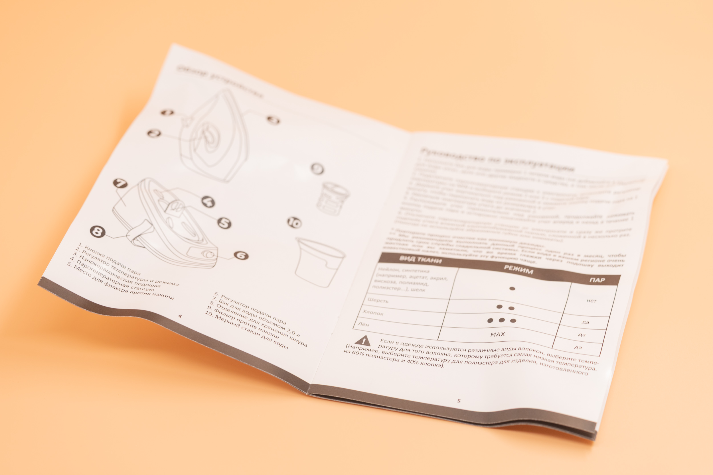 Комплект состоит из трех основных элементов: базовая станция с водяным баком, утюг и комплект документации, включающий инструкцию с информацией, куда обращаться в случае поломки.