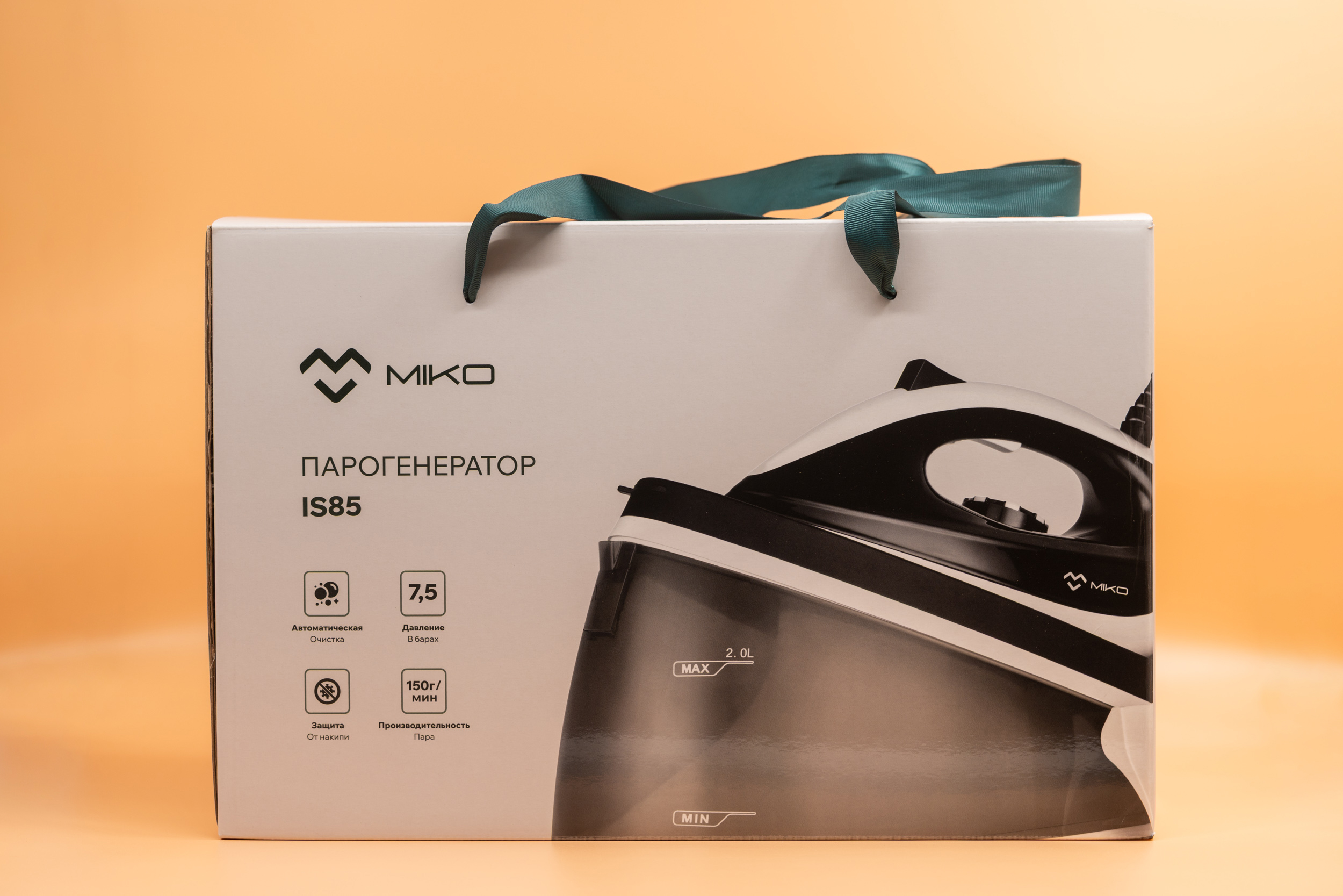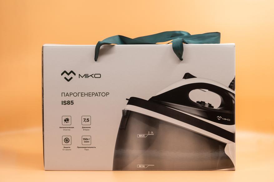Утюг-парогенератор IS85 от компании MIKO прибывает к покупателю в стильной коробке белого цвета с зелеными тканевыми ручками. Дизайн упаковки сразу дает понять, что внутри — серьезный прибор: на лицевой стороне красуется крупное изображение самого парогенератора, а на остальных поверхностях лаконично перечислены его ключевые преимущества и технические характеристики.