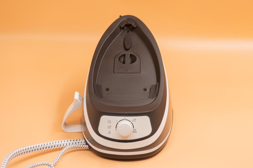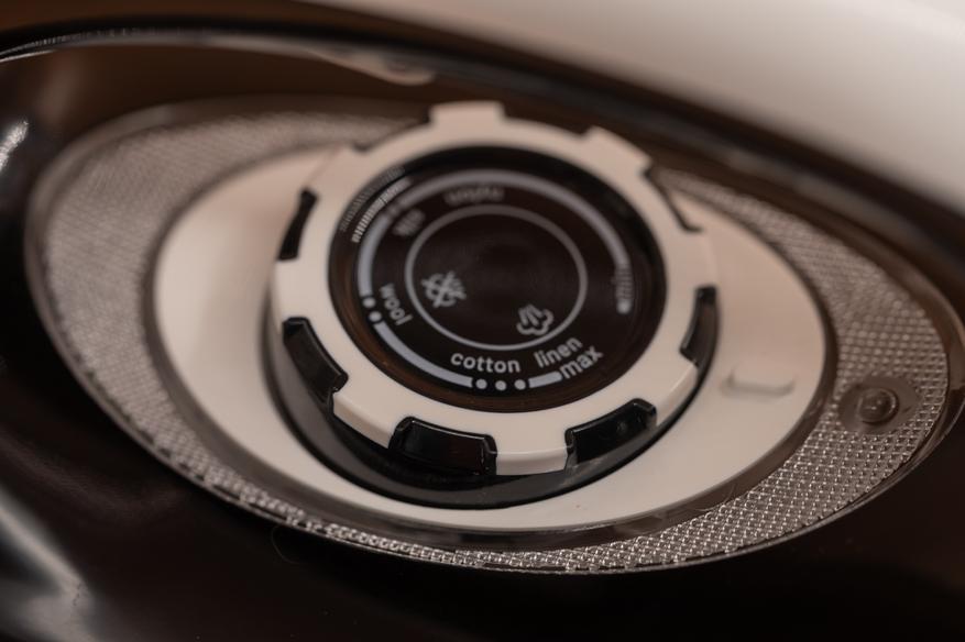 Регулировка температуры выполняется круглым переключателем, установленным под рукояткой. Переключатель обеспечивает плавное вращение с фиксацией в позициях (щелчки), однако обладает высокой чувствительностью, что может вызвать непреднамеренное переключение. Предусмотрено несколько температурных режимов для различных материалов: Синтетика (без пара), Шелк, Хлопок, Лён. Режимы Хлопок и Лён обеспечивают максимальную мощность пара с функцией парового удара.