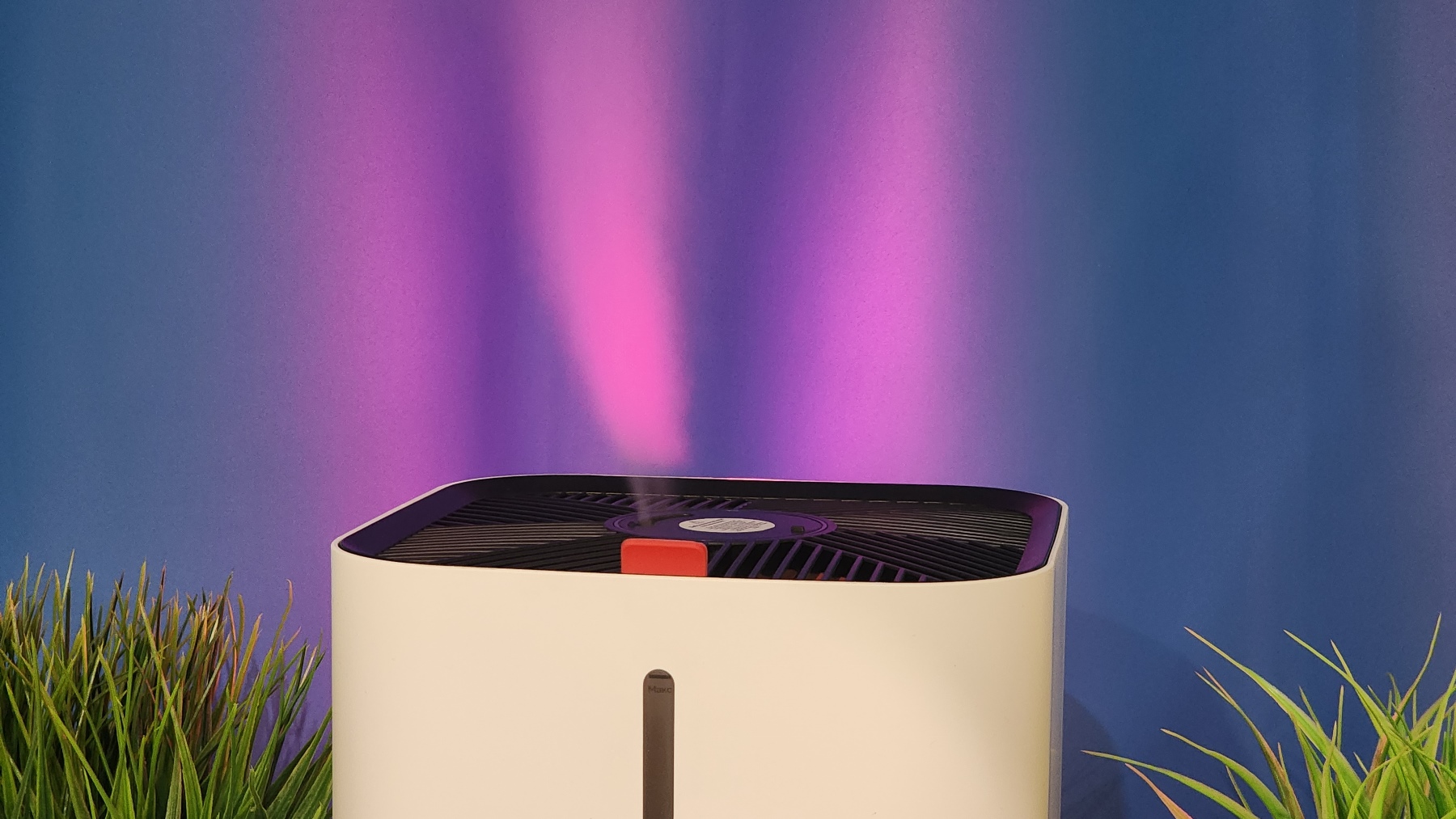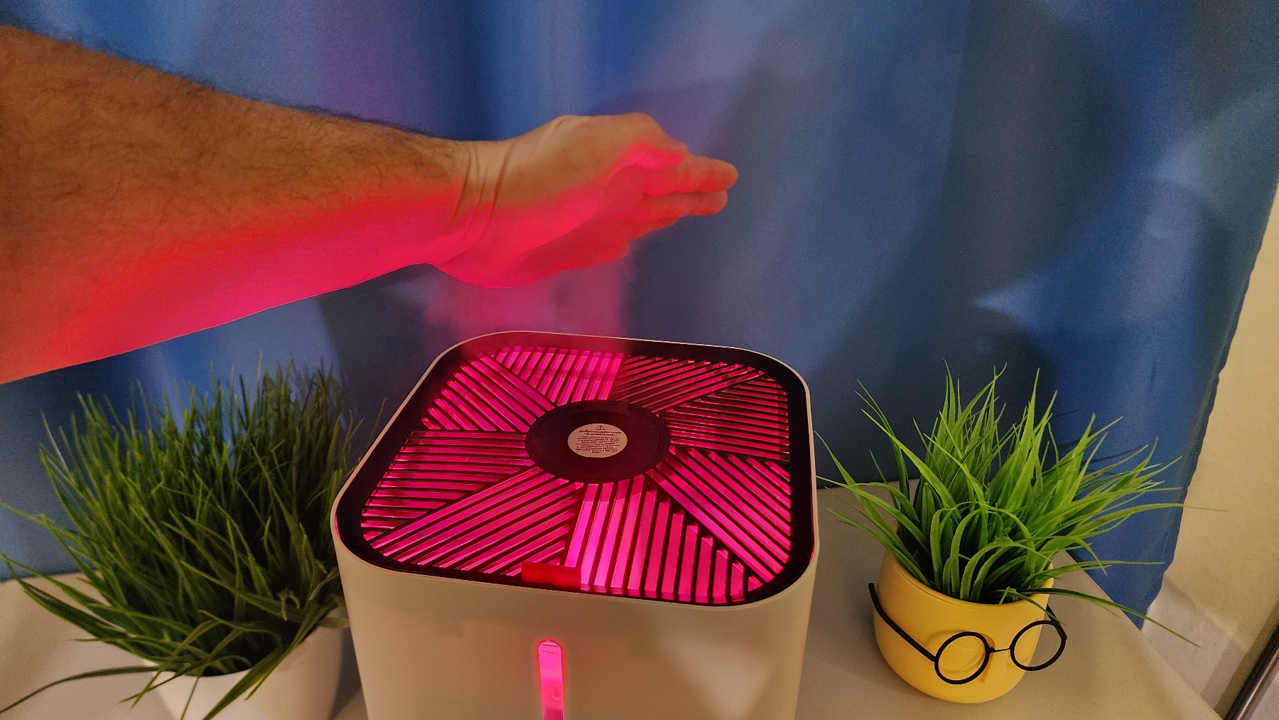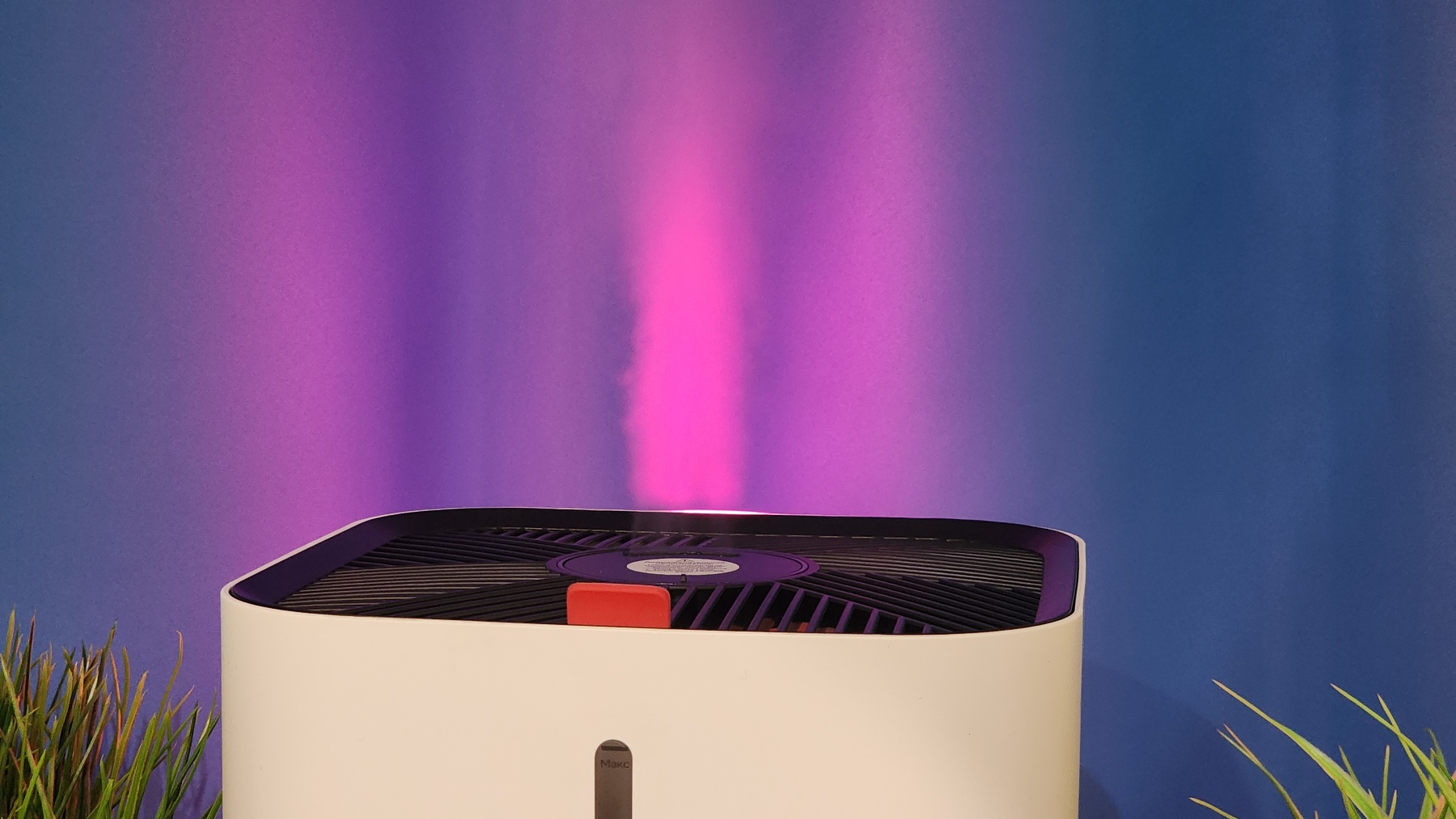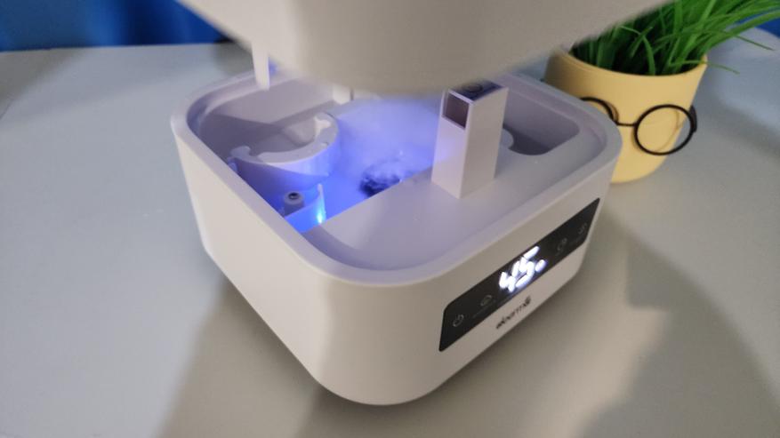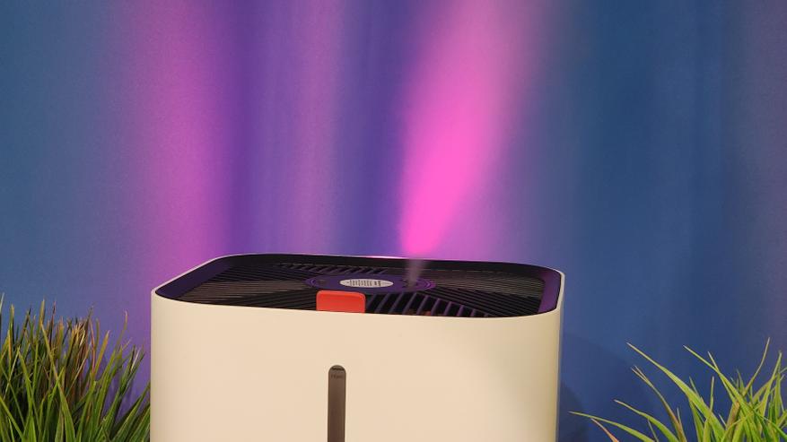 Широкий диффузор практически полностью рассеивает пар. Здесь нет концентрированной струи влаги, как в дешевых моделях. Еще и можно выбрать ориентацию центрального диффузора — слегка отклоняется поток в сторону, обеспечивая циркуляцию и перемешивание влаги в помещении. Я подсветил поток воздуха цветной лампой, чтобы это было видно наглядно. Самой функции подсветки в устройстве, к сожалению, нет.