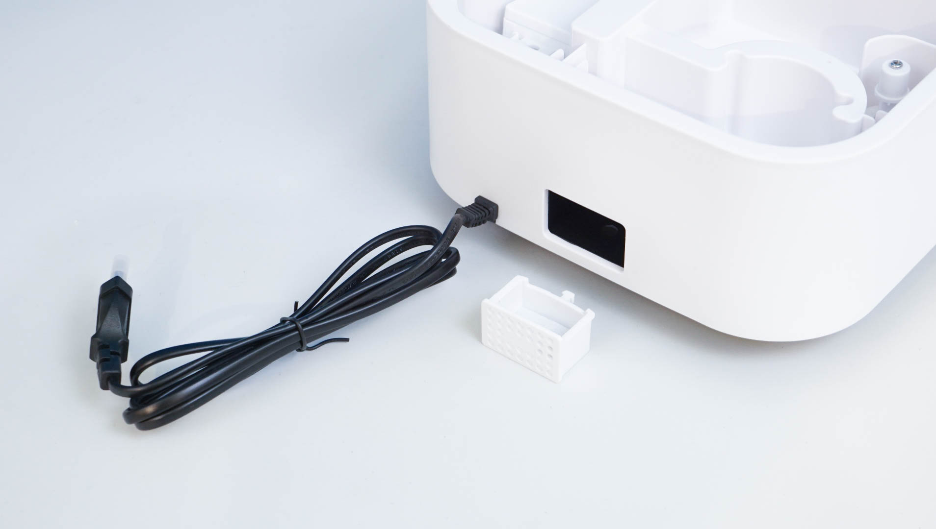 В центре поддона размещается ультразвуковой модуль. Как заявляет производитель, в этой модели модуль на 30 Вт — довольно мощный для подобных устройств (у меня в УЗ-ванне для чистки деталей стоит модуль на 50 Вт). Конструкция поддона сложная — вода подается равномерным потоком, без перелива уровня. Есть поплавковый датчик: если вода закончилась, устройство просто выключится. УЗ-модуль можно осматривать: иногда, при использовании неочищенной воды, на его поверхности могут оставаться частички мусора или частиц.