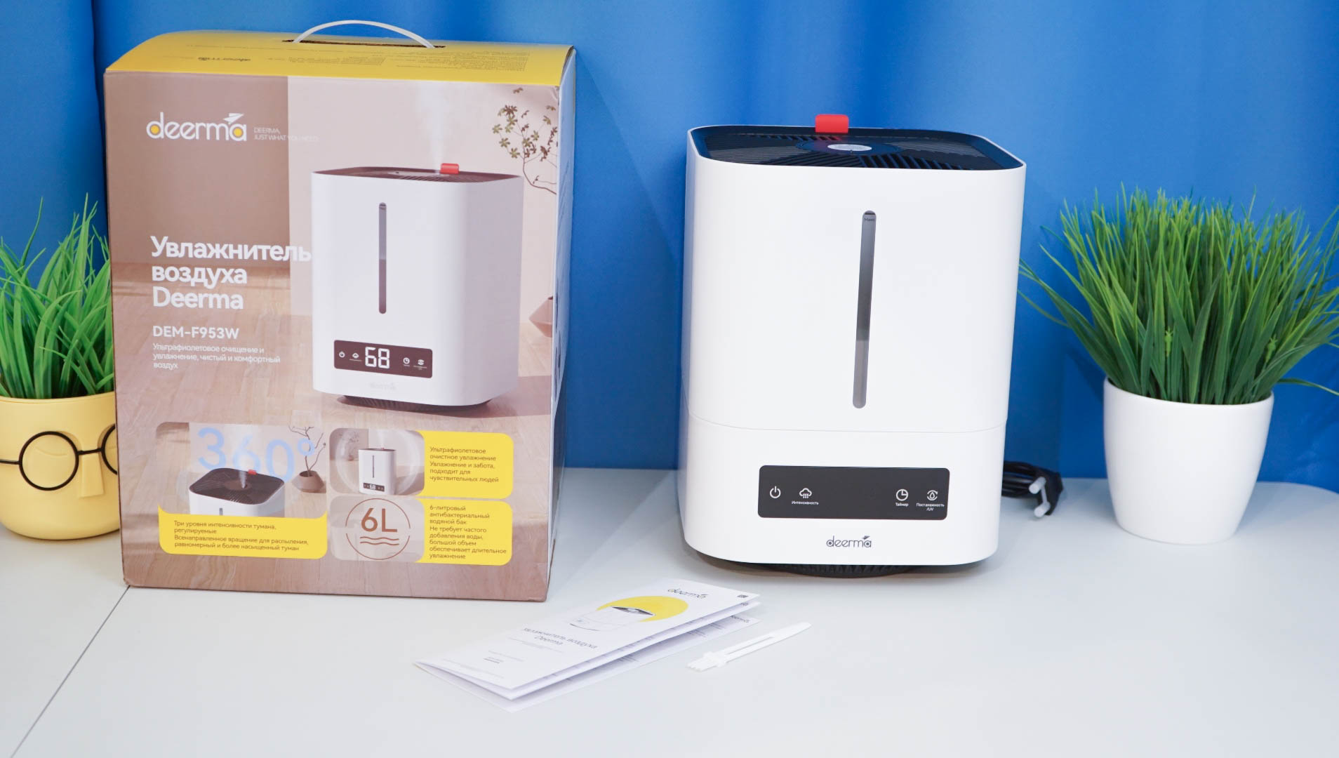 Чрезмерная сухость воздуха негативно влияет не только на человека, но и на домашние растения. Недостаток влаги может привести к замедлению их роста и даже гибели. Кроме того, сухой воздух способен ускорить износ деревянной мебели и напольных покрытий. Но и чрезмерное увлажнение также может быть вредным. Избыток влаги способствует развитию плесени и грибка. Поэтому я выбрал модель увлажнителя воздуха F953W от бренда DEERMA со встроенным гигрометром для контроля уровня влажности в помещении. Это недорогая модель с 6-литровым резервуаром, с возможностью установить таймер и нужный уровень влажности. В комплекте есть инструмент для очистки и русскоязычная инструкция с описанием возможностей.