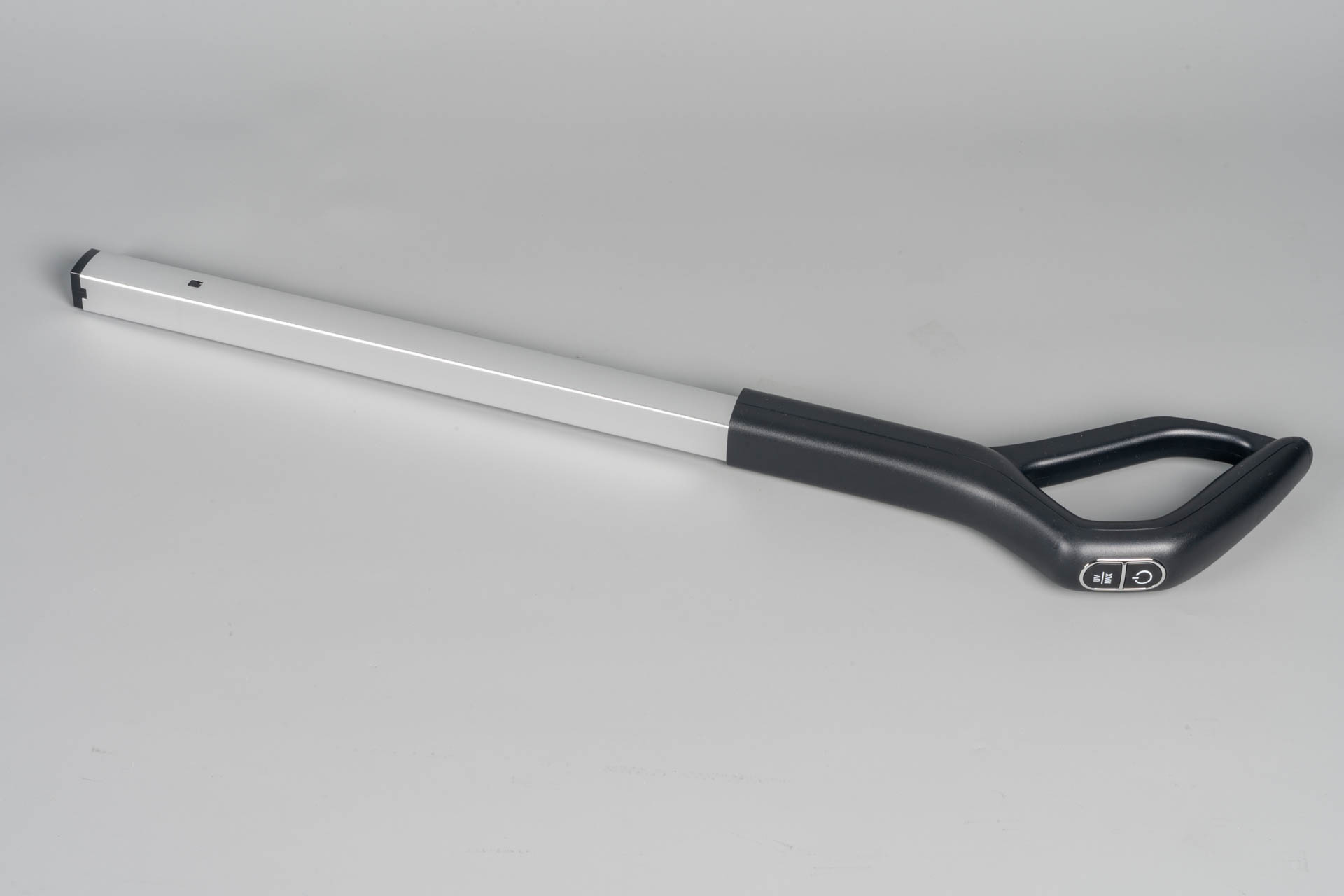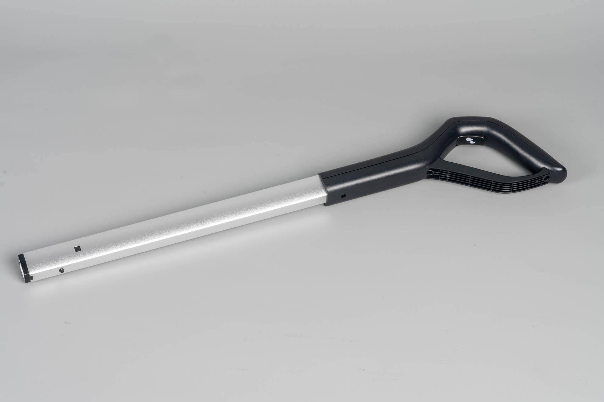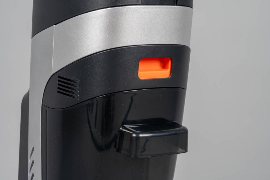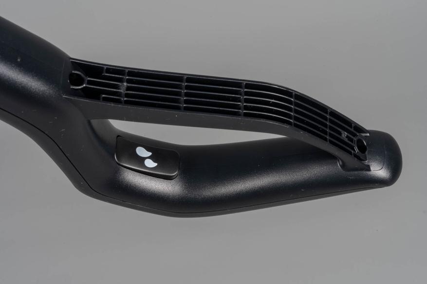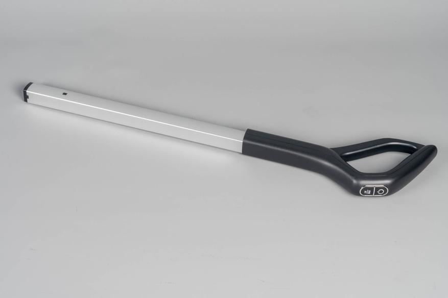Приведение пылесоса в рабочее состояние требует установки рукоятки в штатное гнездо. Рукоятка выполнена из алюминиевой основы с матовым покрытием и дополнена пластиковыми элементами.