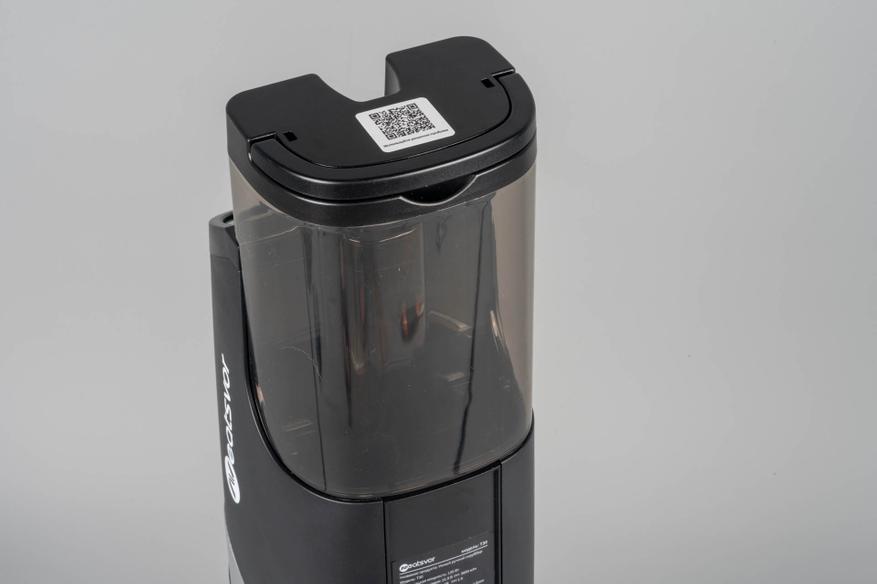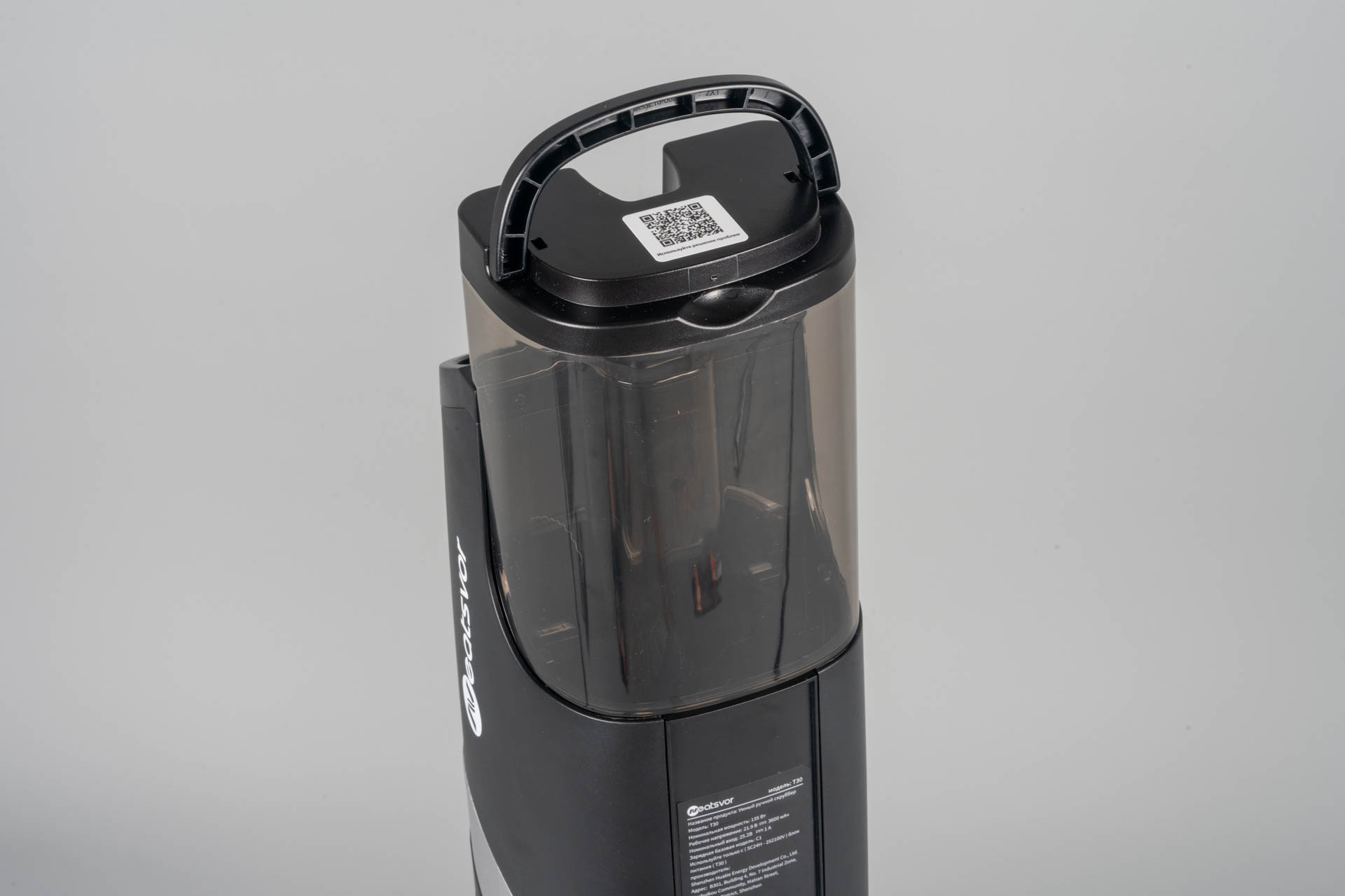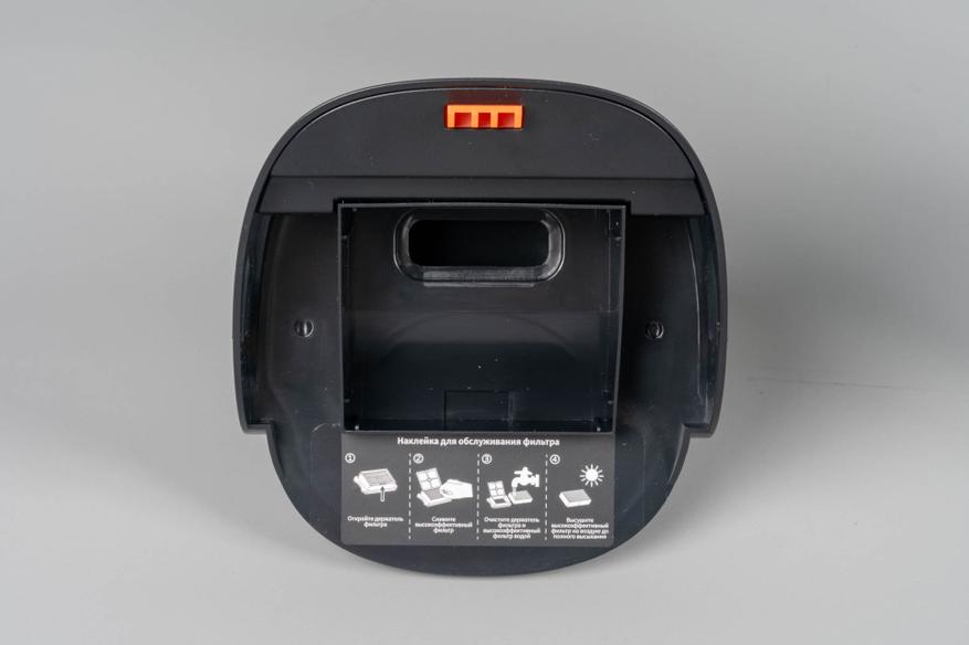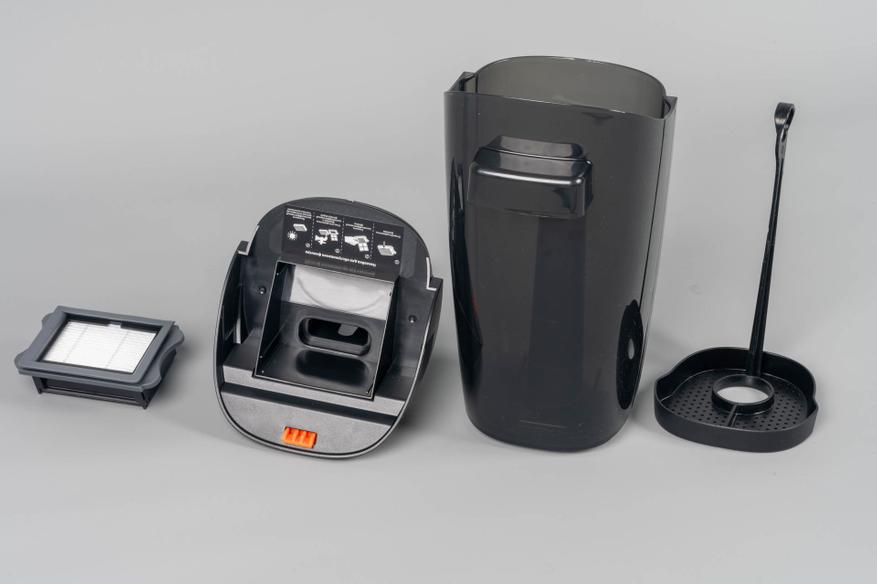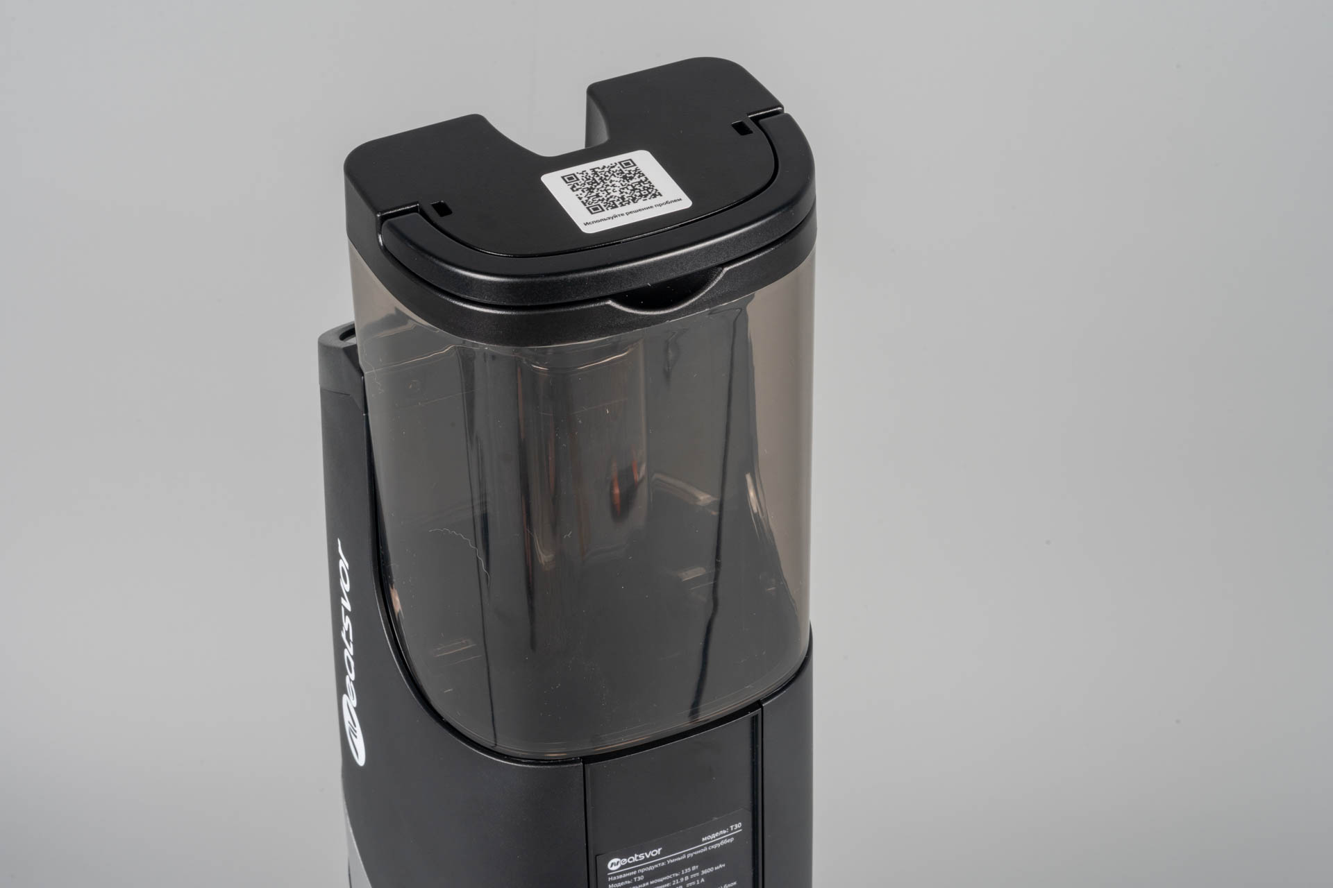 Завершающая стадия уборки предполагает ручную обработку мусоросборника: контейнер очищают вручную и промывают водой. Встроенный фильтр-сепаратор упрощает разделение отходов и жидкости — пользователь удаляет мусор и ополаскивает емкость. При необходимости фильтр допускает обработку проточной водой. Для более тщательной очистки в труднодоступных местах в комплект входит ершик, а для его хранения предусмотрена подставка на зарядной станции.