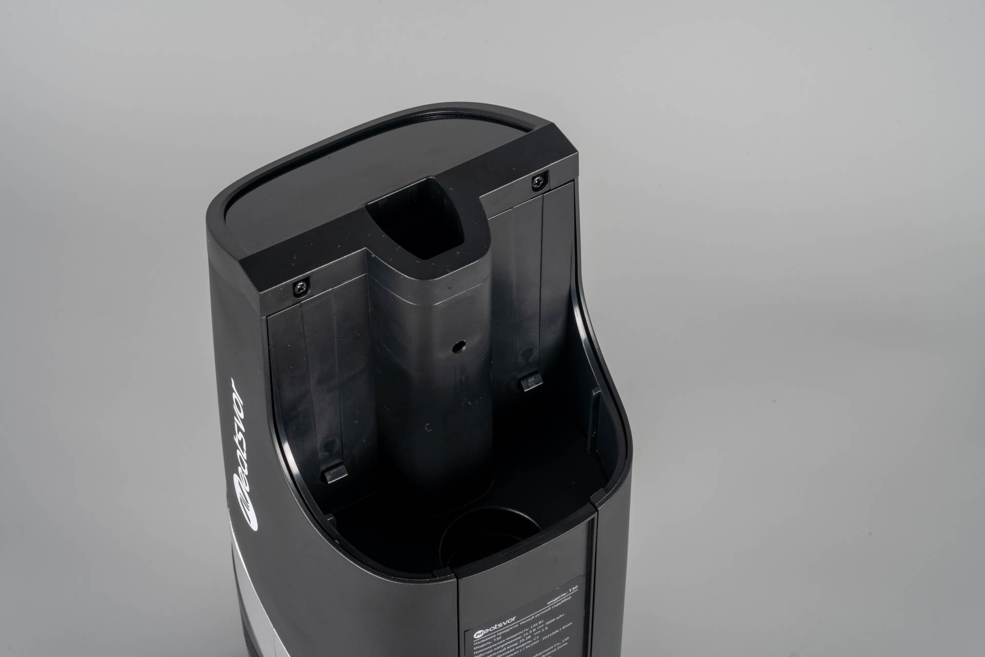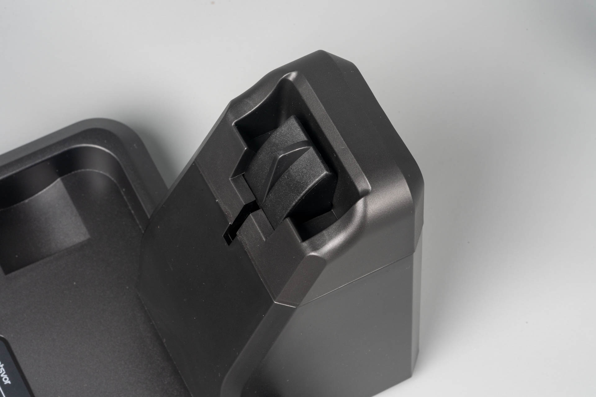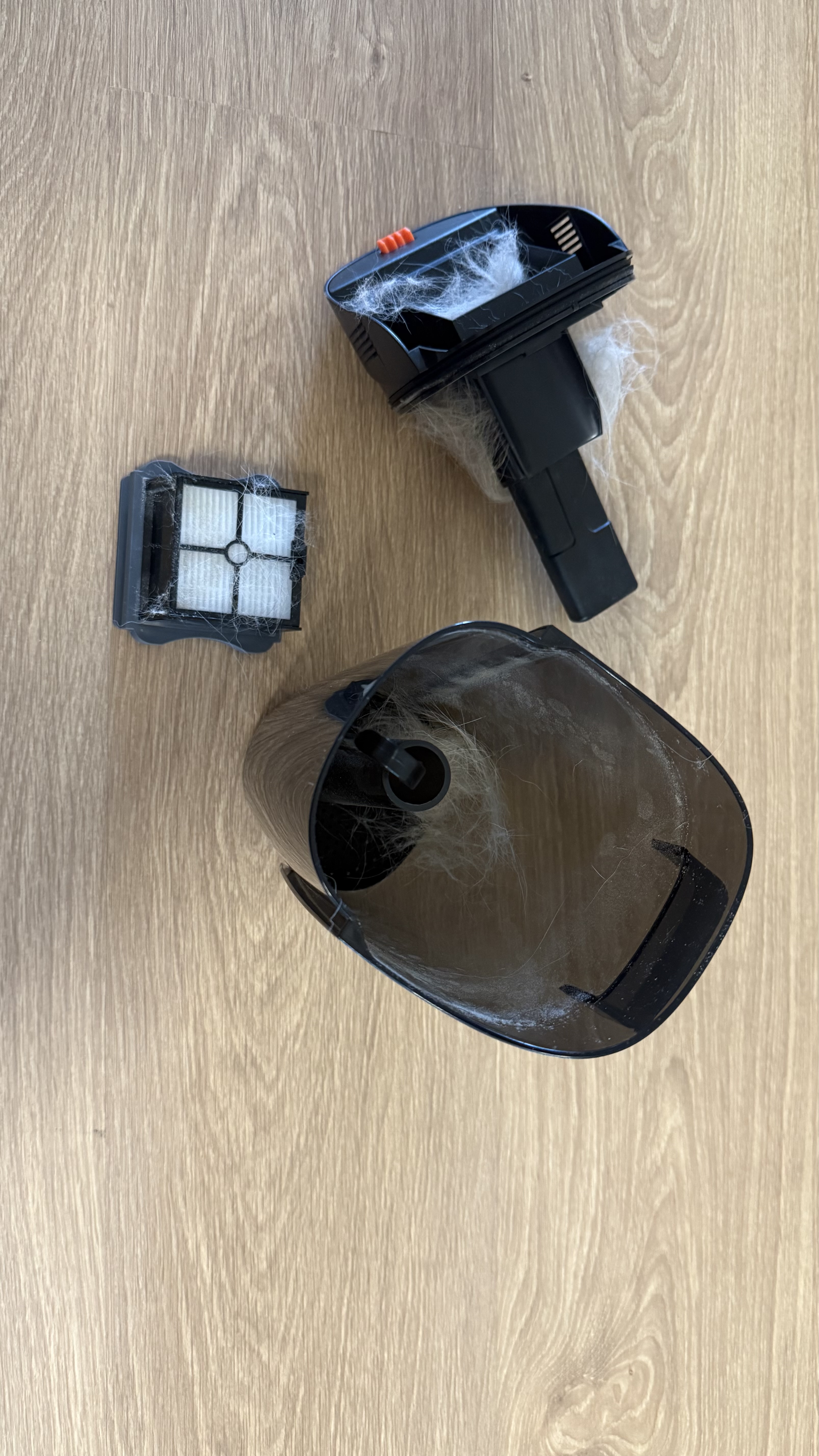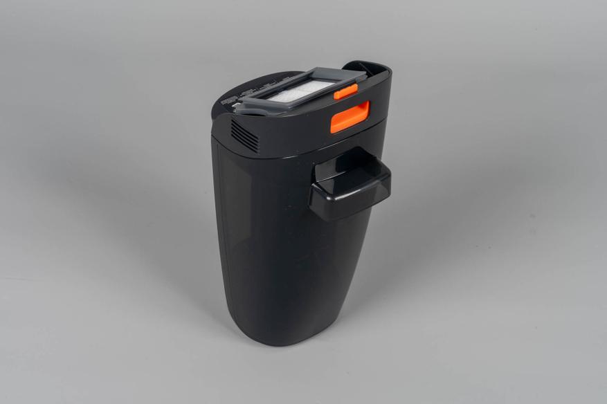 Завершающая стадия уборки предполагает ручную обработку мусоросборника: контейнер очищают вручную и промывают водой. Встроенный фильтр-сепаратор упрощает разделение отходов и жидкости — пользователь удаляет мусор и ополаскивает емкость. При необходимости фильтр допускает обработку проточной водой. Для более тщательной очистки в труднодоступных местах в комплект входит ершик, а для его хранения предусмотрена подставка на зарядной станции.