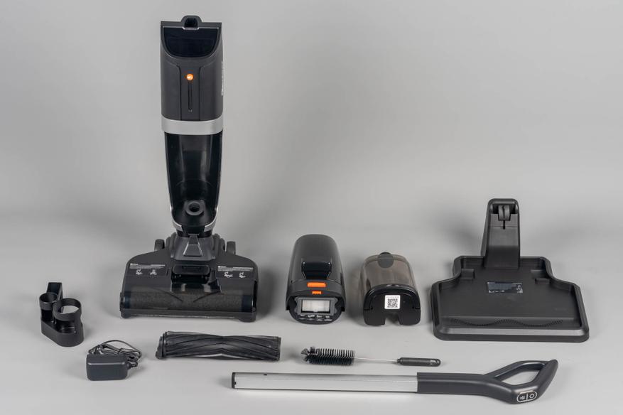 Комплект поставки моющего пылесоса представлен ниже. В него включены: резервуар для воды и отходов, фильтрующий элемент, зарядная станция с функцией хранения, сетевой адаптер (блок питания), рукоятка управления, основная чистящая насадка для пола, узкая щелевая насадка (ёршик), шестигранный ключ для сборки и основной блок управления (корпус пылесоса).