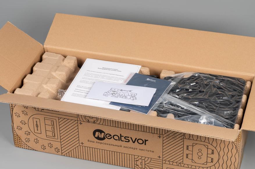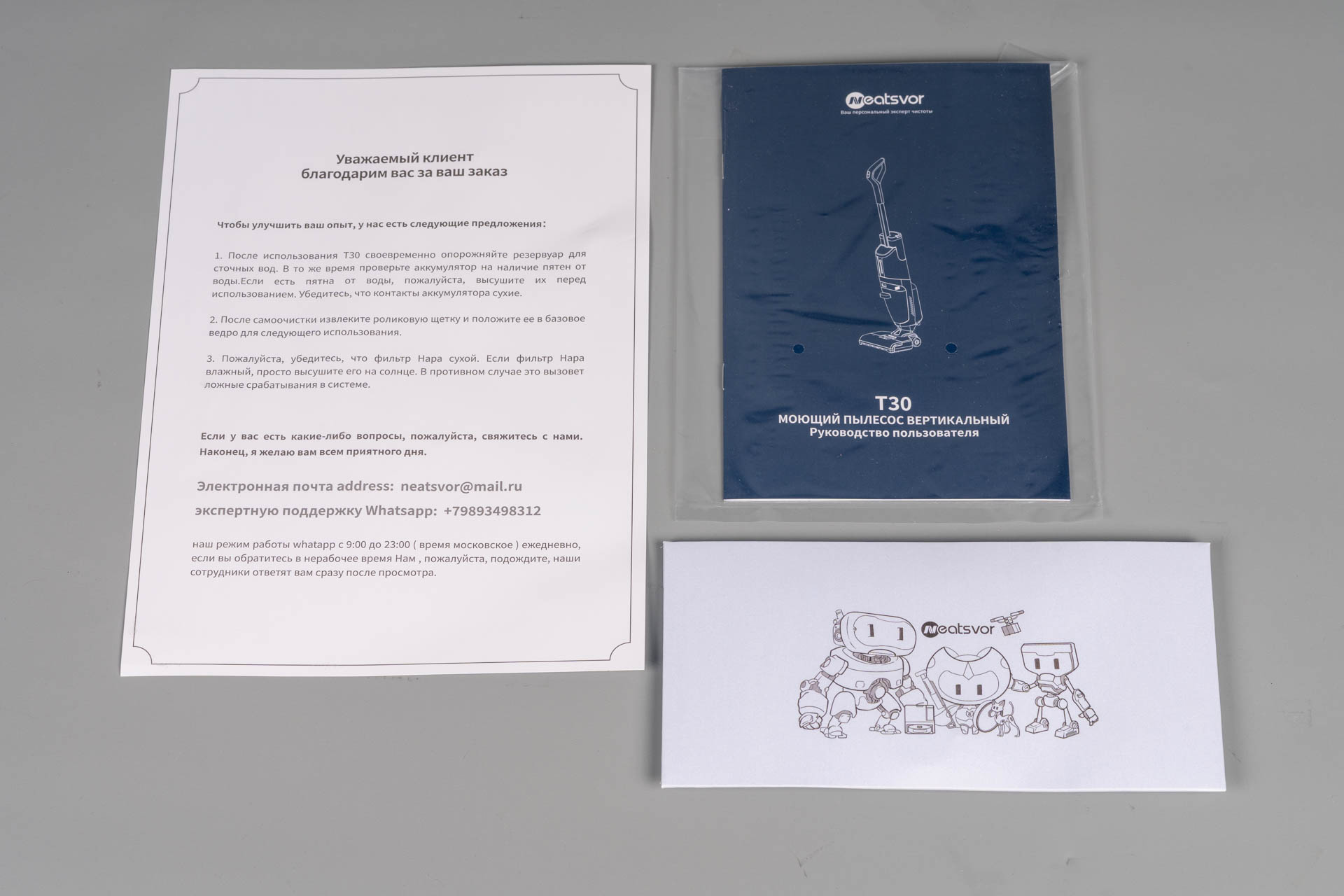 Neatsvor T30 изготовлен из ABS-пластика в традиционном форм-факторе. Его основные компоненты включают: основной корпус, передний резервуар для сбора отходов (0.8 л), задний контейнер для чистой воды (1 л), съемный аккумулятор и чистящий модуль.