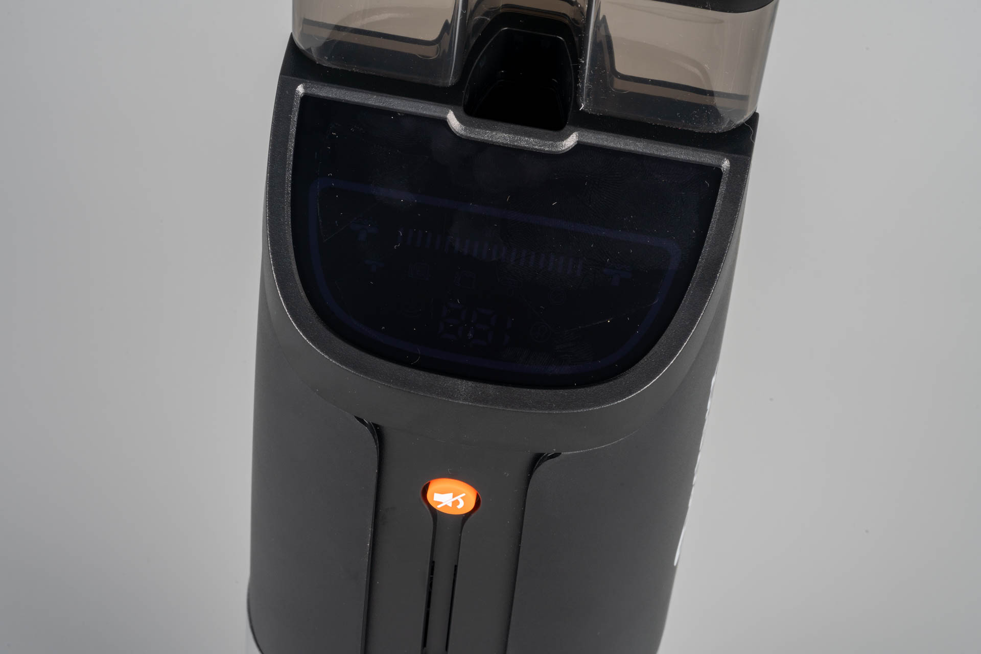 На корпусе пылесоса расположен дисплей, предоставляющий визуальную информацию пользователю. Экран отображает ключевые данные о работе устройства, включая уровень заряда батареи. Также на дисплее можно увидеть выбранный режим уборки и установленную мощность всасывания, что позволяет контролировать процесс. Кроме того, на экране отображаются важные уведомления о состоянии пылесоса.