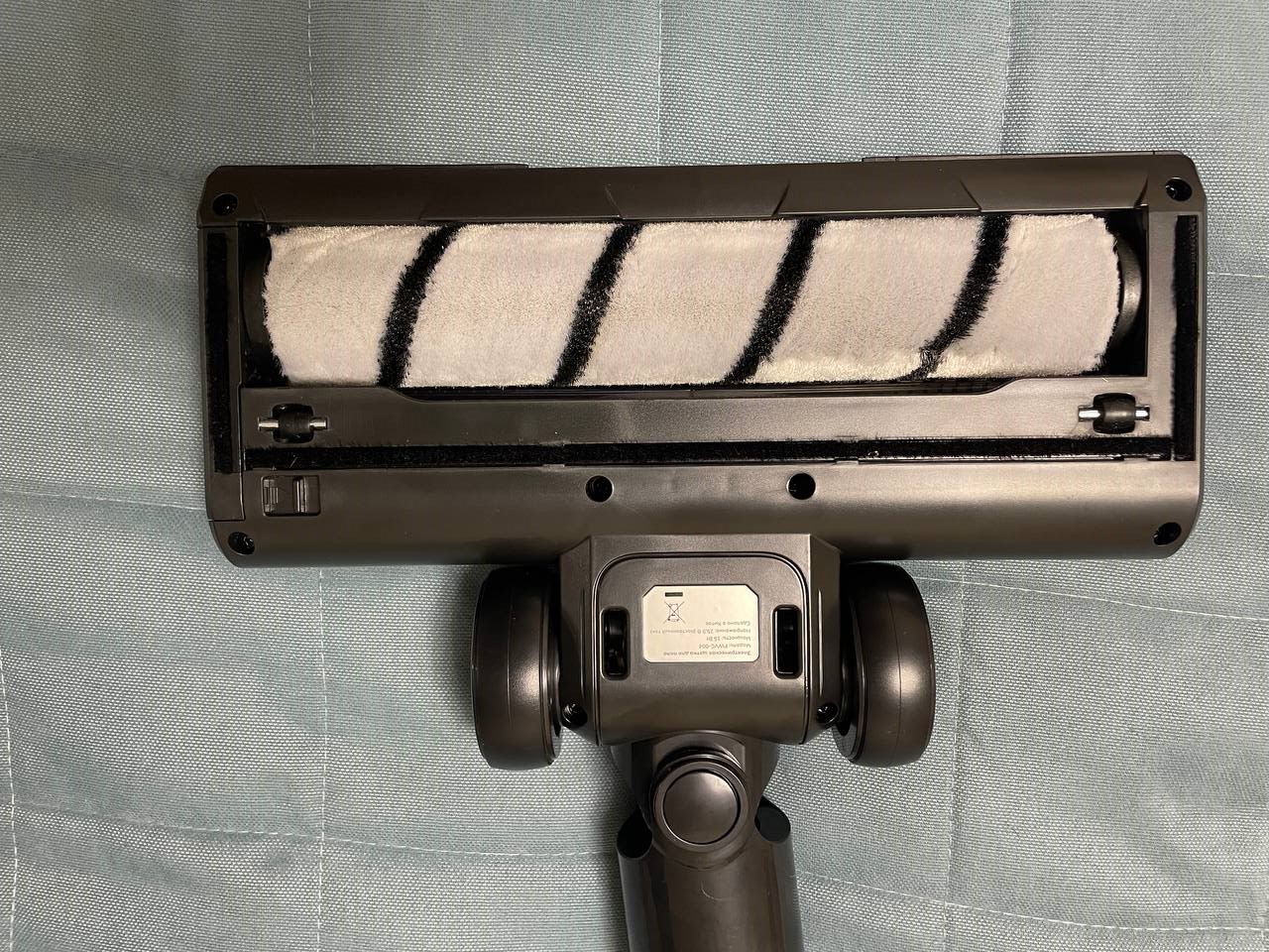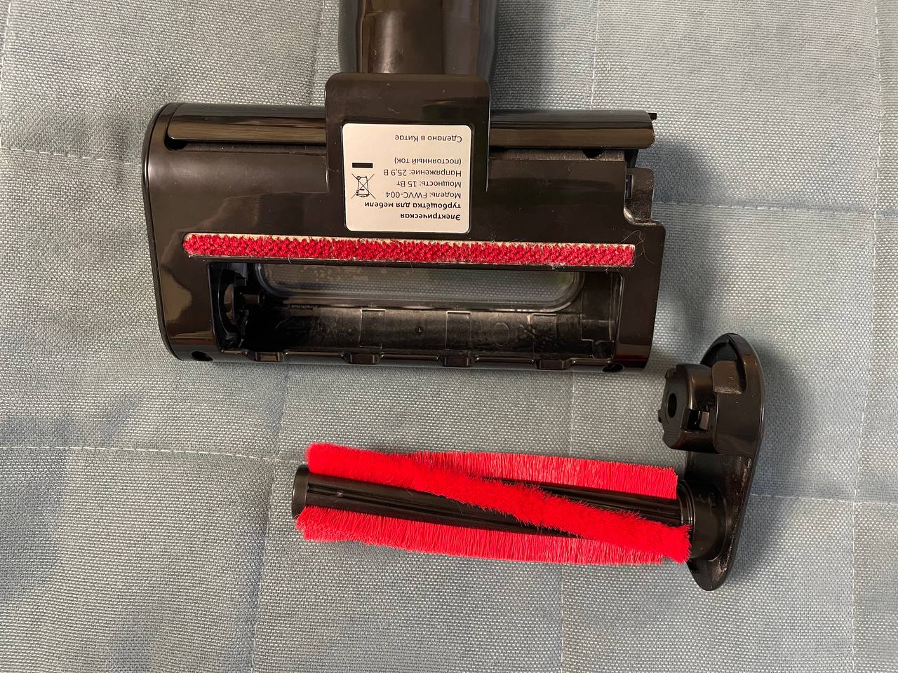 Для обслуживания щётку можно легко разобрать, отщёлкнув боковую крышку. В комплекте — два сменных валика: универсальный ролик с щетиной для ковров и гладкий валик для бережной уборки с твёрдых покрытий.