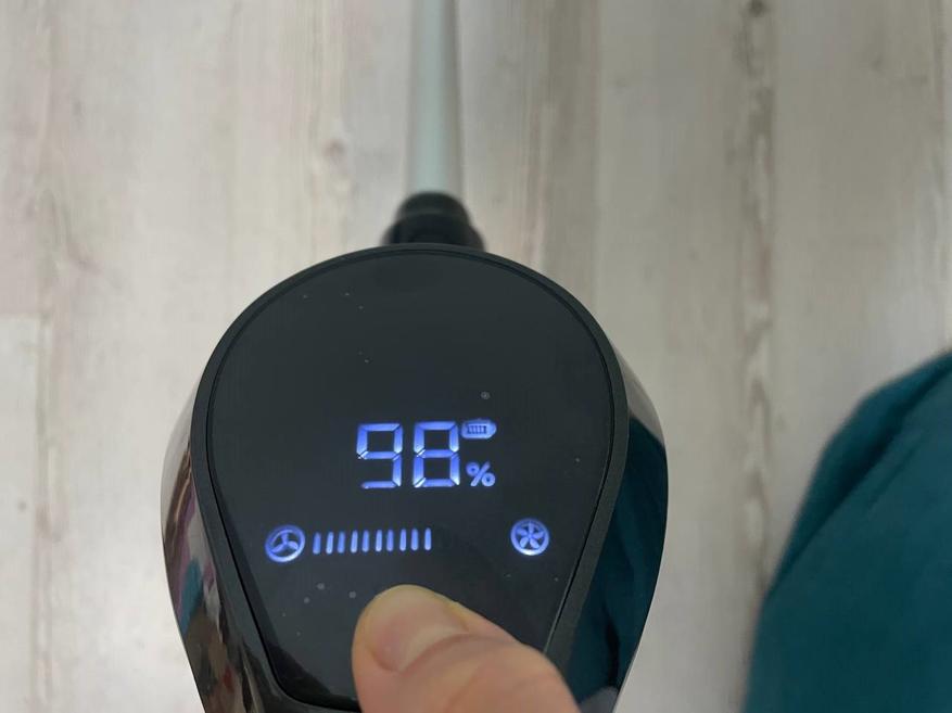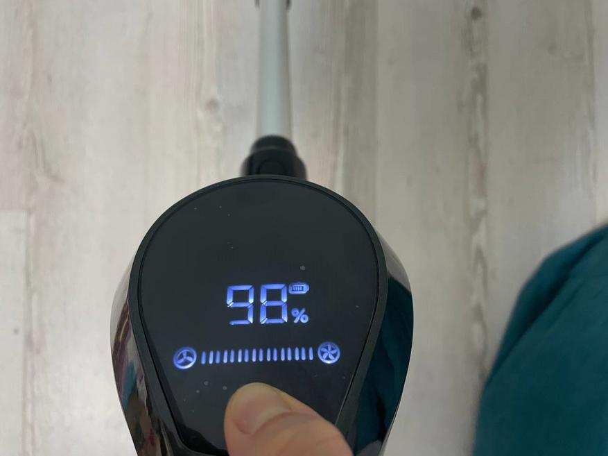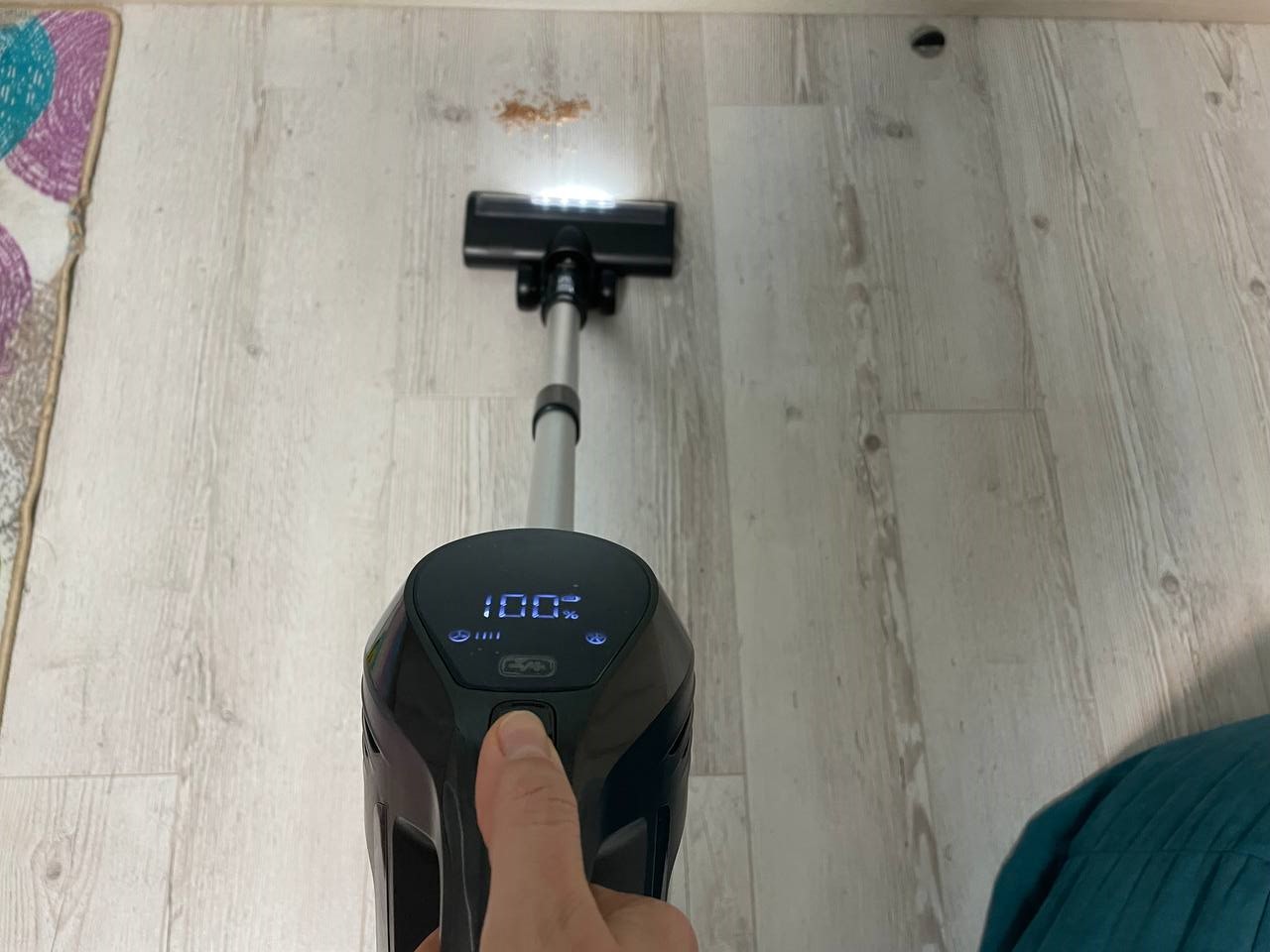Всё управление — на рукояти: всего две кнопки. Одна — вкл/выкл, вторая — плавная регулировка мощности. Три режима всасывания напрямую влияют на автономность: 40 минут в эконом-режиме, 20 минут в среднем режиме и 15 минут — в максимальном режиме. За уровнем мощности и зарядом можно следить с дисплея.