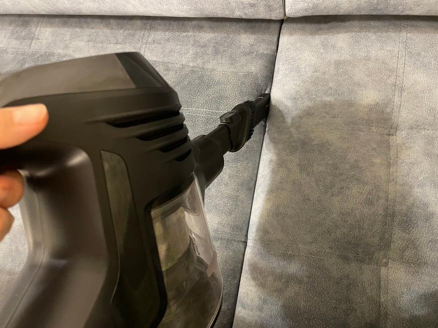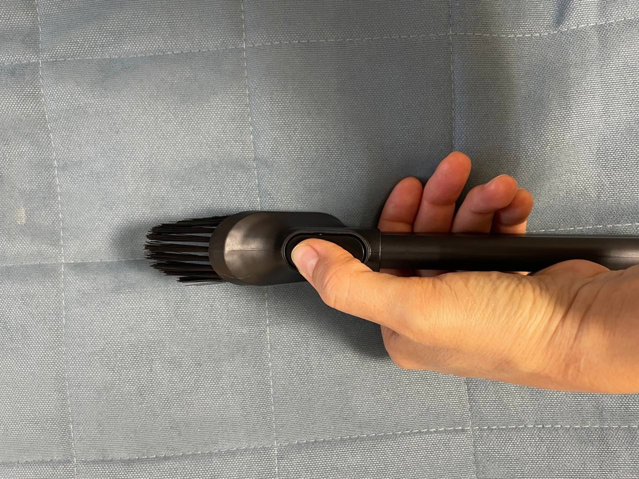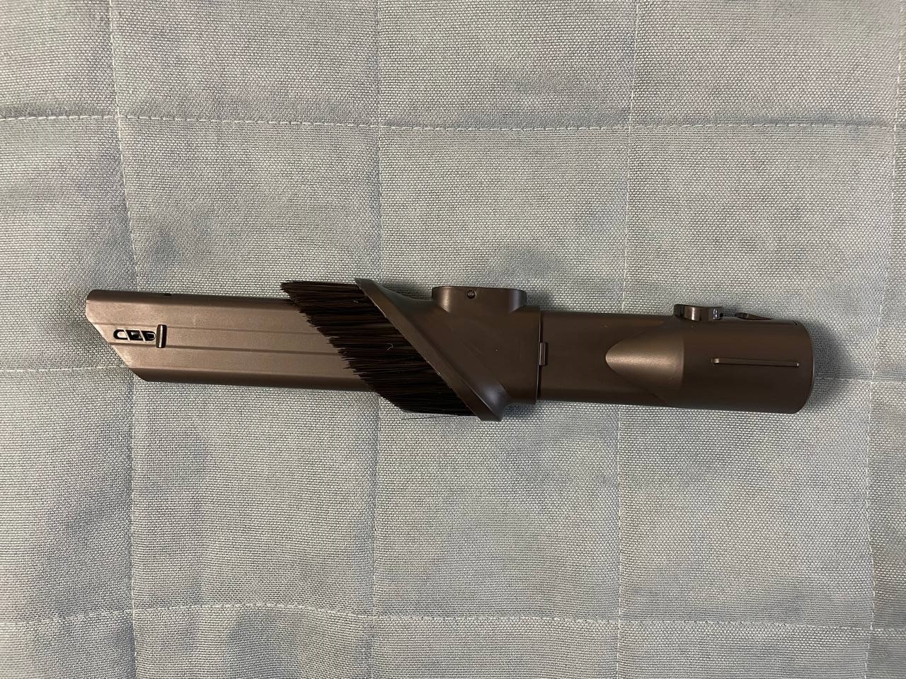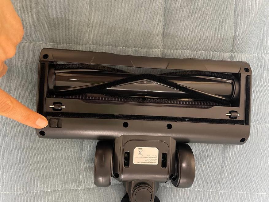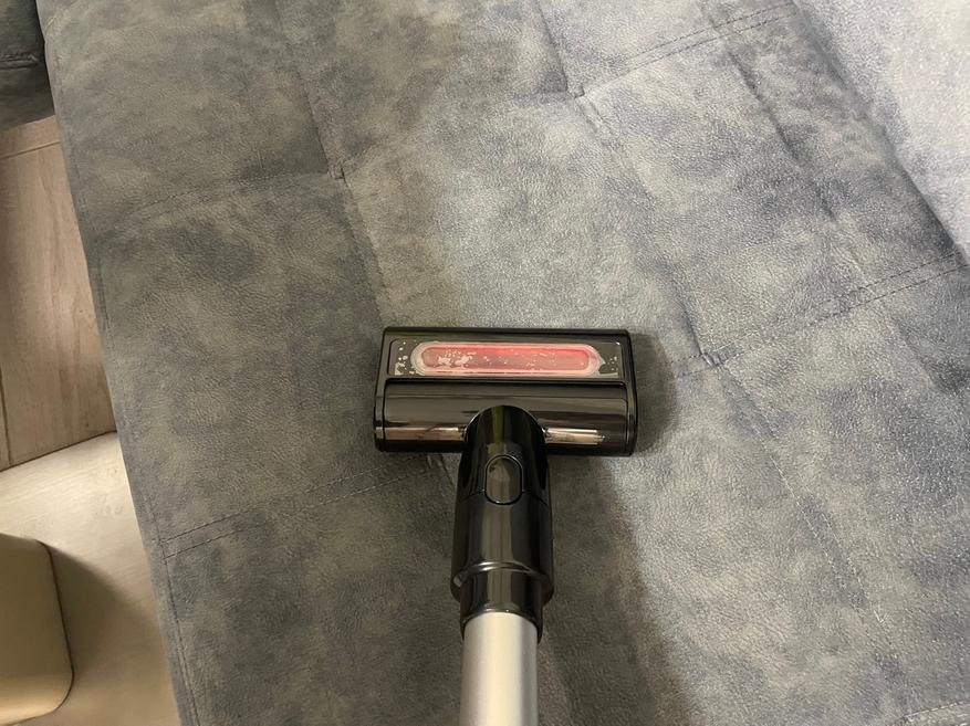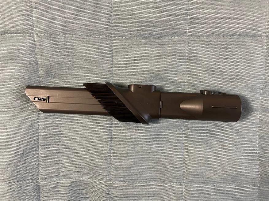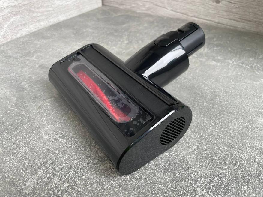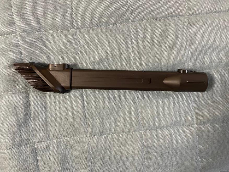 Щетка для мягкой мебели создана для мягкой мебели, чистки матрасов и ковров. Она хорошо убирает шерсть от домашних животных. Как и у основной щётки, здесь есть собственный мотор, что делает уборку более эффективной. Но к сожалению у этой щетки нет ни поворотного механизма, ни подсветки. Насадка легко разбирается: можно снять основную крышку, и при необходимости — извлечь сам вращающийся валик со щетиной, чтобы очистить его от волос которые обычно сложно убираются при наматывании.