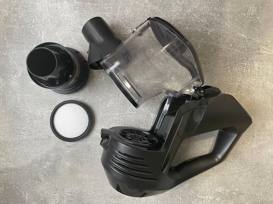 Система сбора мусора — это чаша-контейнер, которая состоит из четырёх деталей. Конструкция легко разбирается для очистки и так же просто собирается обратно. Для быстрой утилизации мусора не нужно снимать весь блок, достаточно откинуть нижнюю панель нажав на кнопку — и контейнер пуст.
