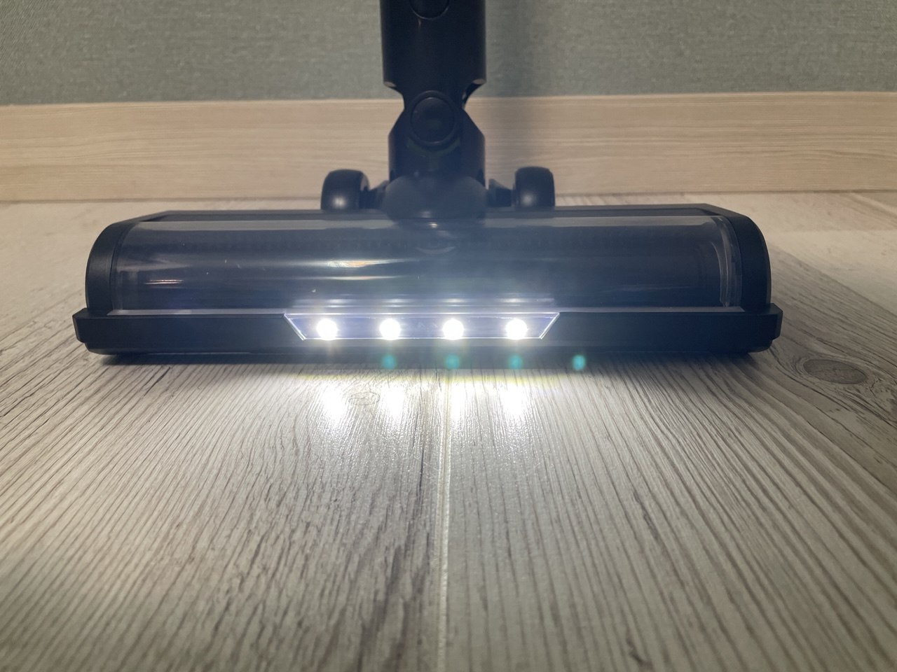 В основании щётки расположены яркие светодиоды. Они автоматически активируются при включении пылесоса и создают направленный световой поток, что полезно при уборке в труднодоступных, плохо освещённых местах.