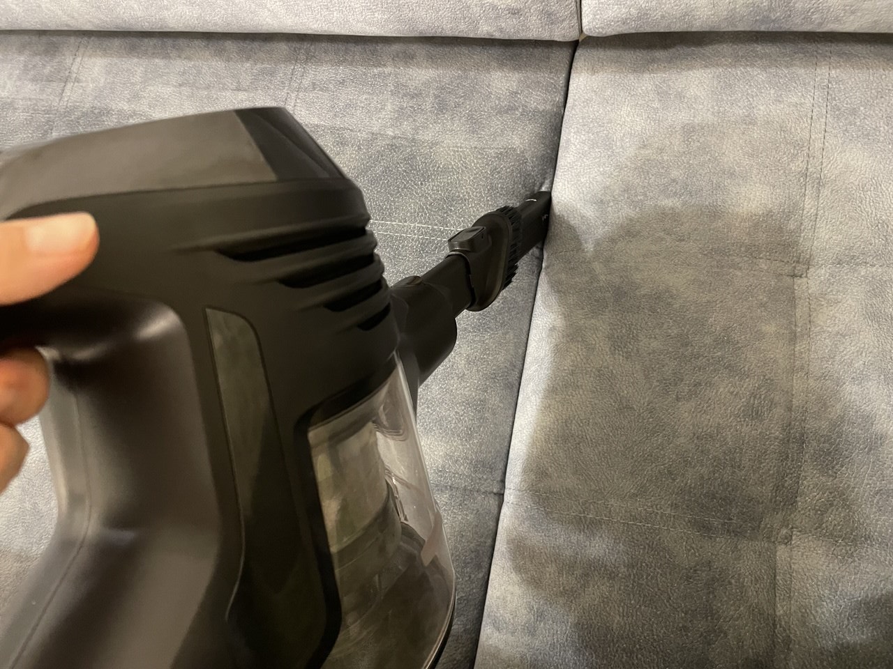 Щелевая насадка узкая и длинная с ней можно пройтись по всем труднодоступным местам. Её можно использовать в двух вариантах, стоит только нажать на переключатель и она меняет свое положение: с мягкой щетиной для аккуратного сметания пыли и без неё — для мощного всасывания в узких щелях. Она легко проникает в зазоры между диванными подушками и узкие пространства вдоль плинтусов, с её помощью можно достать рассыпавшиеся крошки, закатившиеся детали, превращая уборку в настоящую «охоту» за мусором.