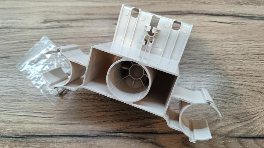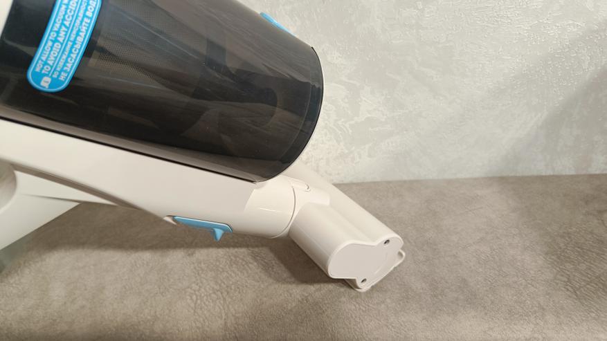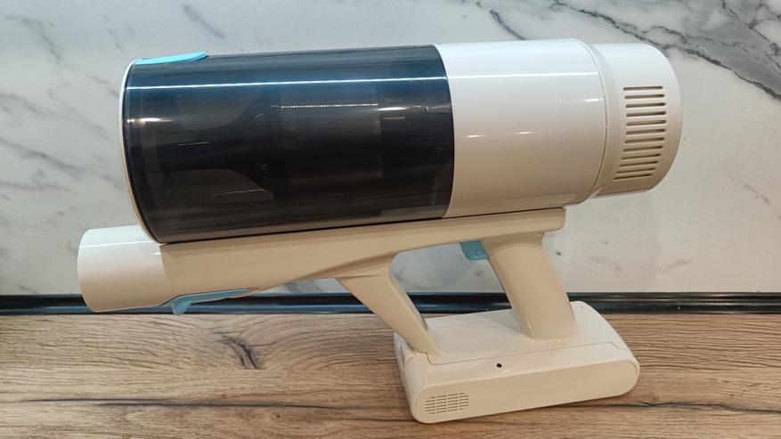 Вот и добрались до основного блока пылесоса. Он состоит из моторного отсека, съемного контейнера для мусора, ручки и съемного аккумулятора. Все элементы застегиваются за счет пластиковых защелок и надежно удерживаются. Внешне он мне напоминает футуристический бластер из фильмов про космос. Массивная ручка с курком запуска, большой отсек под блок питания и экран для индикации.