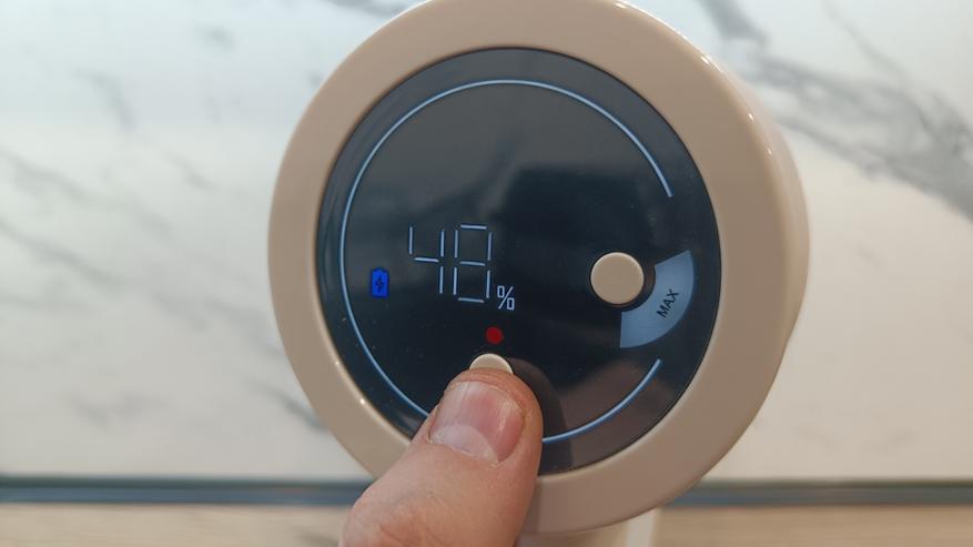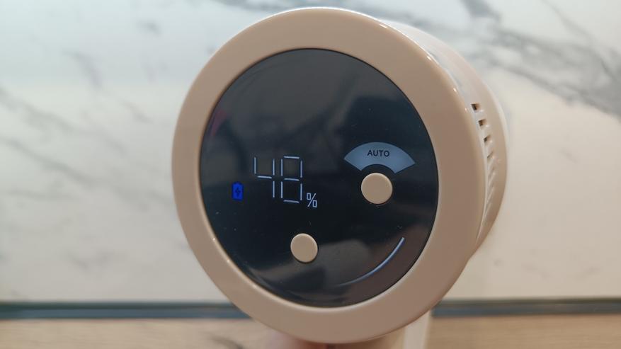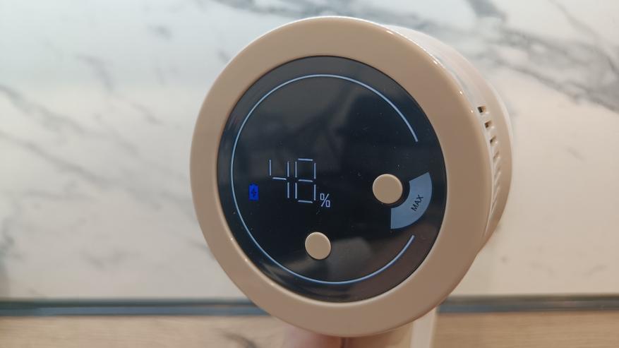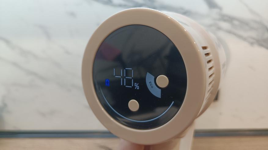С торца корпуса можно увидеть цветной экран, на который выводится необходимая информация по состоянию устройства и выбранному режиму работы. Для пользователя доступно 2 кнопки управления, позволяющие выбрать режим работы из 3 возможных и фиксатор кнопки включения. Если его активировать, то пылесос будет включаться по однократному нажатию и кнопку удерживать не придется. На экране выводится информация по остаточному заряду аккумулятора и возможных возникающих ошибок. К примеру, засор в приемной трубе или блокировка роллера во время работы.