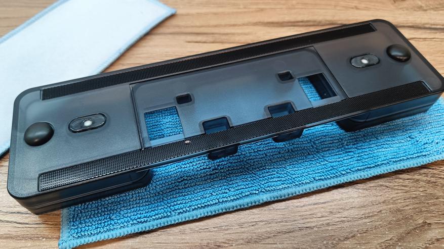 Насадка для мытья полов устанавливается на основную щетку. Вода заливается через специальный клапан, а на нижней части под сменными салфетками установлено 2 форсунки, через которые поступает вода. Таким образом, сразу после сухой уборки, можно провести и влажную. По мере загрязнения салфеток, их придется очищать или заменять на чистые.