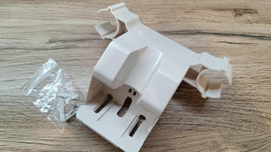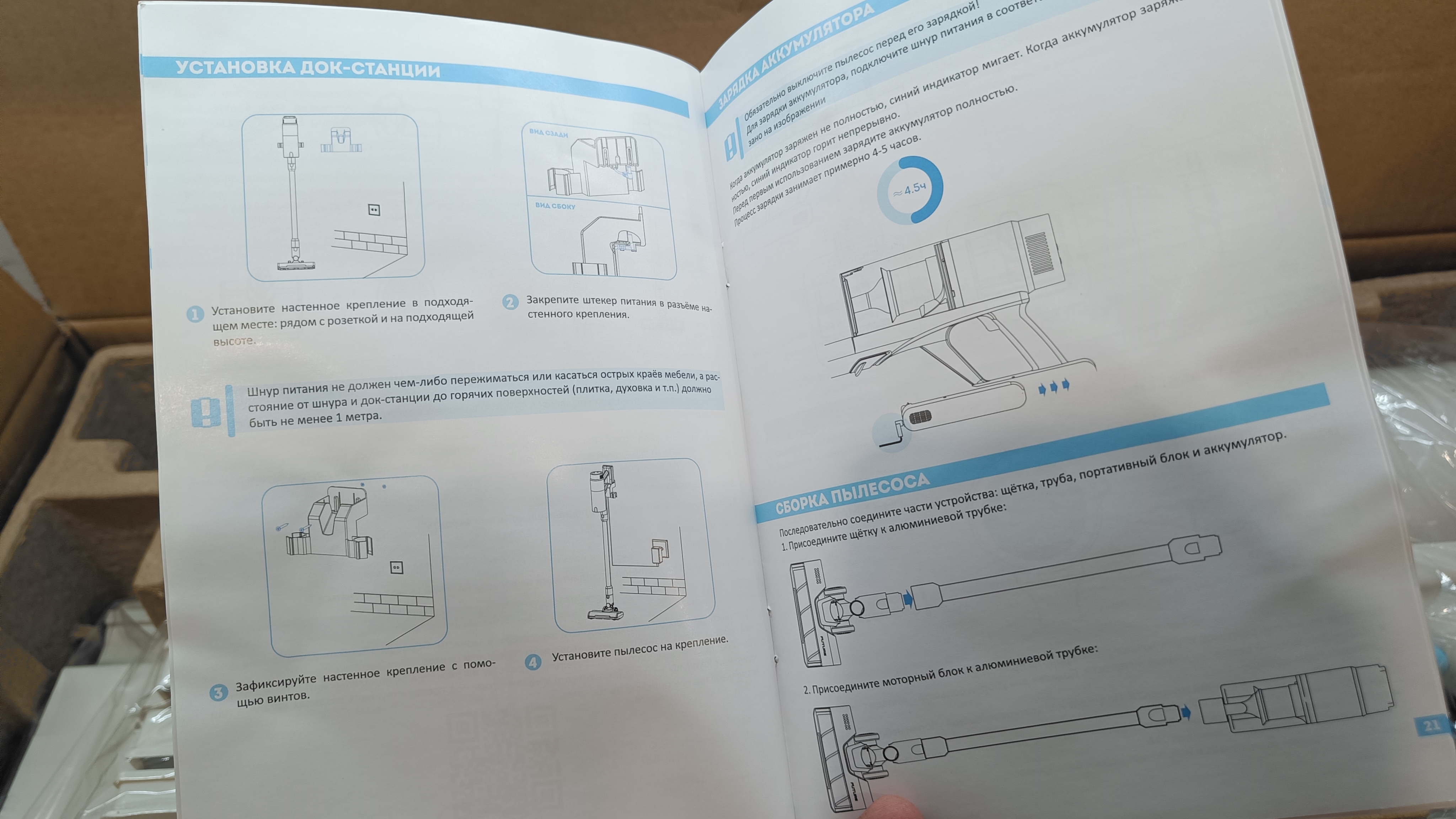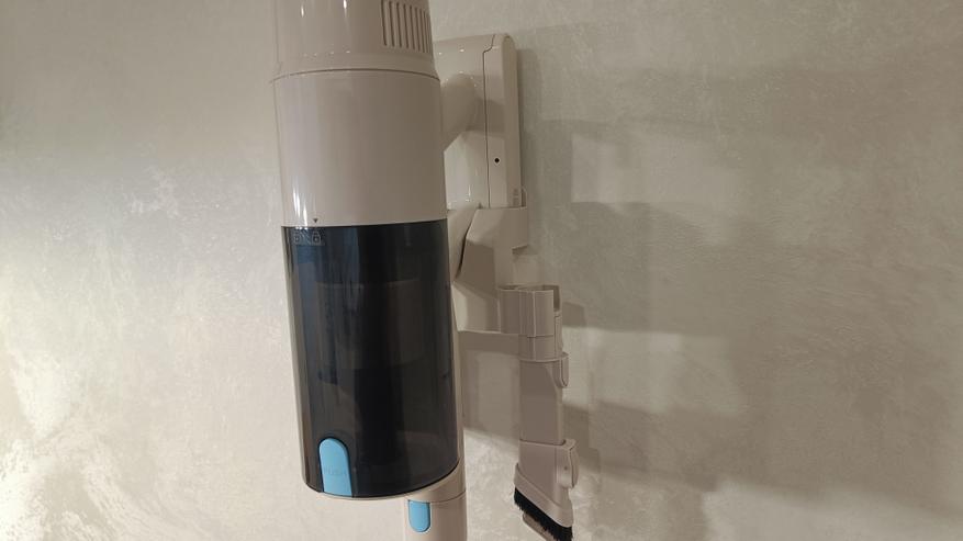 Для хранения пылесоса и насадок предназначена настенная док-станция. Конструкция позволяет подвешивать пылесос на стену и одновременно заряжать аккумулятор. Кроме того, на док станции размещаются 3 сменные насадки. Для установки на стену предусмотрены саморезы.