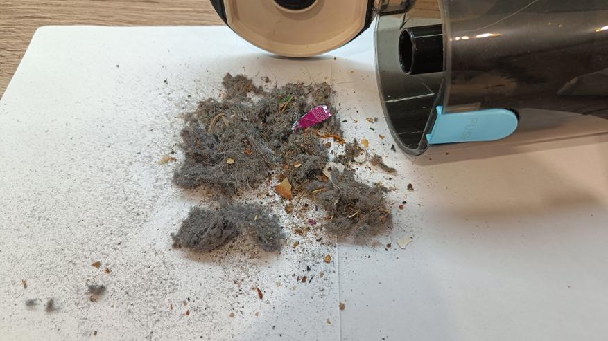 Благодаря циклонному фильтру и многоуровневой системе фильтрации в контейнере скопился мусор, который в дальнейшем с легкостью можно сбросить в бак. Контейнер для мусора съемный, поэтому нет надобности носить весь пылесос. В кучке мусора можно увидеть не только мелкую пыль, но и крупный мусор.