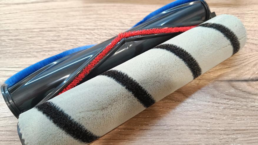 Довольно богатая комплектация, так как есть кроме стандартных насадок присутствует еще и блок для влажной уборки, сменный тканевый фильтр и дополнительный роллер из щетины разной жесткости.