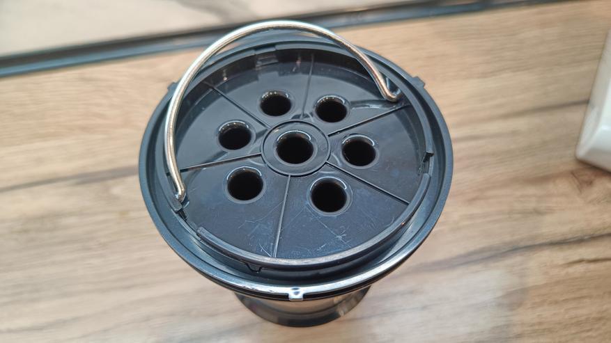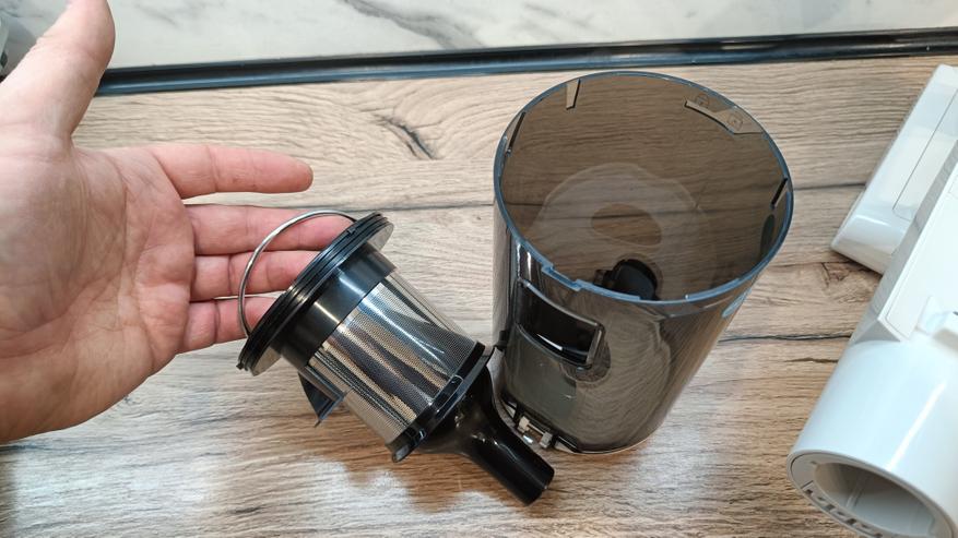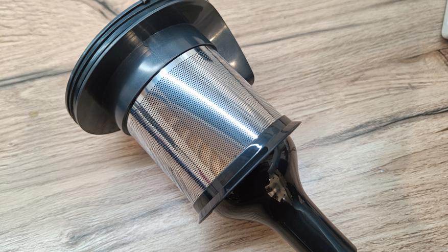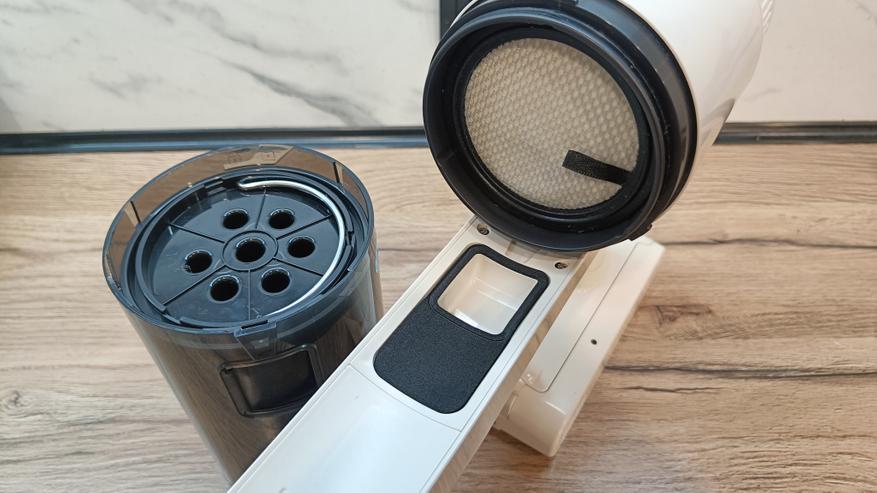 Контейнер для сбора мусора на 600 мл из полупрозрачного пластика. Состоит из основного циклона, который прижимает мусор к стенкам и сортирует на более мелкие фракции. А также 7 конусных циклонных фильтров. Тут же можно увидеть металлический фильтр для отсеивания крупных частиц и волос.
