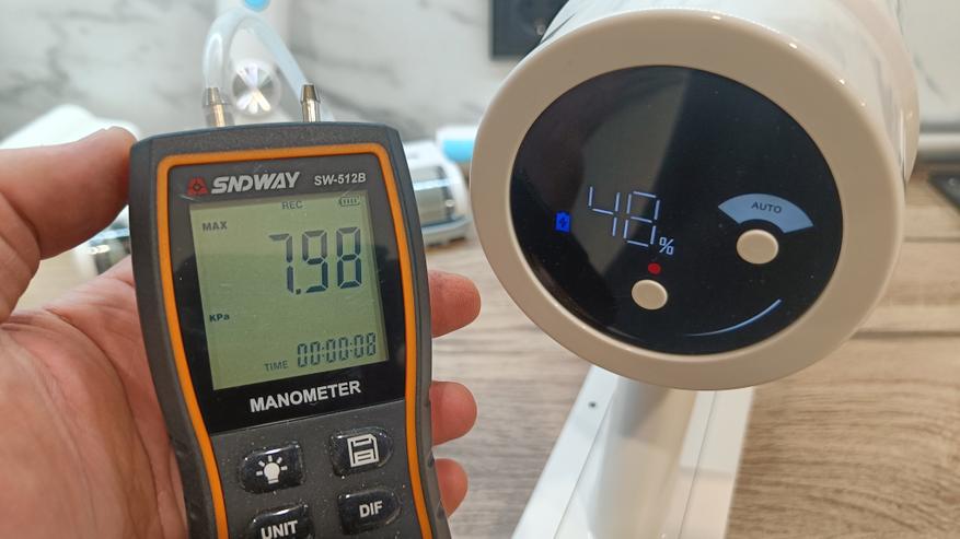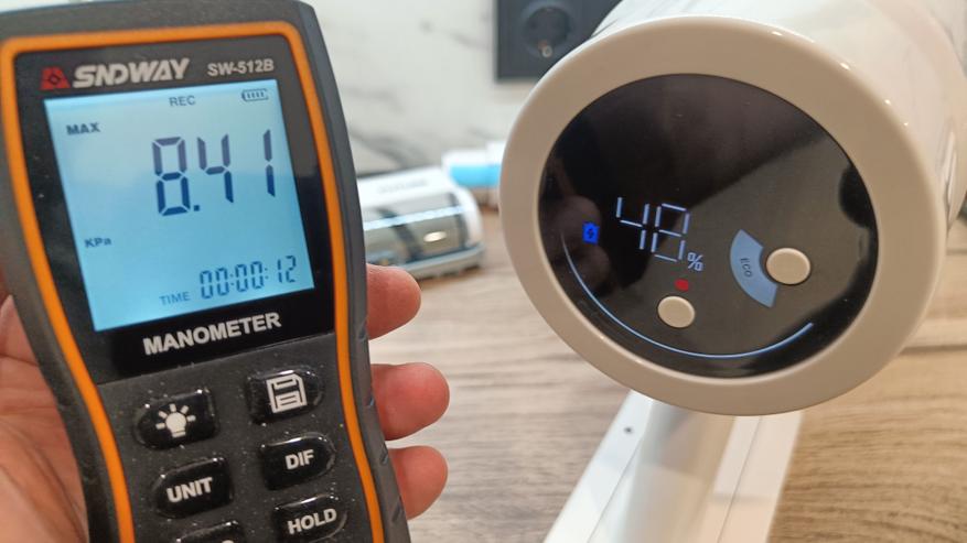 Решил проверить силу всасывания на вертикальном пылесосе RAWMID Future RFV-05. На максимальном разрежении производитель заявляет о 31кПа, что довольно много для вертикалки. У пылесоса 3 встроенных режима: автоматический, ECO и МАХ. В первом режиме устройство самостоятельно контролирует силу всасывания в зависимости от загрязненности. Средние показания по степени разряженности остановились на уровне 8 кПа, но пылесос самостоятельно может увеличивать мощность всасывания. Хотя по ощущениям в данном режиме при увеличении силы всасывания она не достигает максимального уровня.