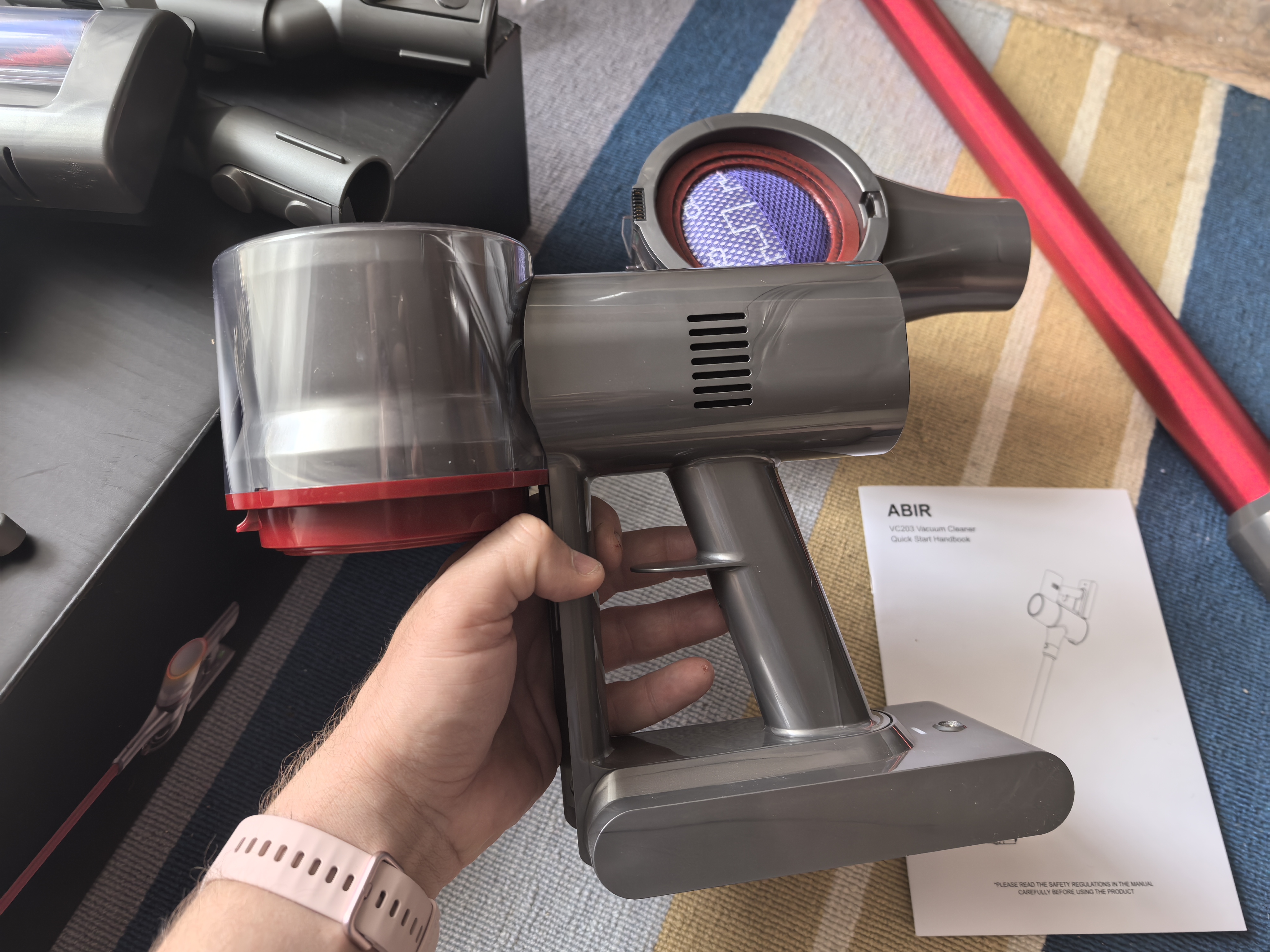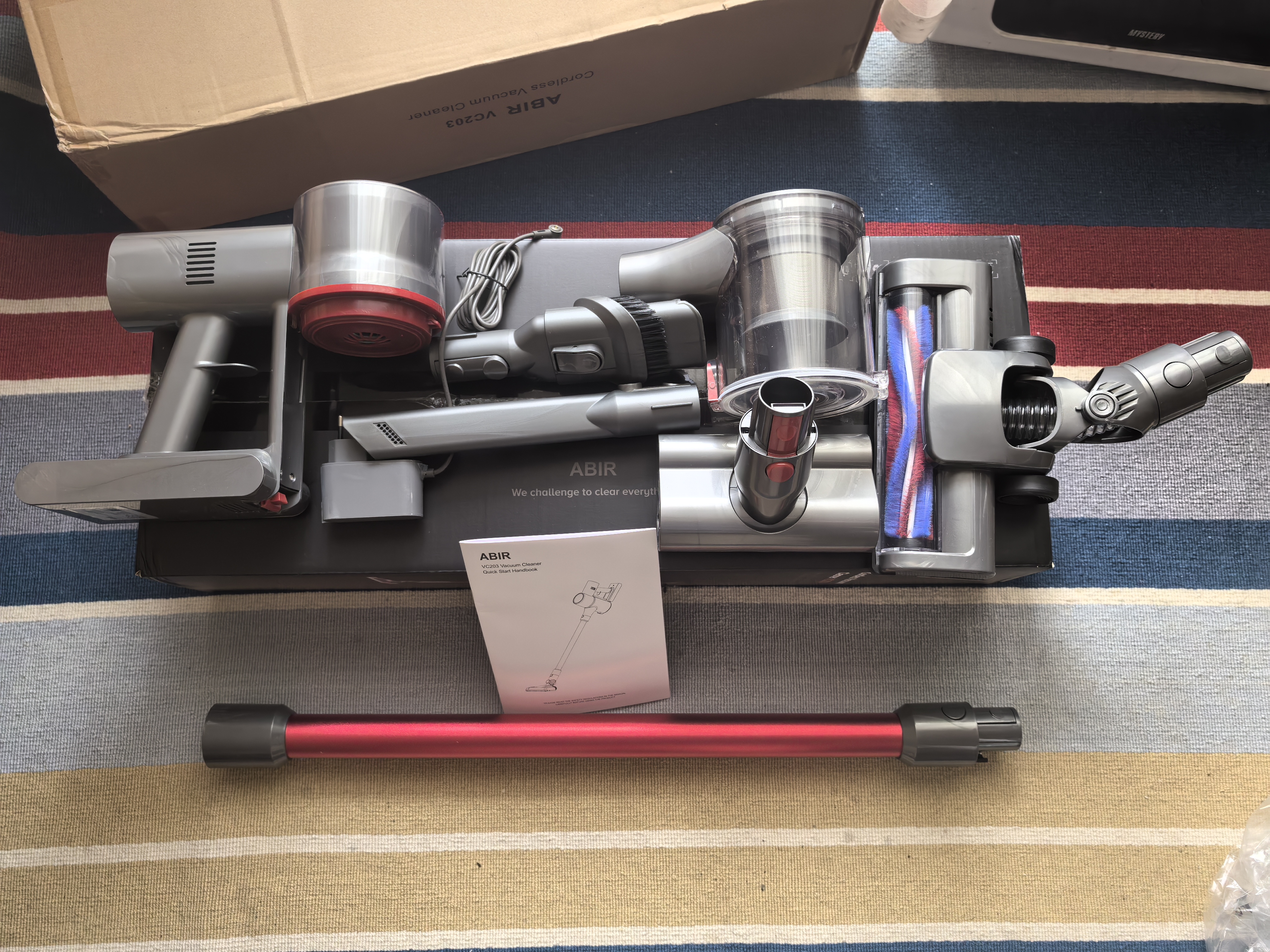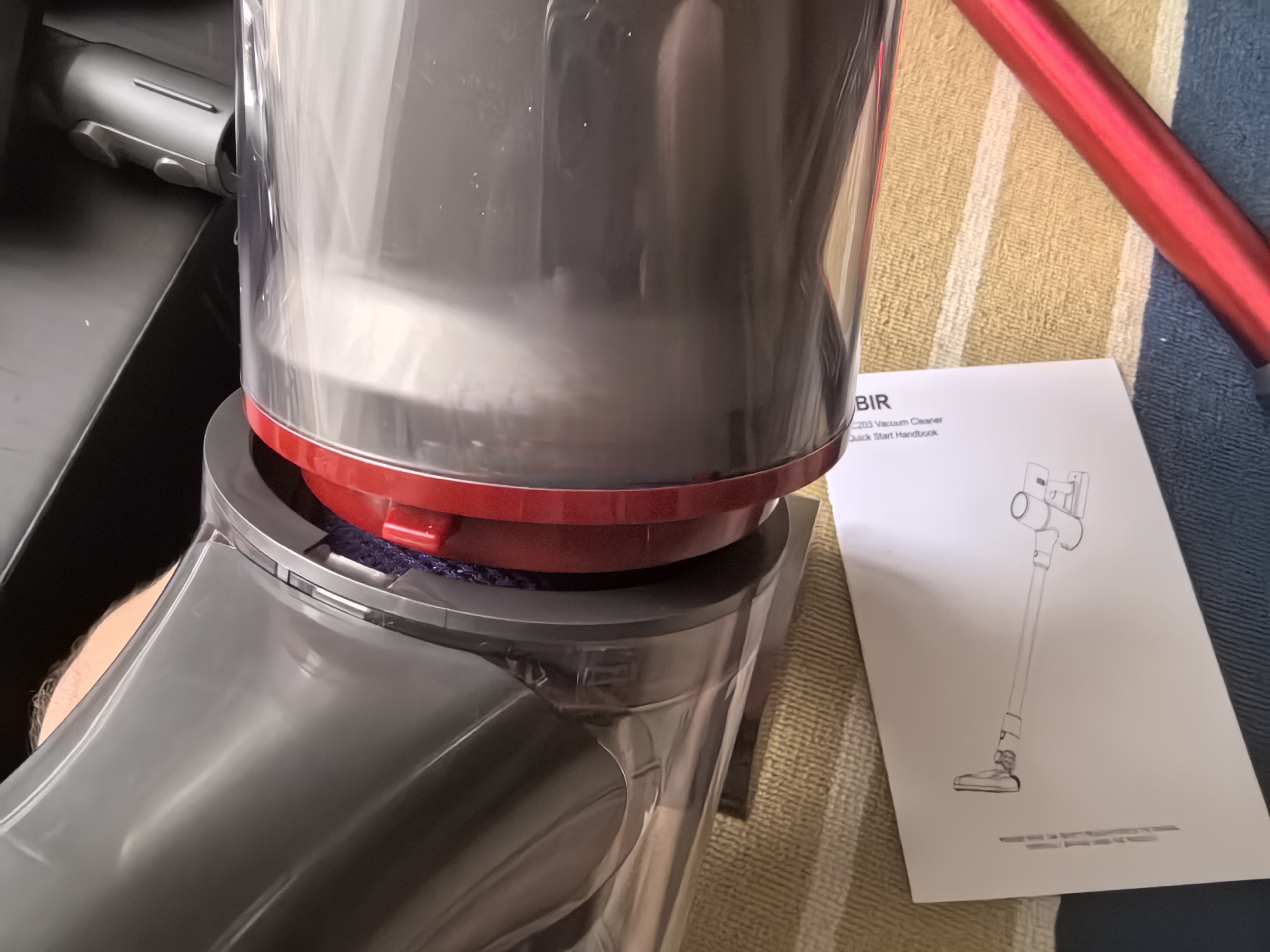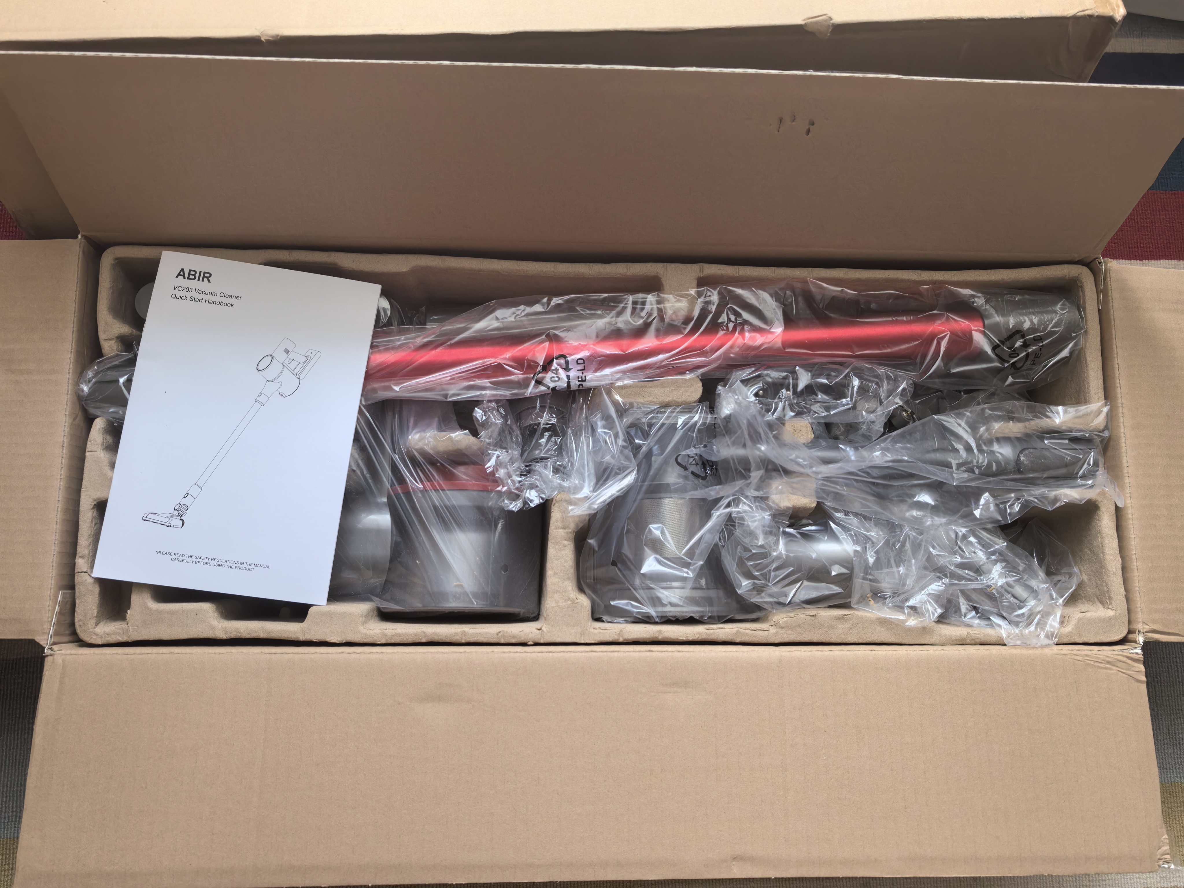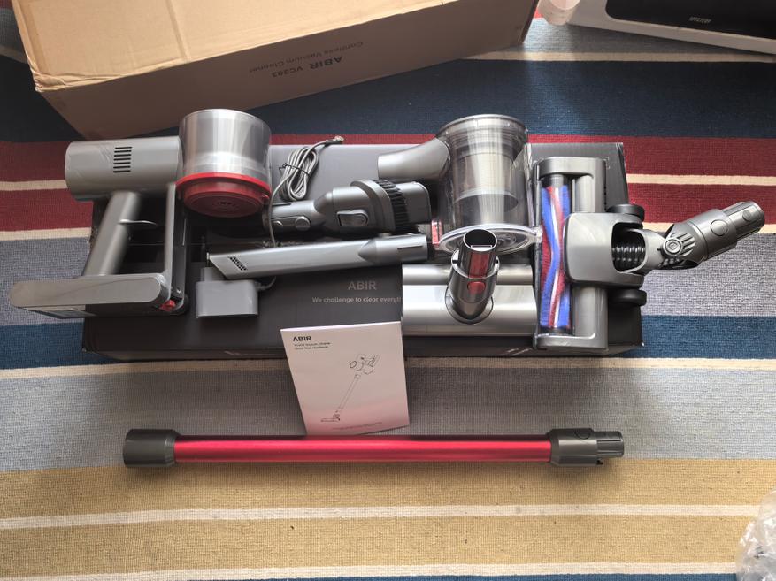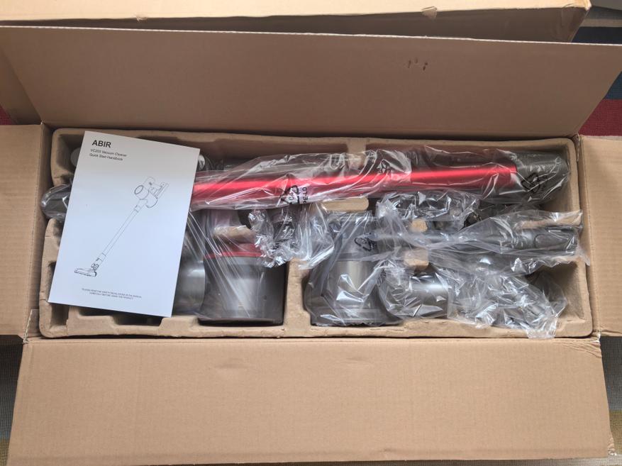 Пылесос приезжает в небольшой упаковке. Внутри все уложено красиво. Первым делом в глаза бросается палка красного цвета. В моем видении, она придает премиальности модели, но помня небольшую цену VC203, осознаю, что это маркетинговое копирование дорогих брендов с не такой большой мощностью всасывания у обозреваемой.