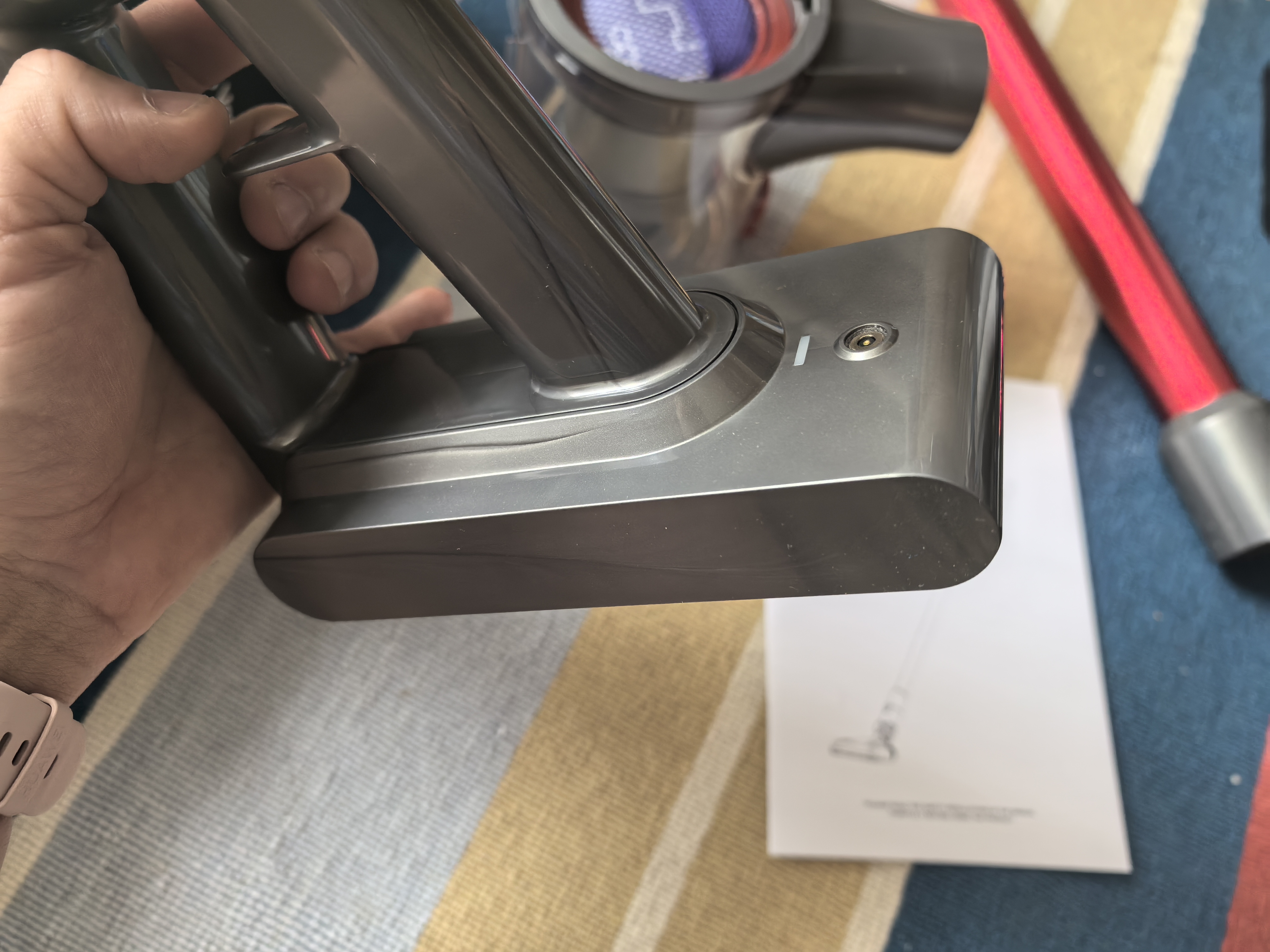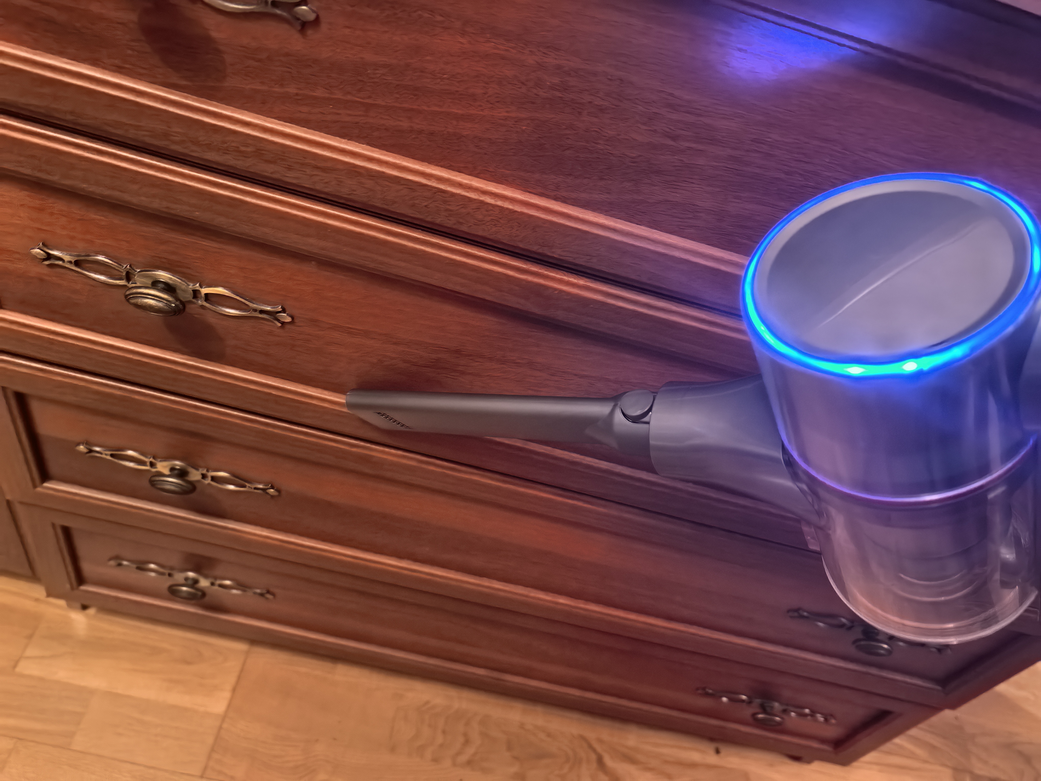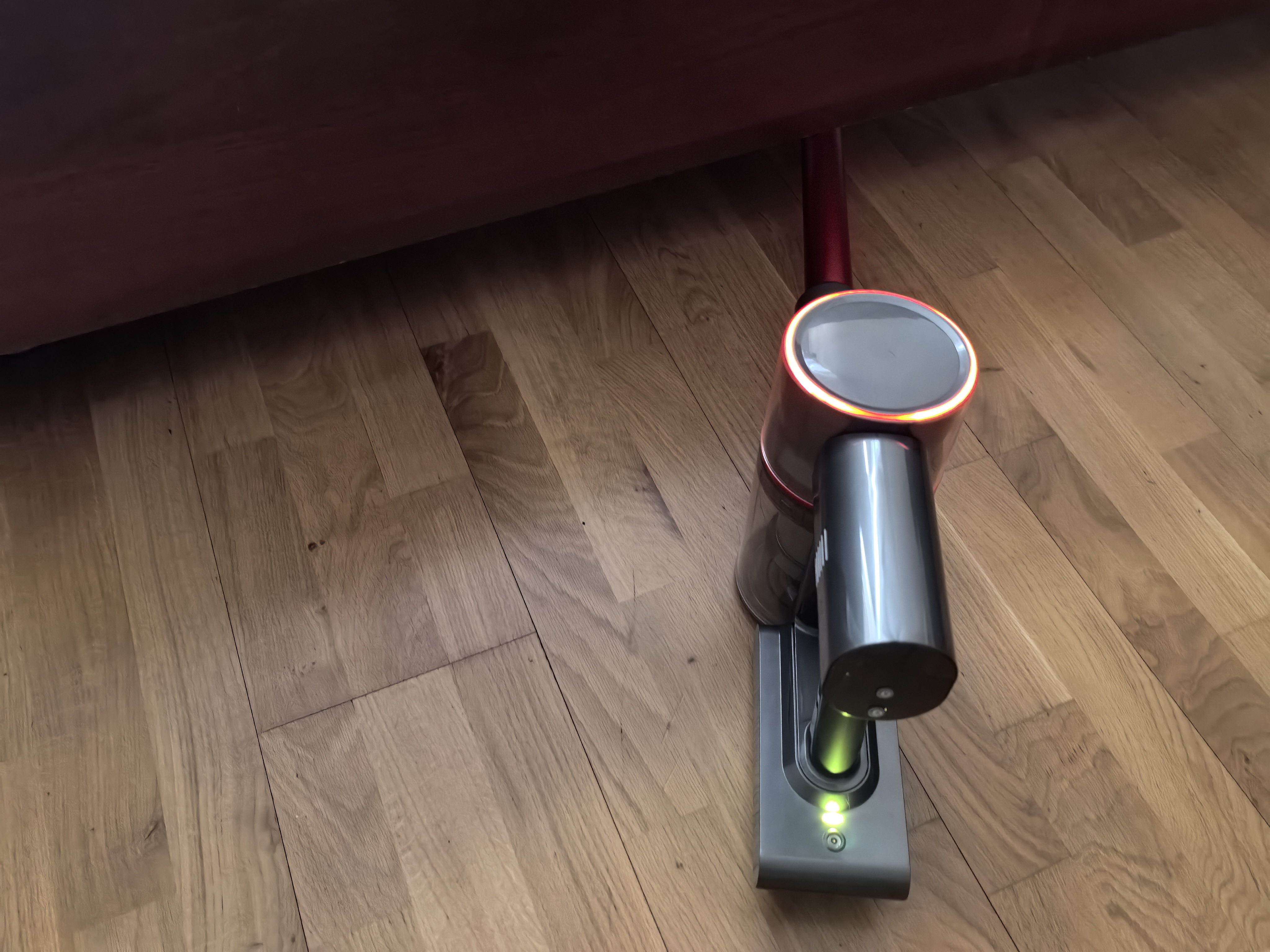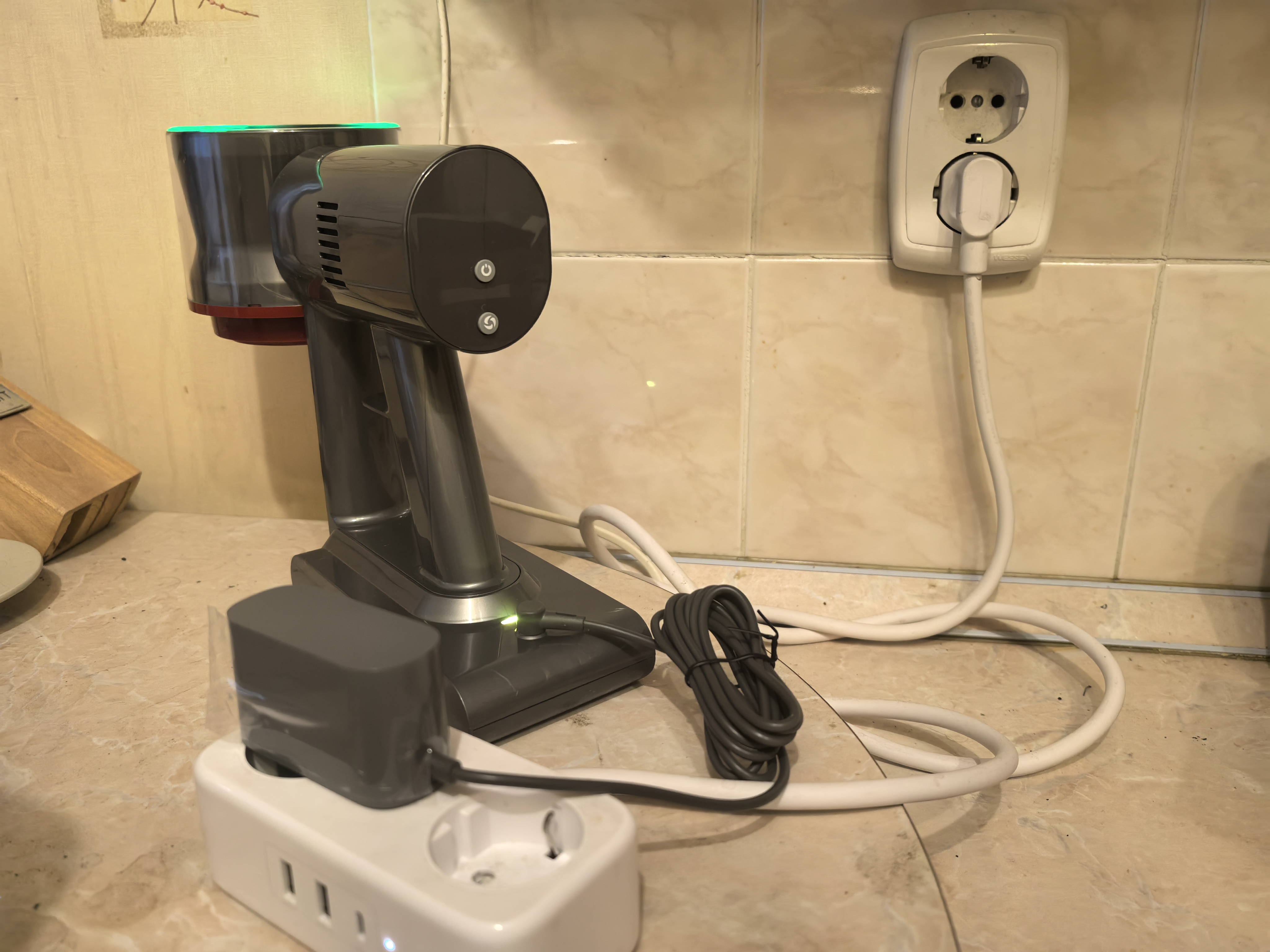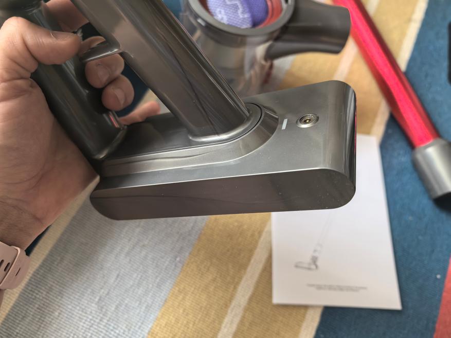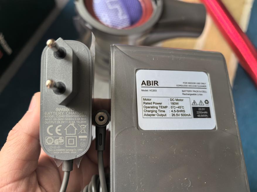 Заряжается пылесос от сетевого кабеля с напряжением 26,5V. Зарядить через повербанк или обычный переходник DC/PD у меня не получится. В инструкции сказано, заряд идёт 4-5 часов, но у меня пылесос зарядился за 3 часа. Во время заряда светятся огни и по мере заполнения аккумулятора круг огней замыкается.