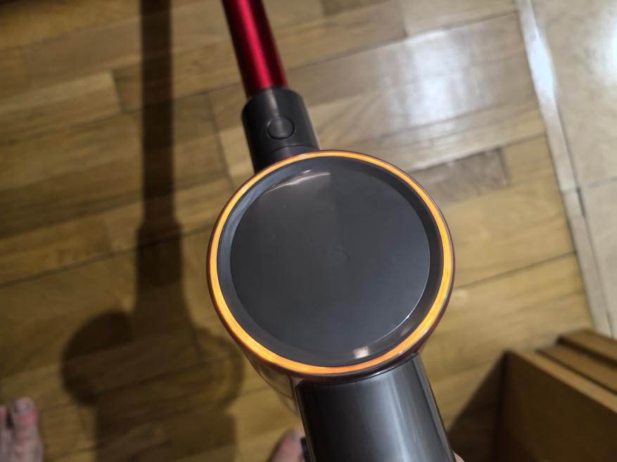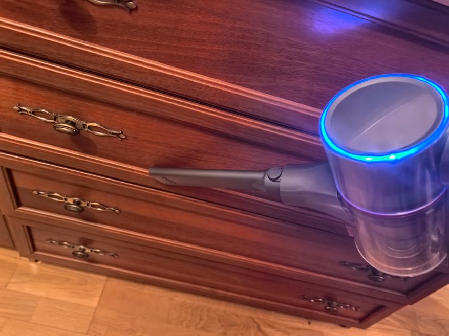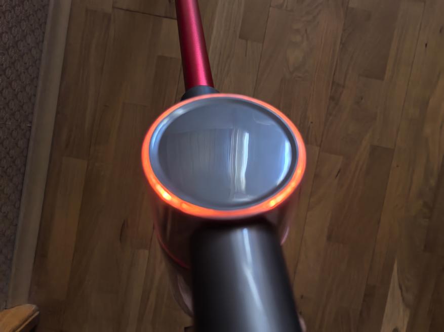 Во время уборки на верхней части пылесоса мигают огоньки. Я подумал, что они символизируют уровень всасывания, степень работы пылесоса, но это ошибка. Они сделаны для красоты. Модель во многом напоминает топовый вертикальный пылесос. У нее красивый вид, но для топовой ей не хватает мощности. Во время уборки на корпусе основной щетки есть световые огни. Это полезное дополнение, которого не хватает в моющем пылесосе Redkey W13 (обзор здесь).