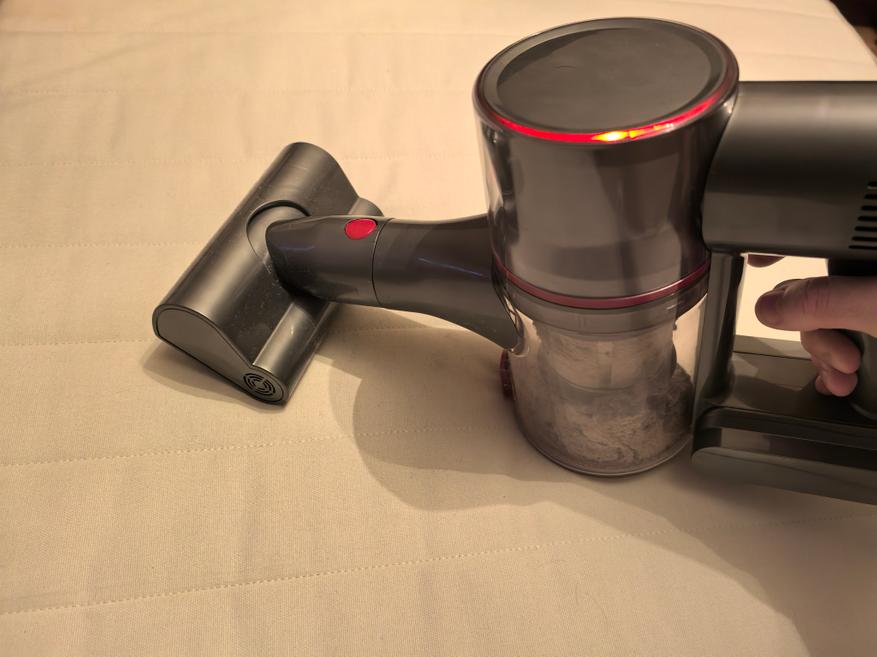 Я попробовал насадку от клещей. Пропылесосил на минимальном режиме матрас. Был, честное слово, удивлен, что там столько пыли и ее можно собрать на минимальном режиме, как показал на первой фотографии ниже. Щелевая насадка хорошо выполняет свою опцию, но ее применение ограничено. Советую всем, если в вашем вертикальном пылесосе есть насадка от клещей, почистить ей матрас сегодня же. Я был приятно удивлен, что на минимальной мощности (которая в два раза меньше максимальной (см. следующий раздел)) смог собрать много пыли. В минимальном режиме вертикальный пылесос может убирать 20 минут.