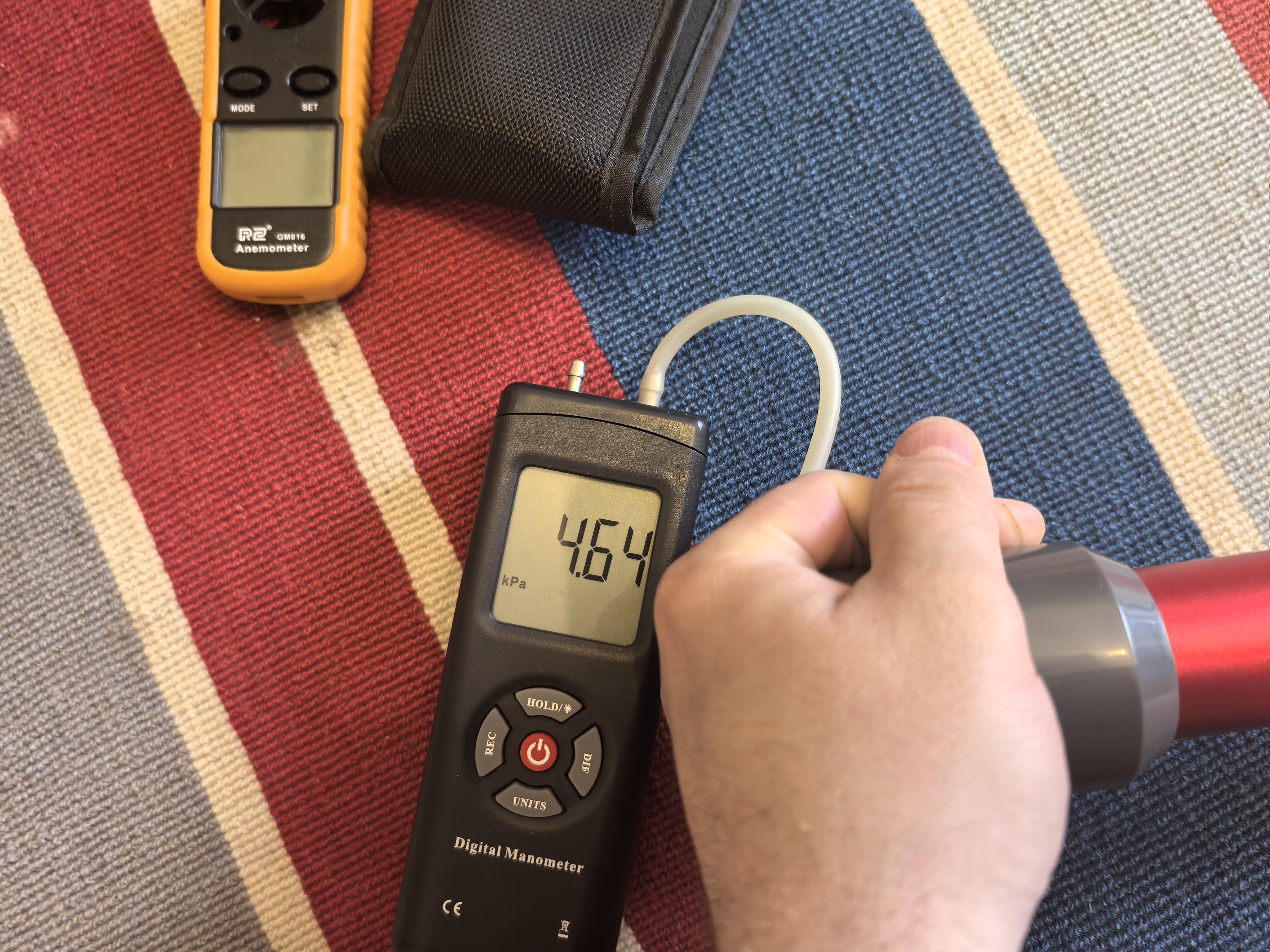 Оценка разряжения проводилась на конце трубки, но при этом большая часть площади была закрыта ладонью. Такой способ соответствует действительности, так как насадка прилегает плотно к полу и надо оценивать разряжение на выходе из сопла. Имеющийся ваккумметр ограничен сверху цифрой в 14 кПа. В обзоре показатель не приблизился к номинальному в устройстве. Цифры получились следующие: