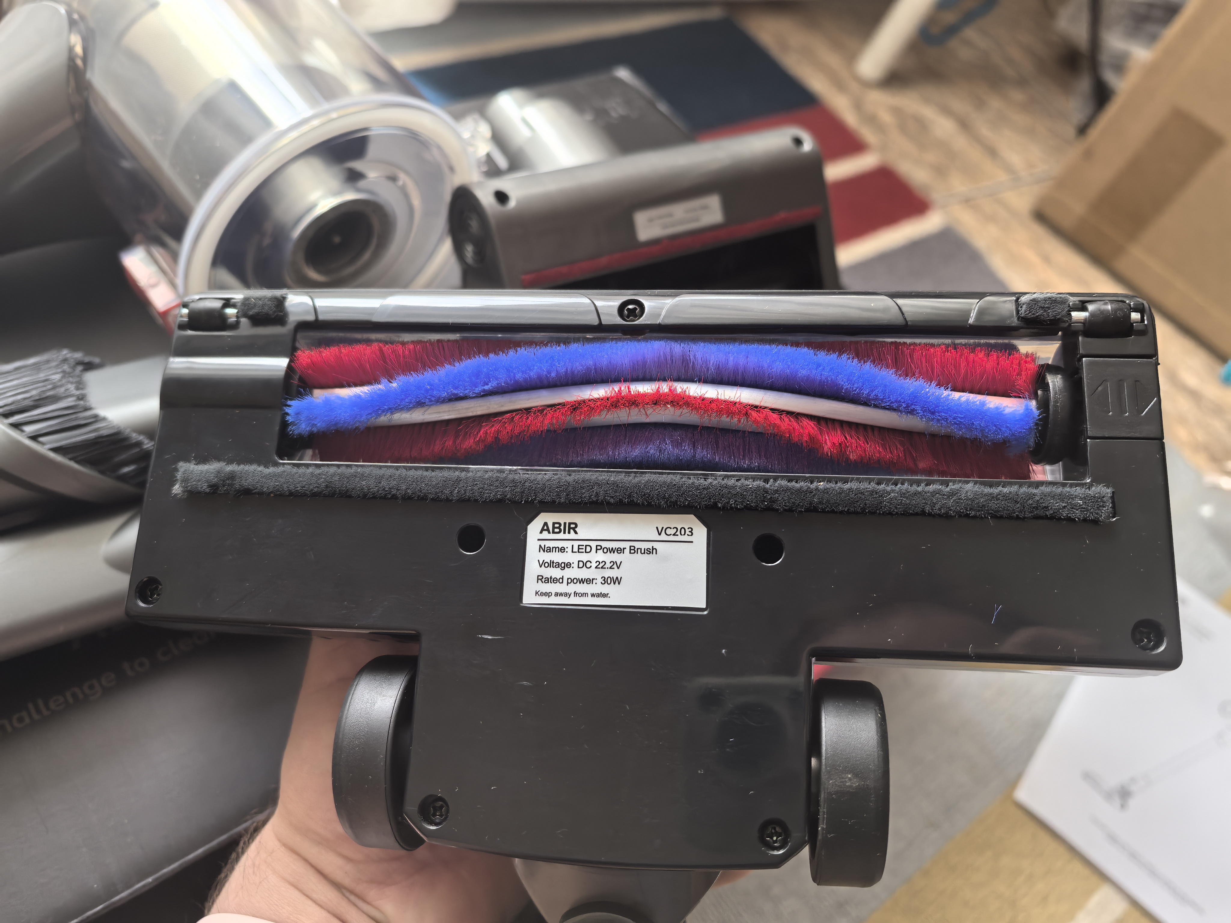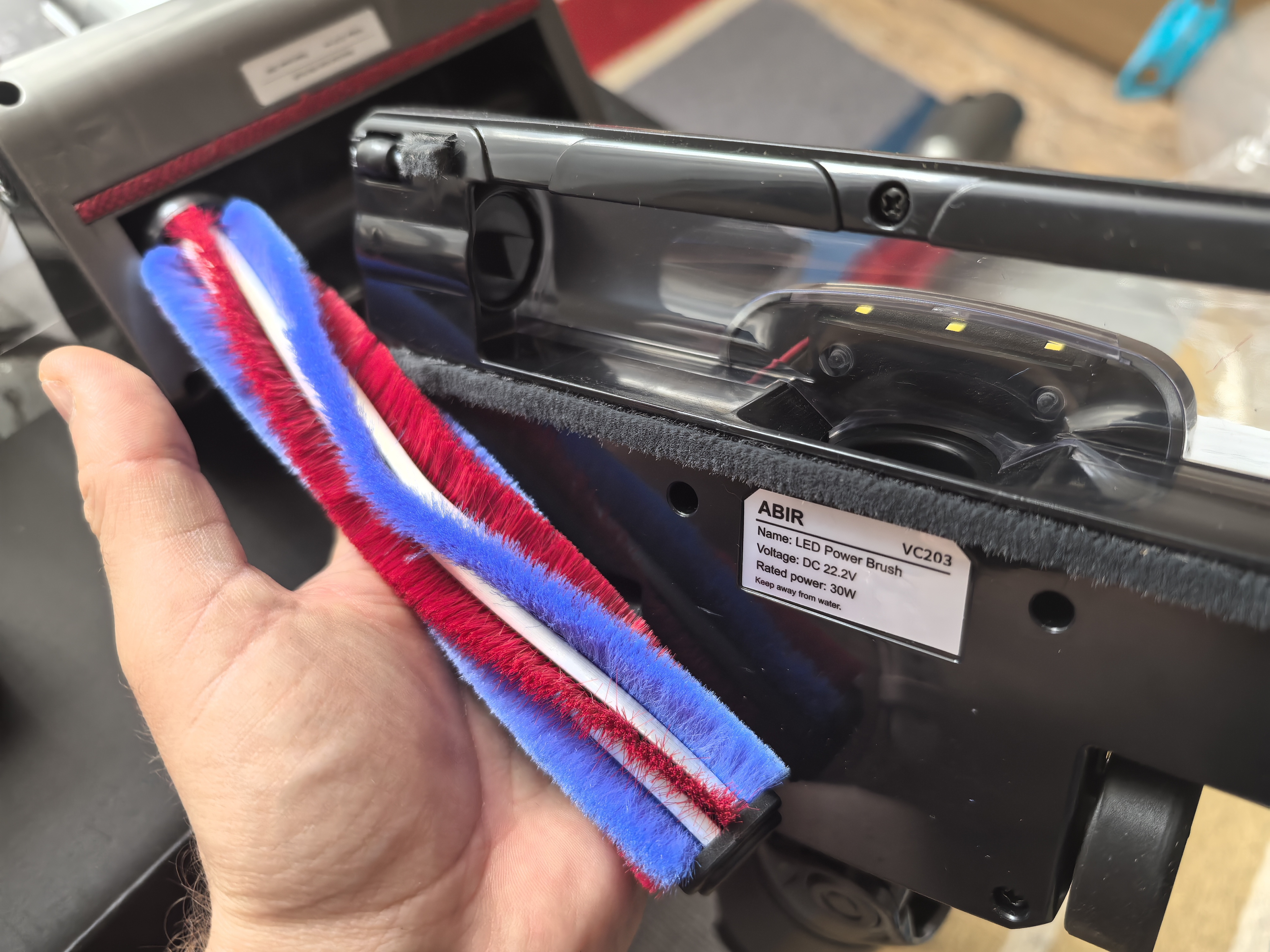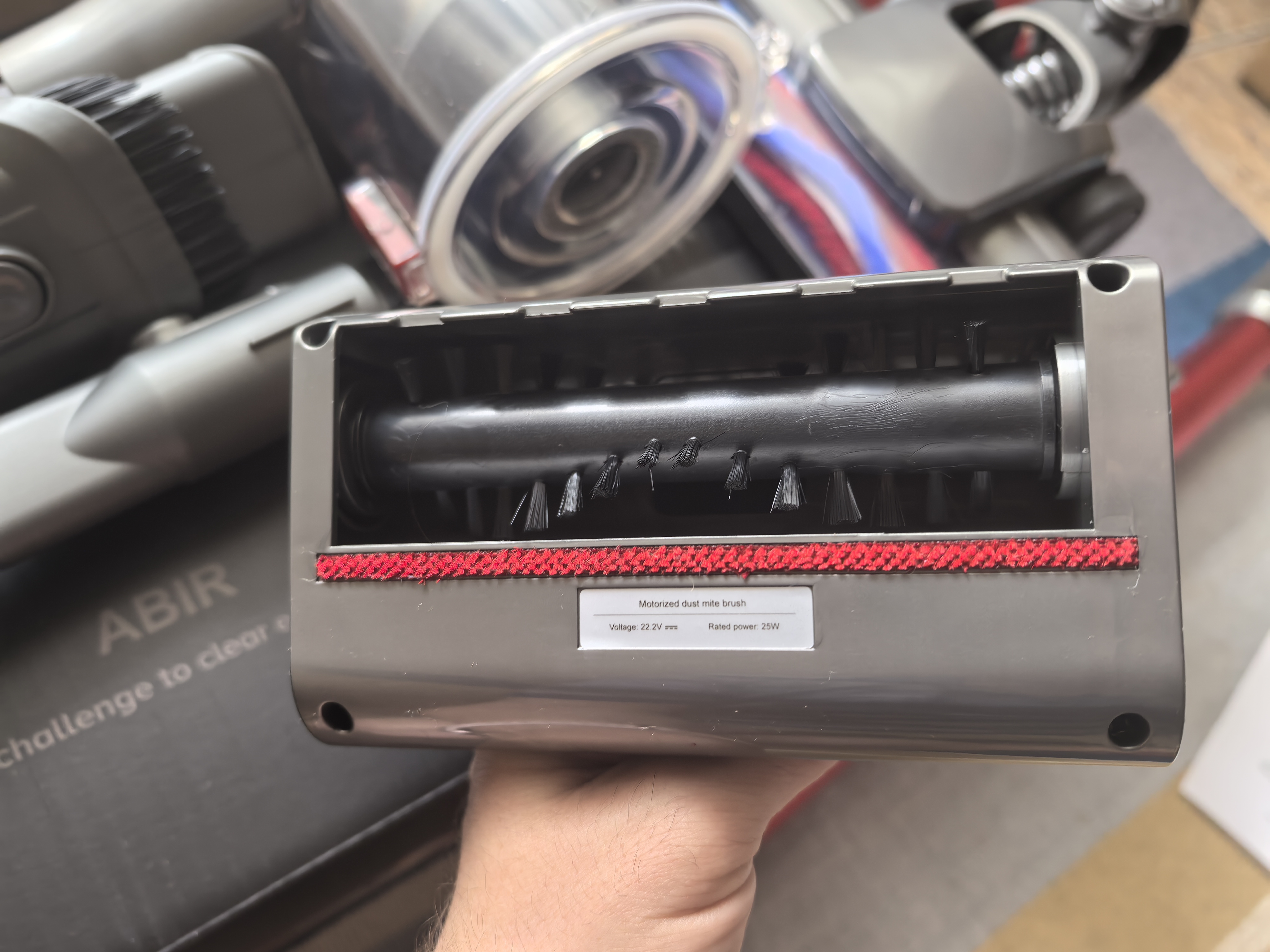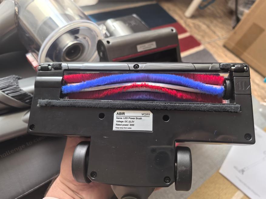 Ниже показаны сменные насадки. Их всего 4 вида: щелевая, основная, для клещей и для деликатных поверхностей. Небольшой валик основной щетки напомнил мне аналогичную в вертикальном пылесосе Redroad X17 (обзор здесь). Забегая вперёд, у VC203 мощность всасывания меньше, чем у X17, который в обзоре я называл достаточно мощным.