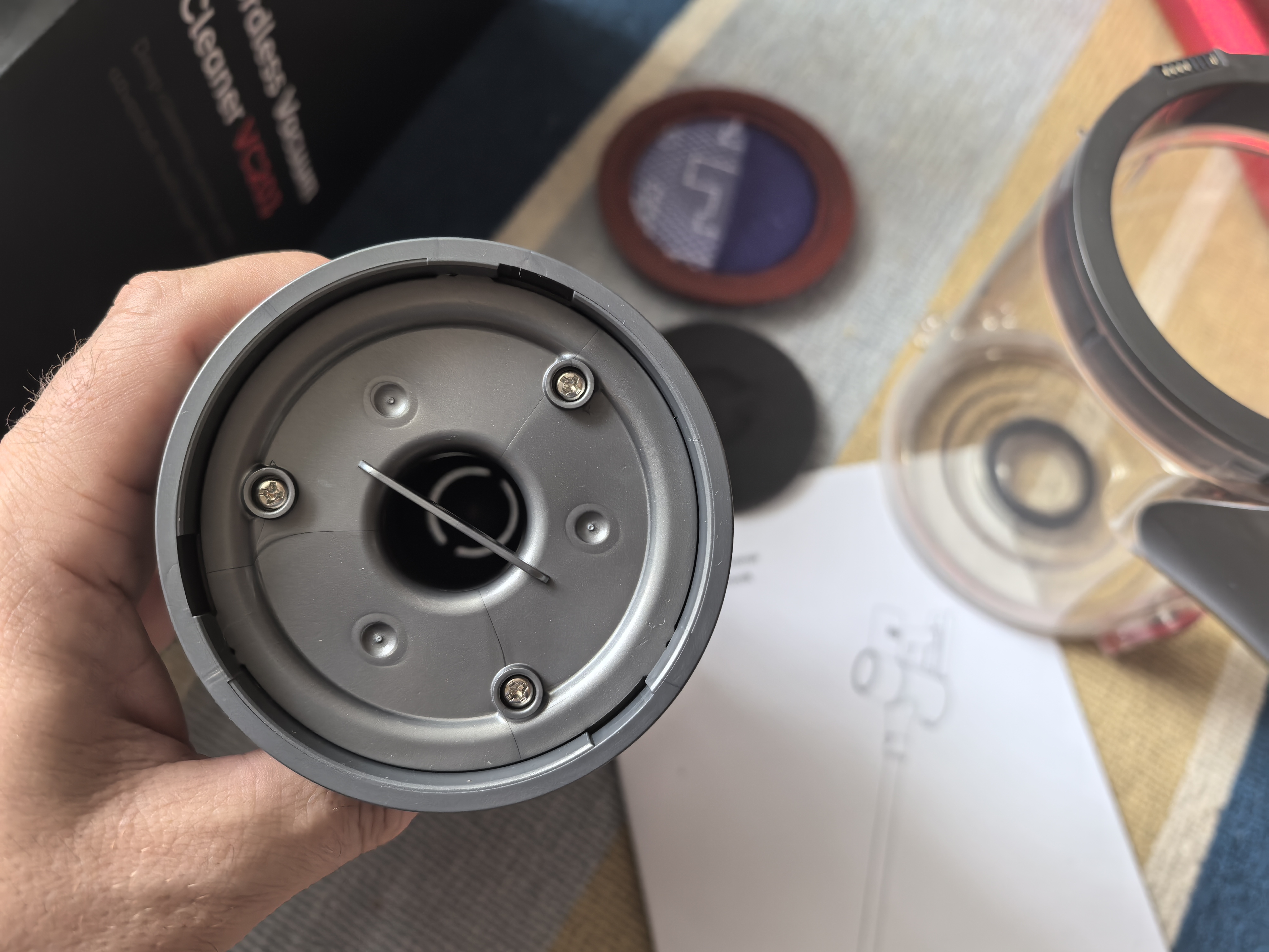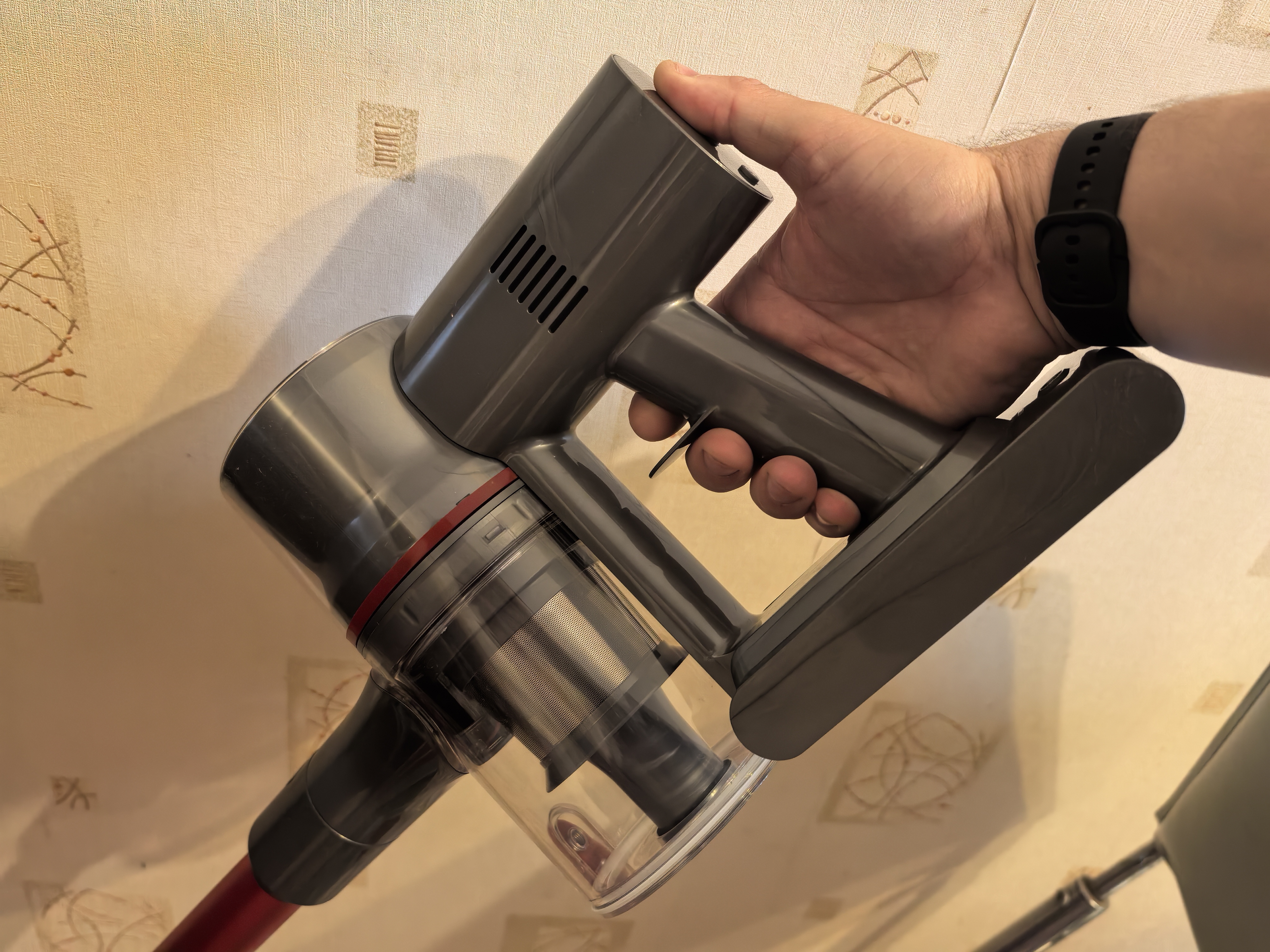 Контейнер для мусора вставляется в основной блок простой фиксацией сверху и при помощи защёлки внизу. В остальных пылесоса я всегда вкручивал его. На второй фотографии показано отсутствие курка включения пылесоса.
