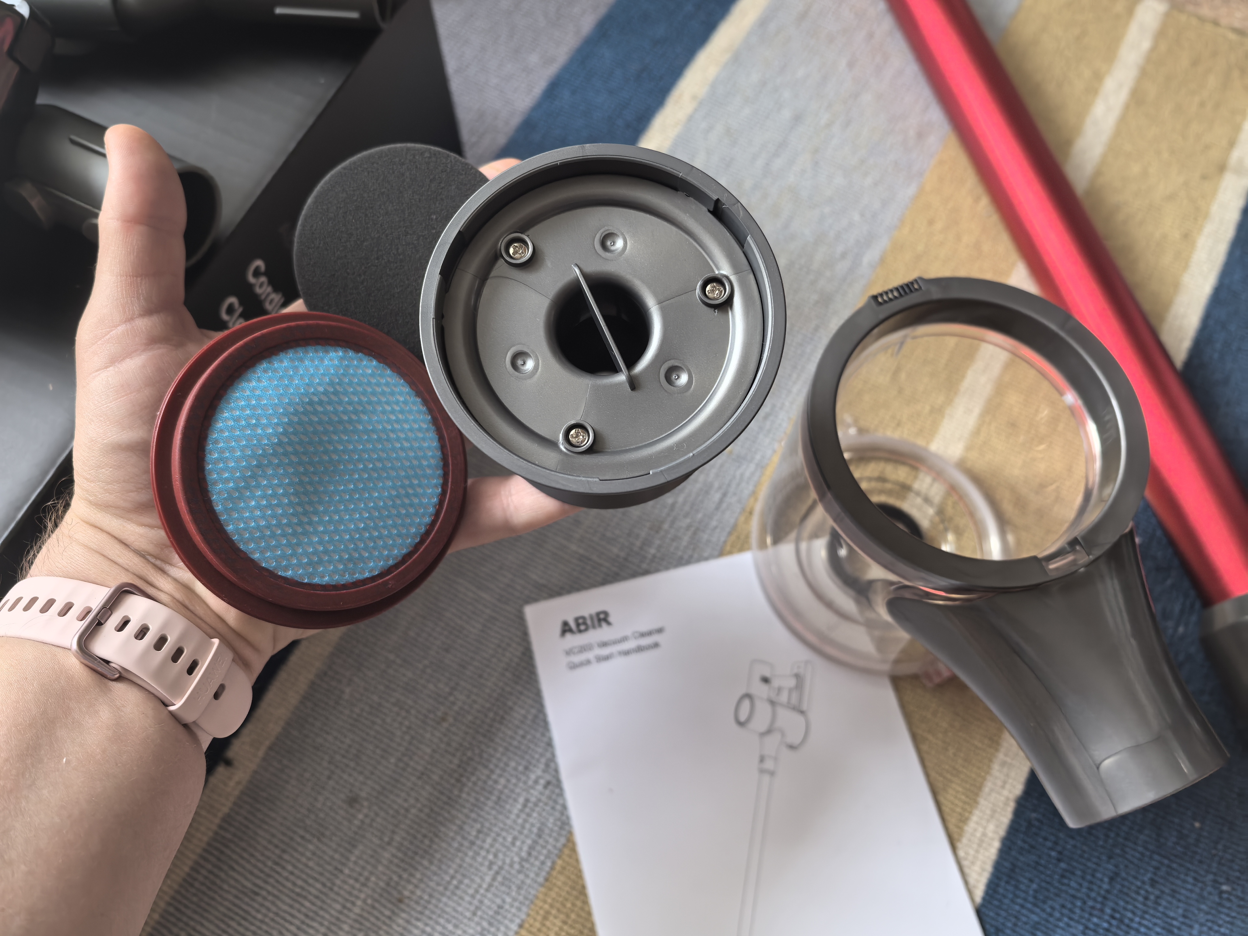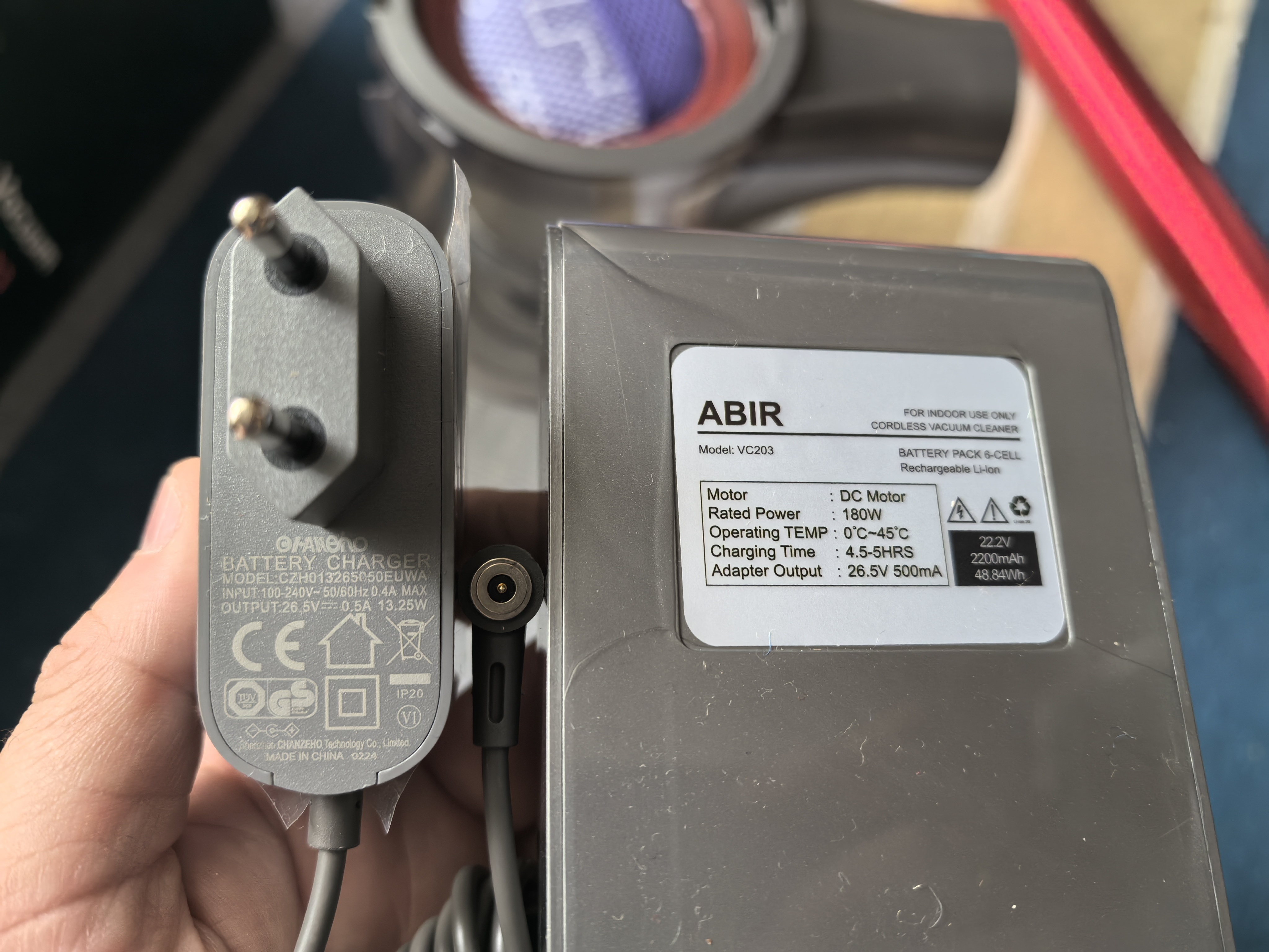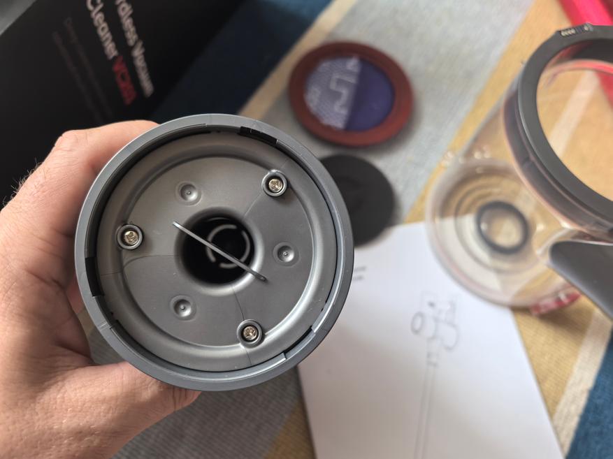 Система фильтрации у вертикального пылесоса состоит из пяти ступеней. Конечно, это не те ступени, как у Redroad V17 (обзор здесь), но само их наличие уже неплохо. Ступени: центробежная скорость, металлический фильтр, циклонный фильтр, НЕРА фильтр, не пропускающий частицы, более 0,3 микрон, и губчатый фильтр у выхода воздуха. Ниже показан отсек для мусора. Она разбирается или снизу-вверх, или сверху-вниз. Такой каламбур выглядит нелепо, но все лучше, возможно, как средство удешевления пылесоса. Сразу обидно, что нет мультициклона, чистить надо будет чаще (но, учитывая небольшую мощность всасывания, такой анахронизм, что нет мультицикдона — чистить надо чаще, не обязательно будет реализовываться в случае VC203). Есть дополнительная прокладка, защищающая НЕРА-фильтр, что тоже неплохо. На третьей фотографии показан зарядный блок, кабель которого имеет магнитный коннектор. Оказывается, Abir VC203 — технологичный вертикальный пылесос!