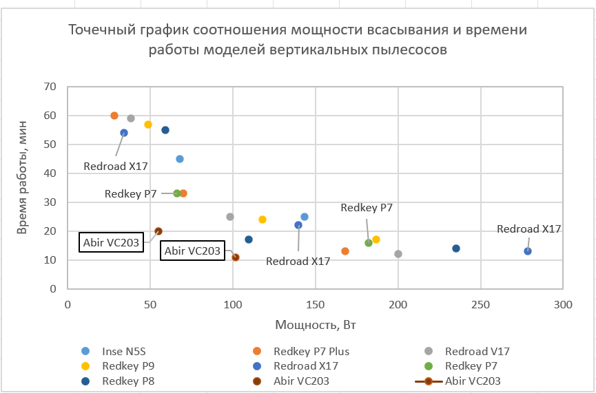 Данный график показывает, где на плоскости находится модель вертикального пылесоса в зависимости от мощности всасывания и времени работы в каждом режиме. Точечный график призван наглядно сравнить модели по: мощности всасывания, времени работы и, косвенно, емкости аккумуляторов (меньшее время работы при сравнимой мощности означает меньшую ёмкость аккумулятора).